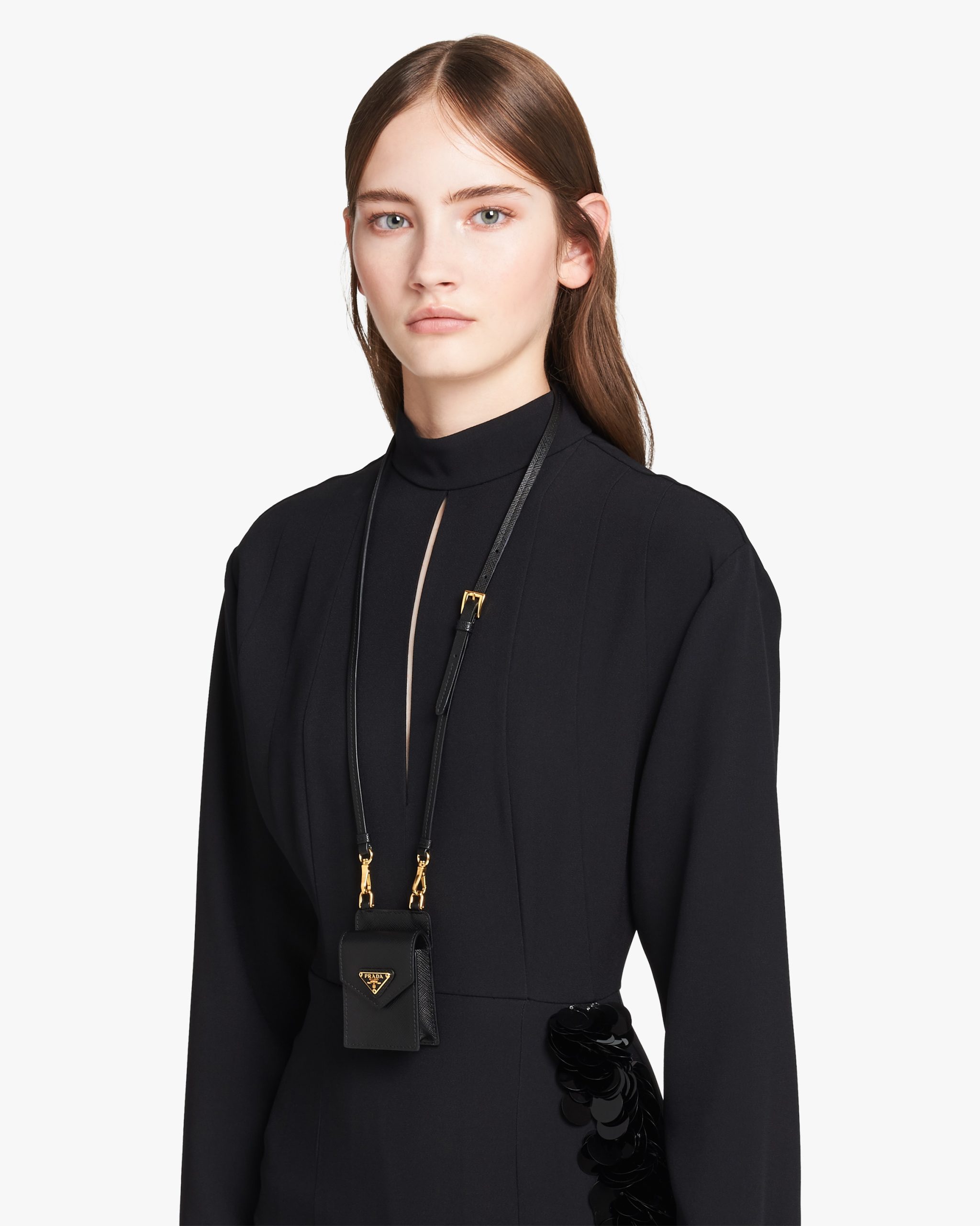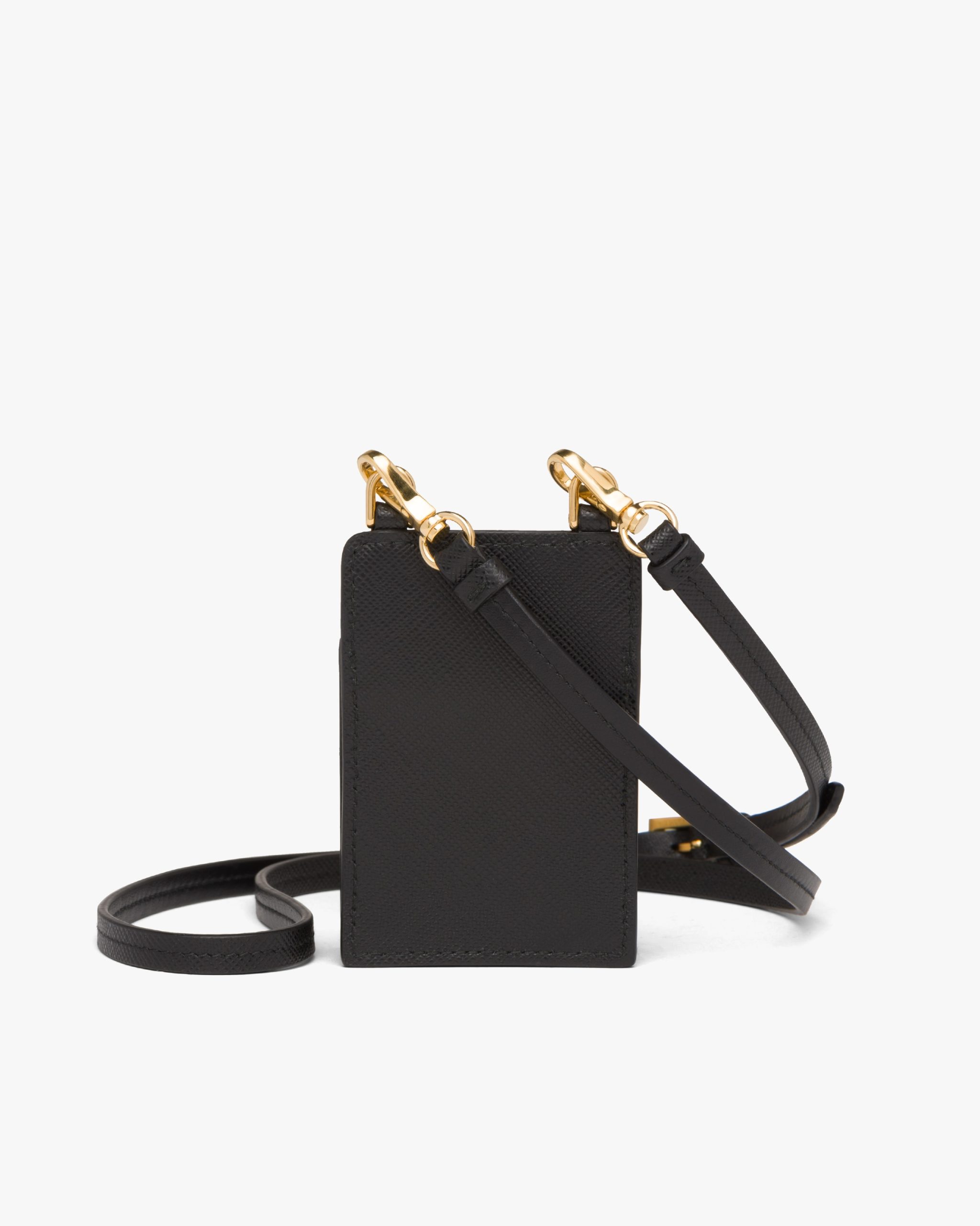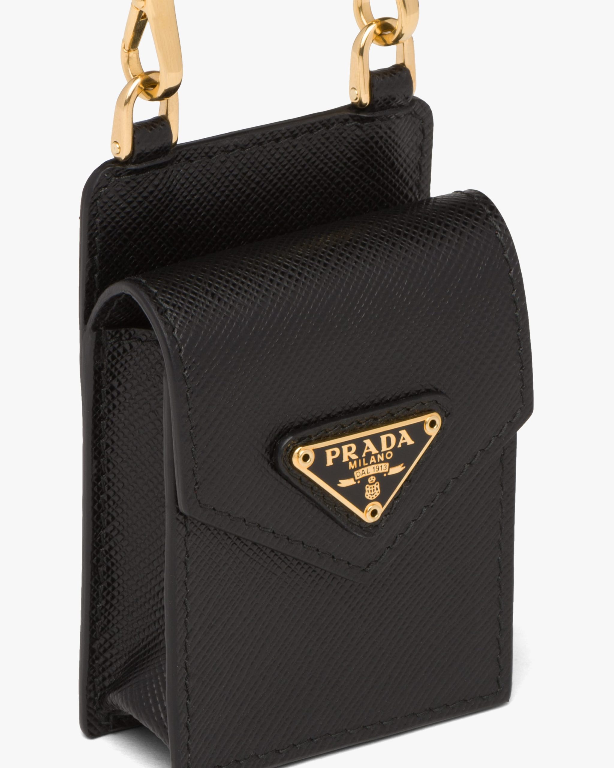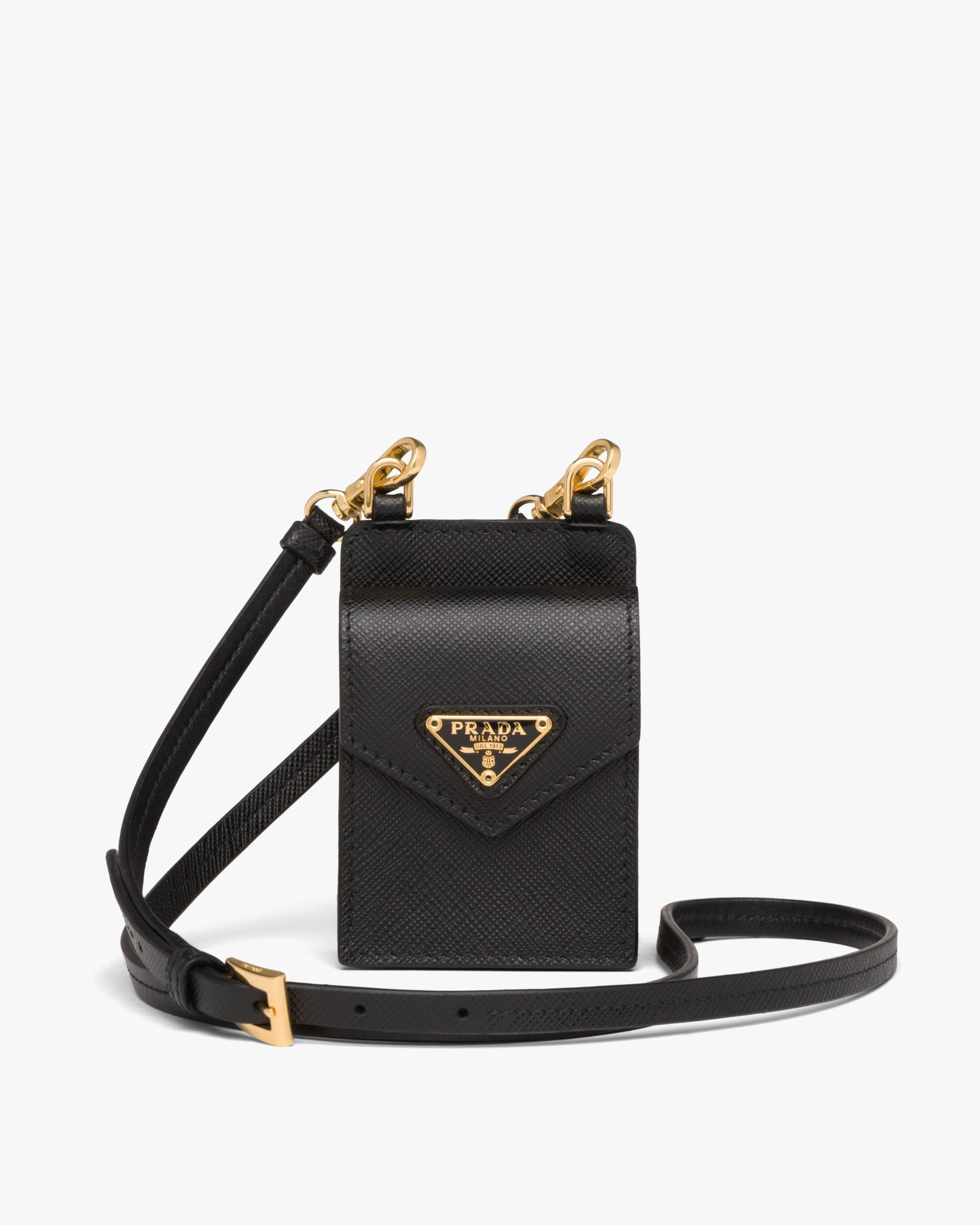 The metal triangle logo2 decorates this Saffiano leather earphone case with neck strap.