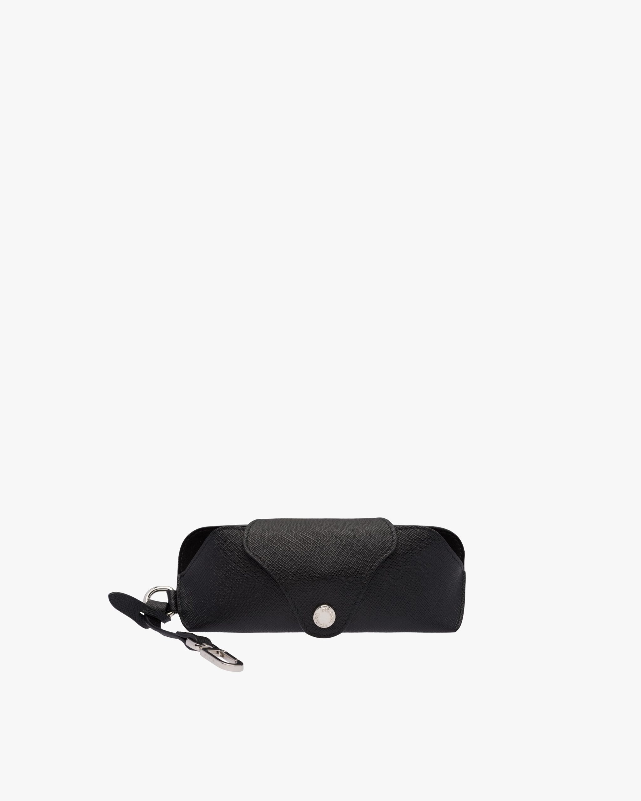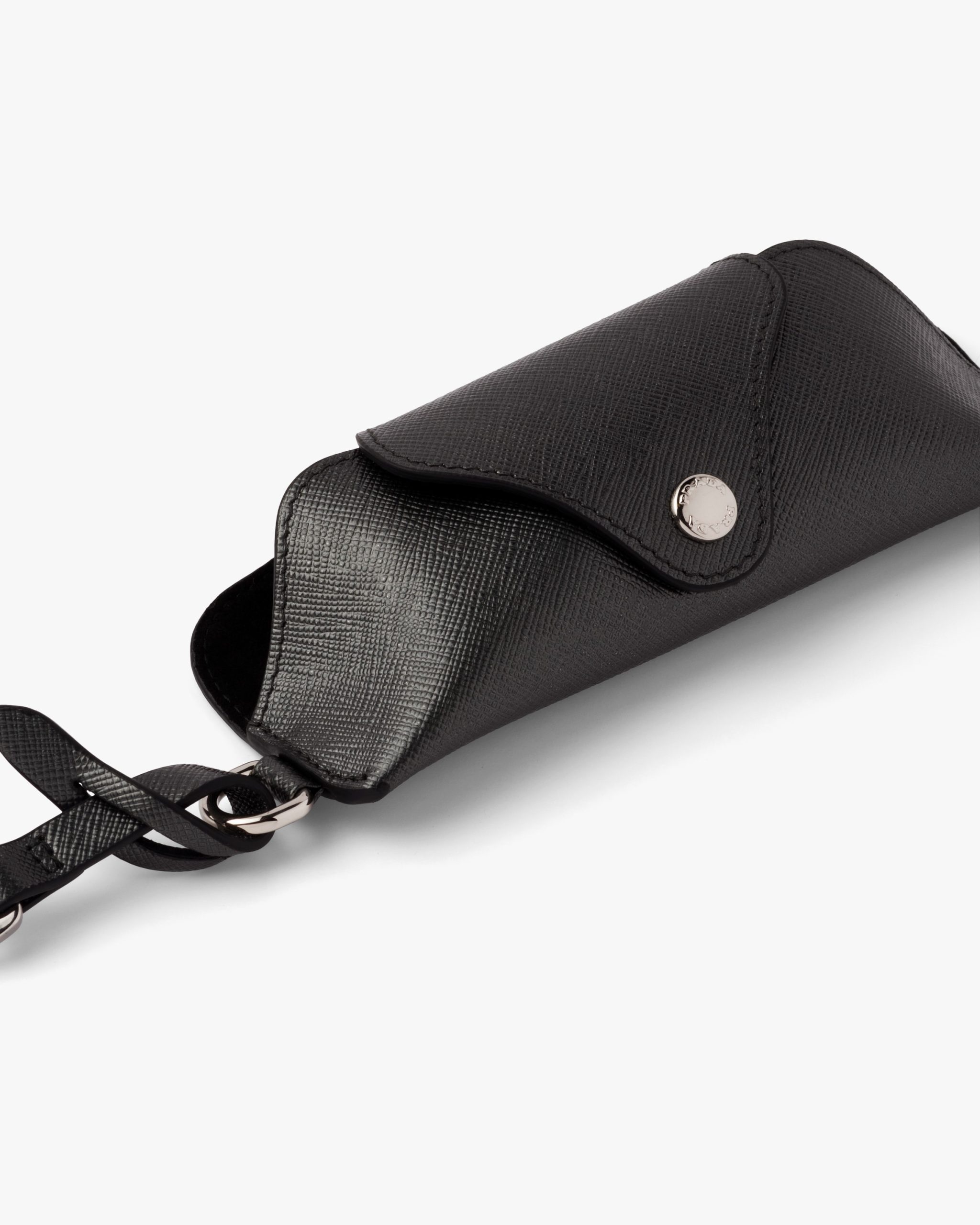A single-color glasses case crafted from Saffiano leather. The curved lines of the strap pair with the steel hardware to create a minimalist yet stylish look. There is a useful loop with hook for attaching to bags.
