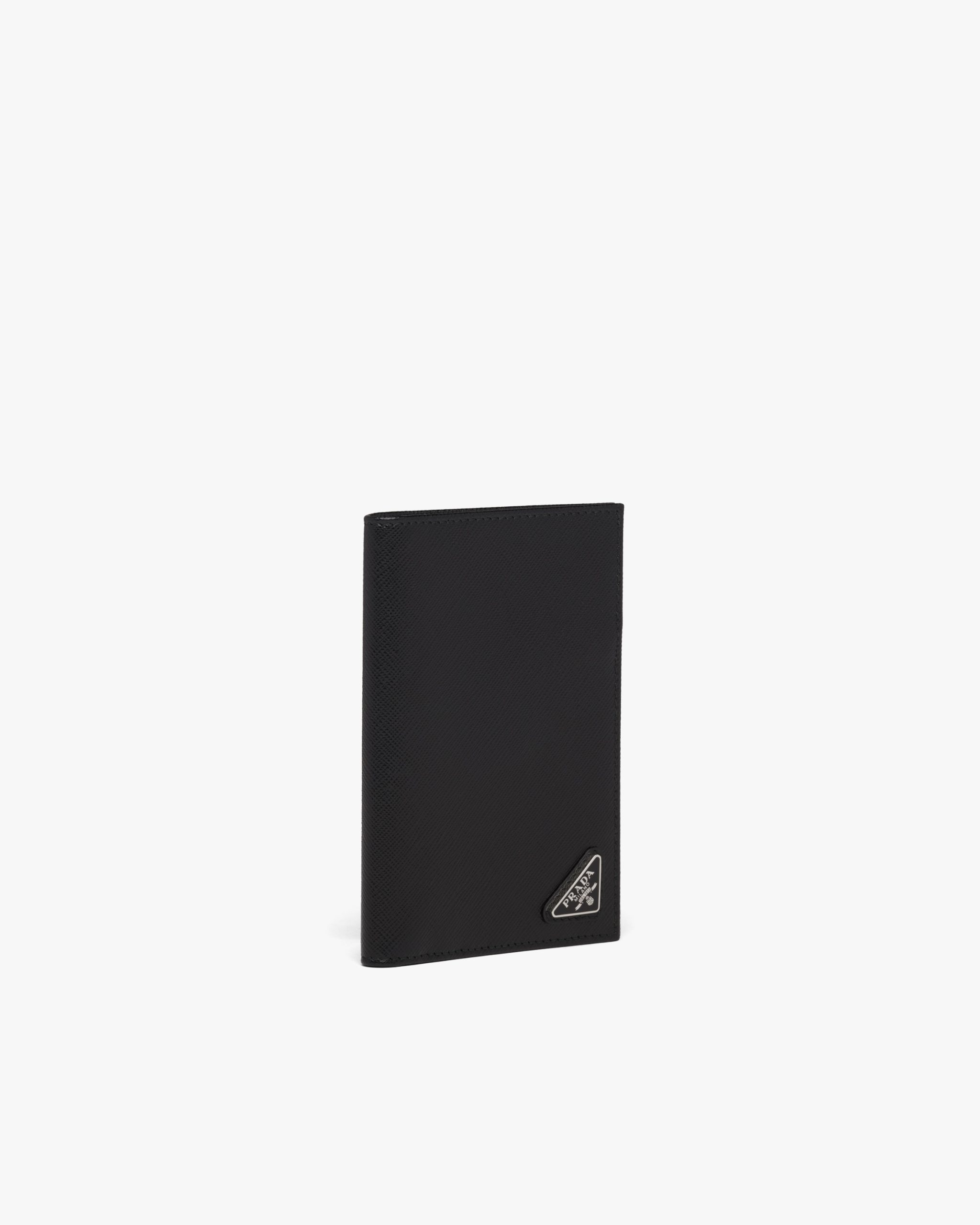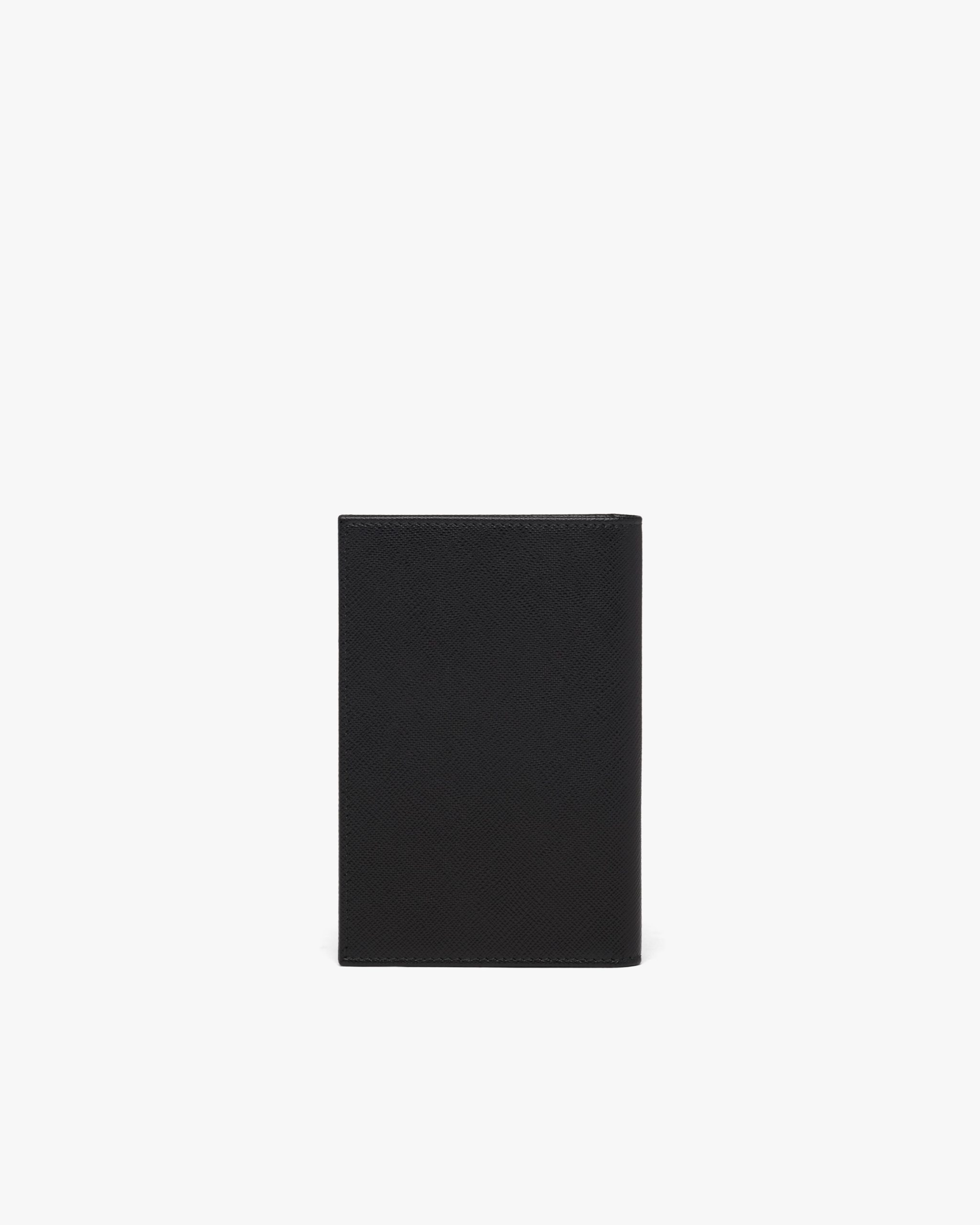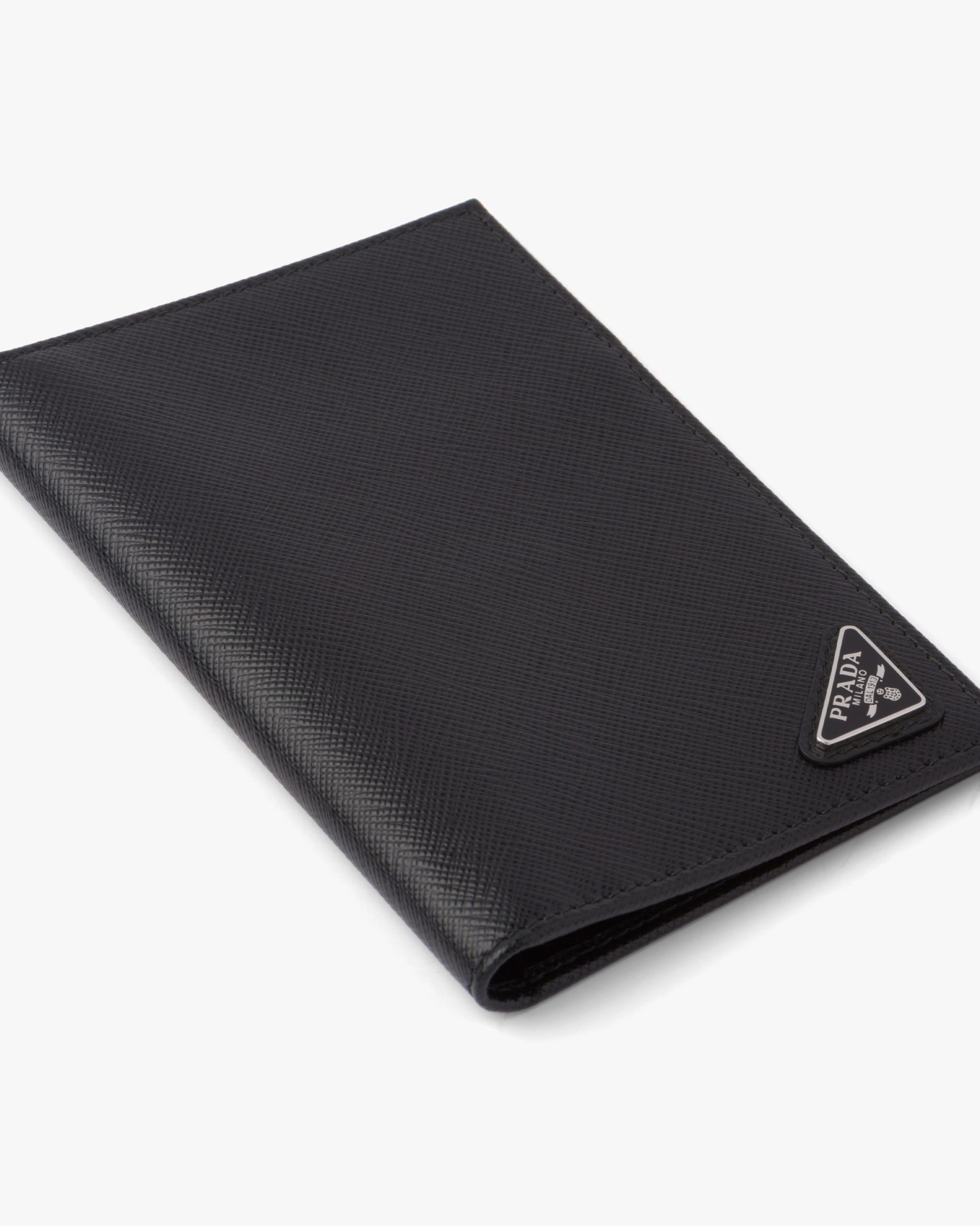 The triangle logo2 first introduced on trunks designed by Mario Prada decorates this passport holder, an accessory that blends modernity and tradition. Saffiano leather, an iconic Prada material with a crosshatch pattern and wax finish, is synonymous with luxury and identifies with traditional Italian leather goods production.