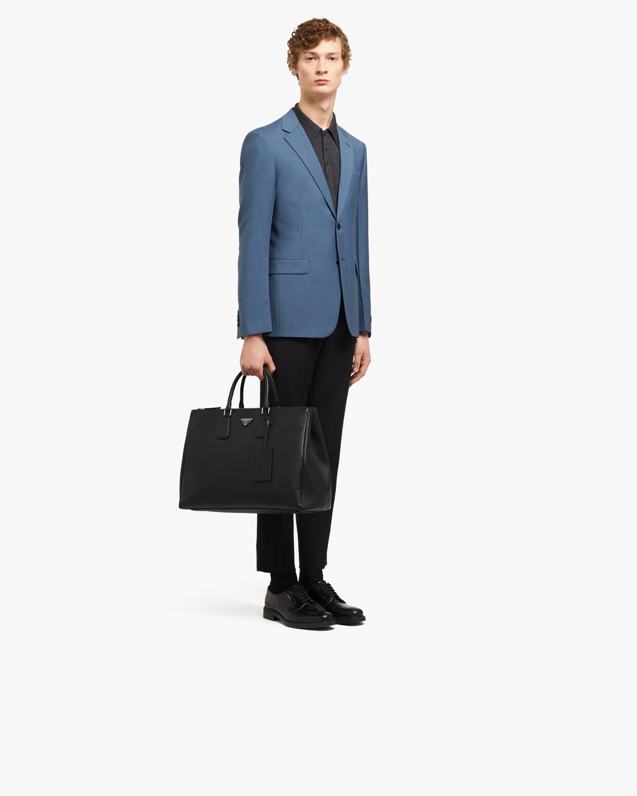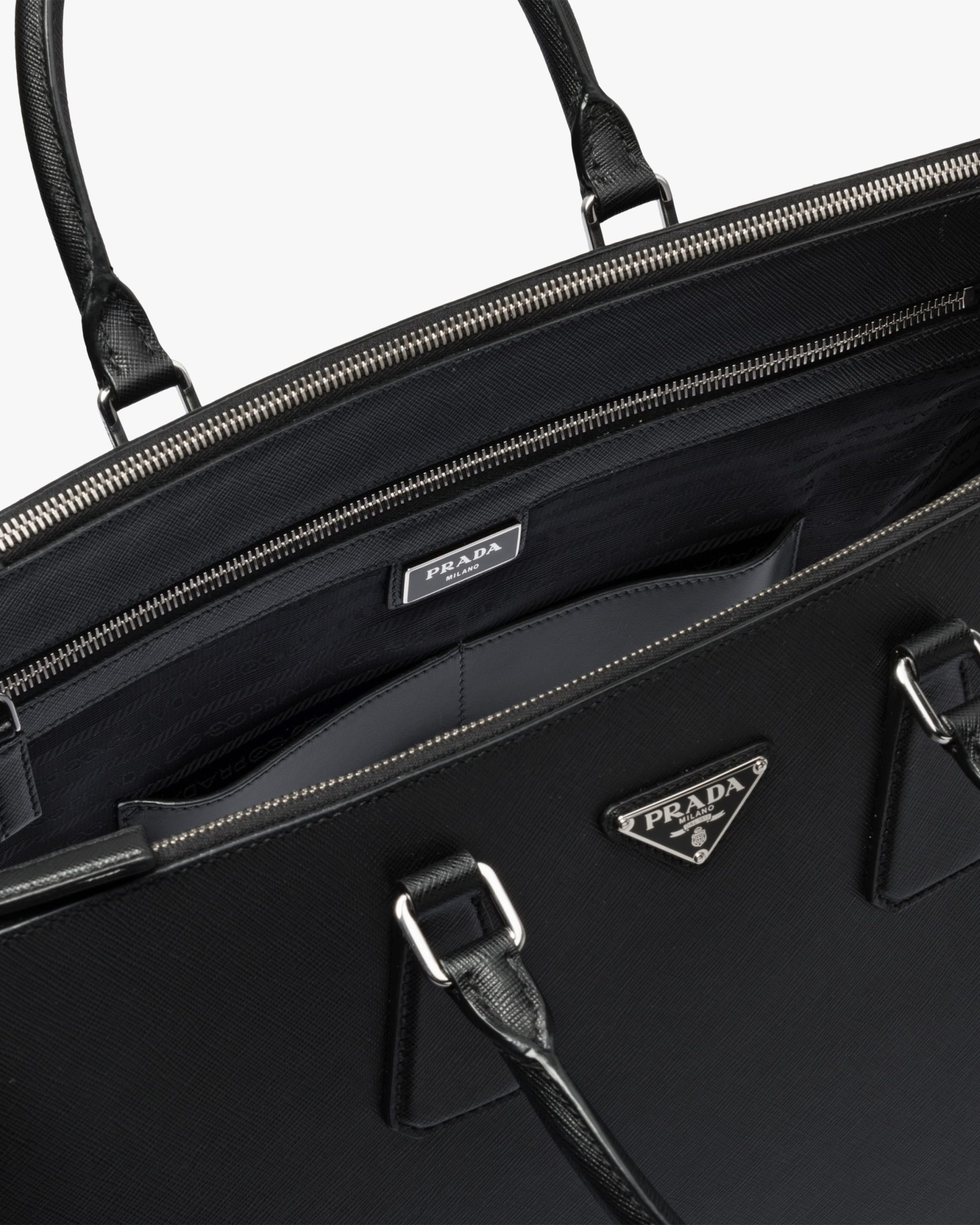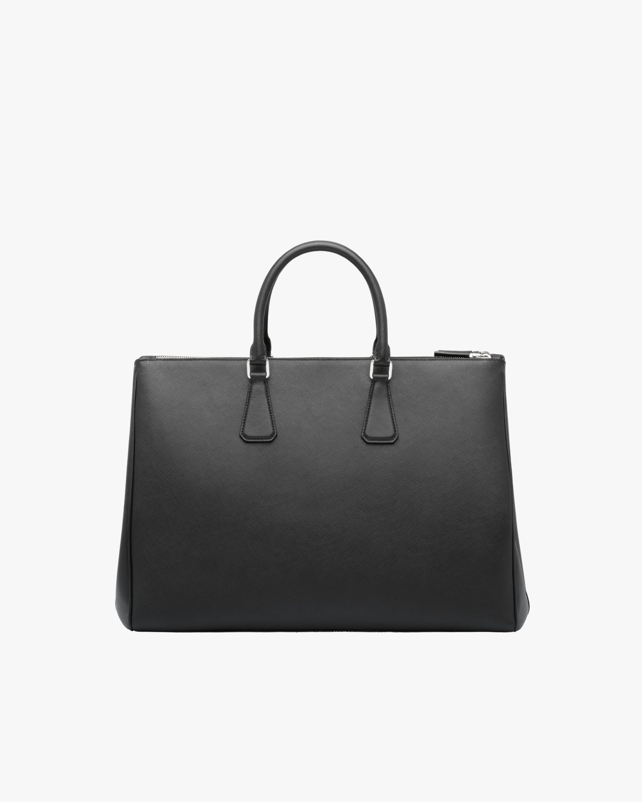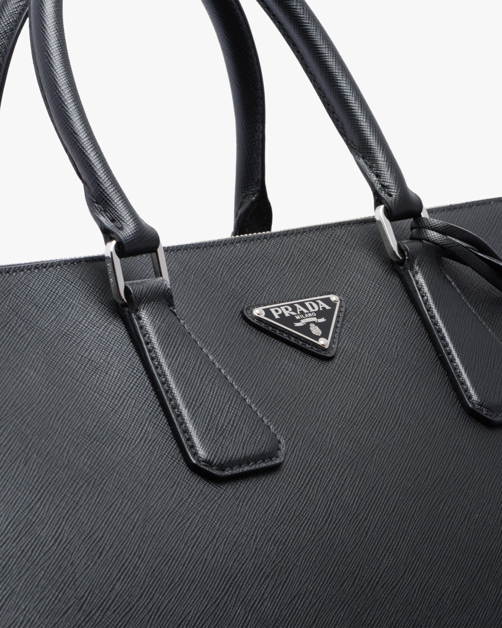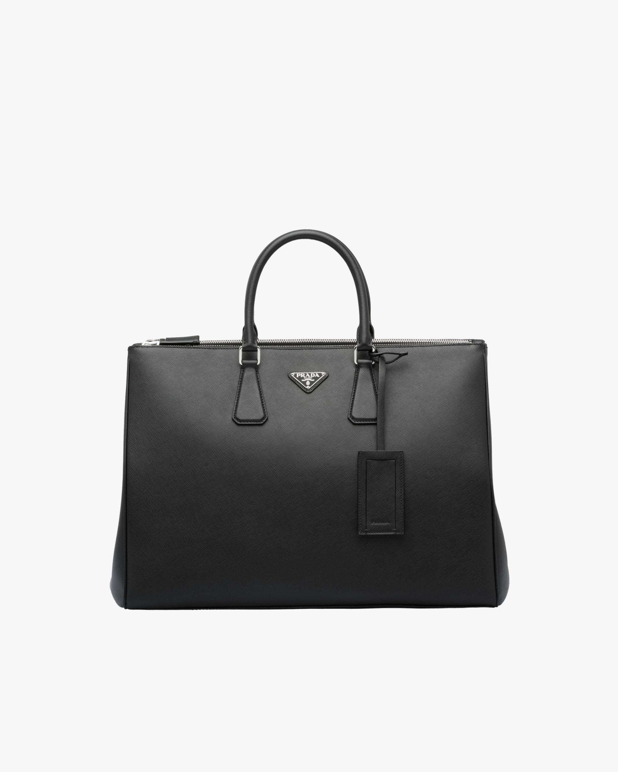 Elegant Prada Galleria Saffiano leather bag with detachable nylon shoulder strap, two top handles and zipper closure. The enamel triangle logo2 on the front decorates the bag.