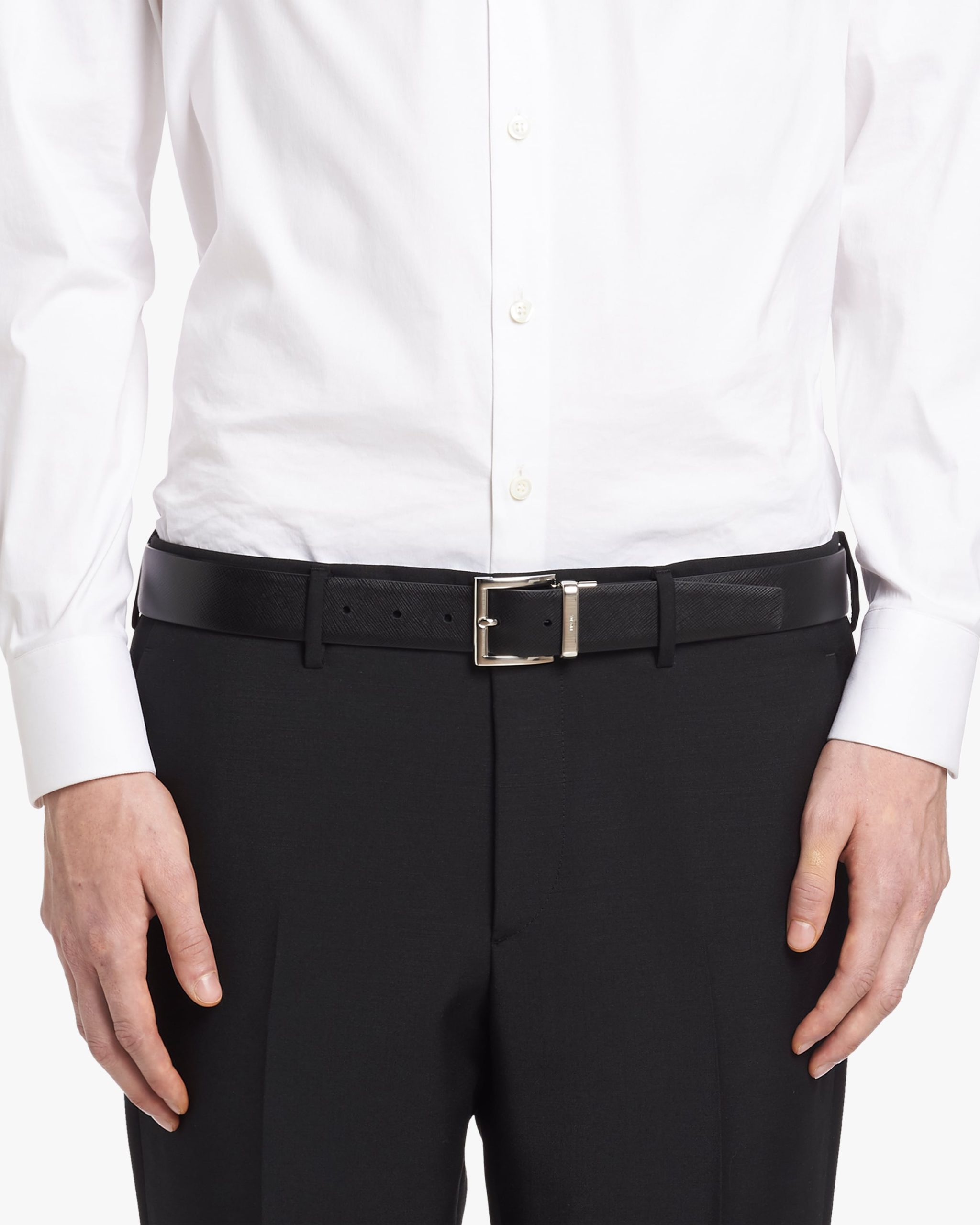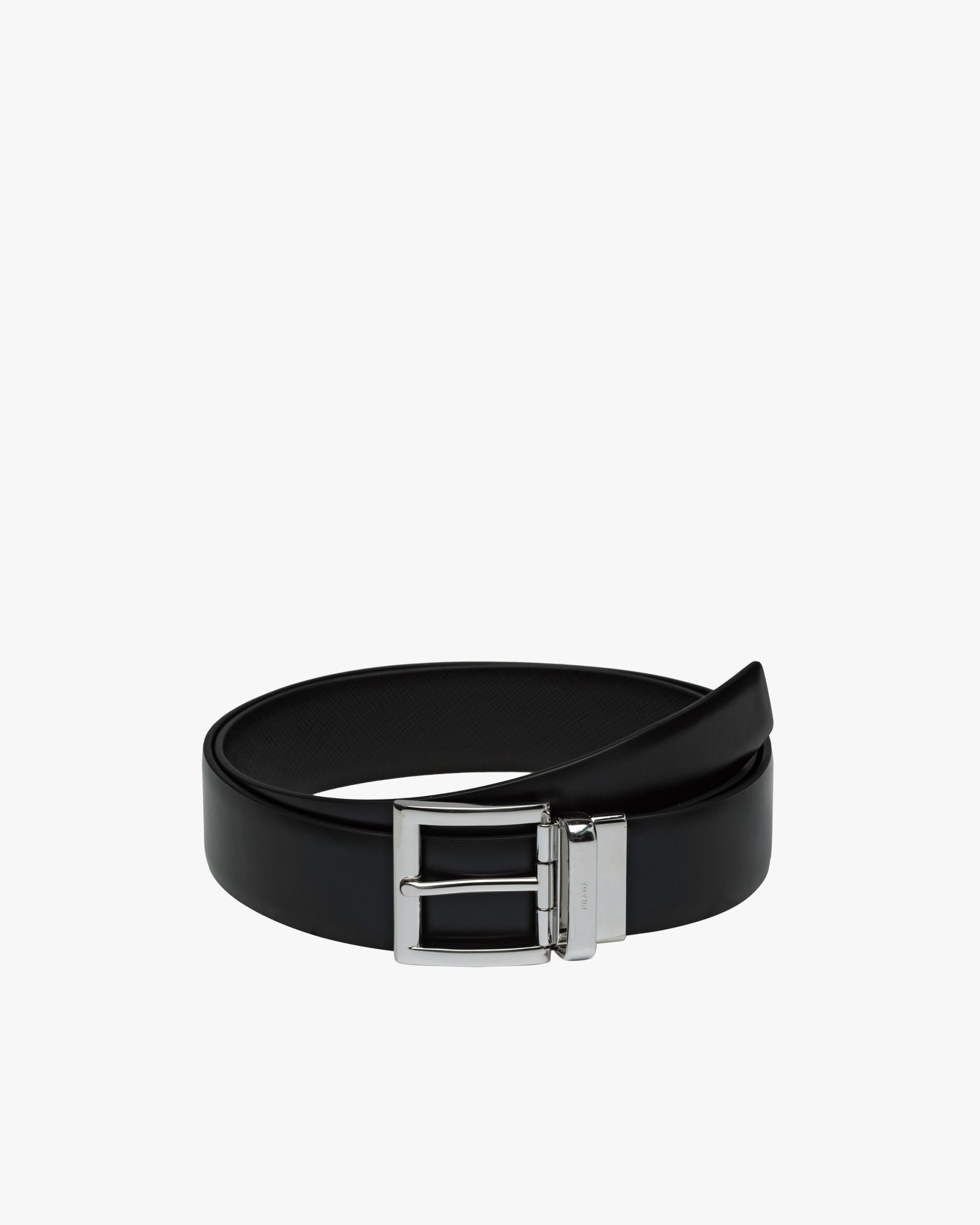 With cross-hatch Saffiano leather on one side and smooth calf leather on the other, this belt can be reversed for different texture effects. The polished steel buckle is branded with the Prada logo2.