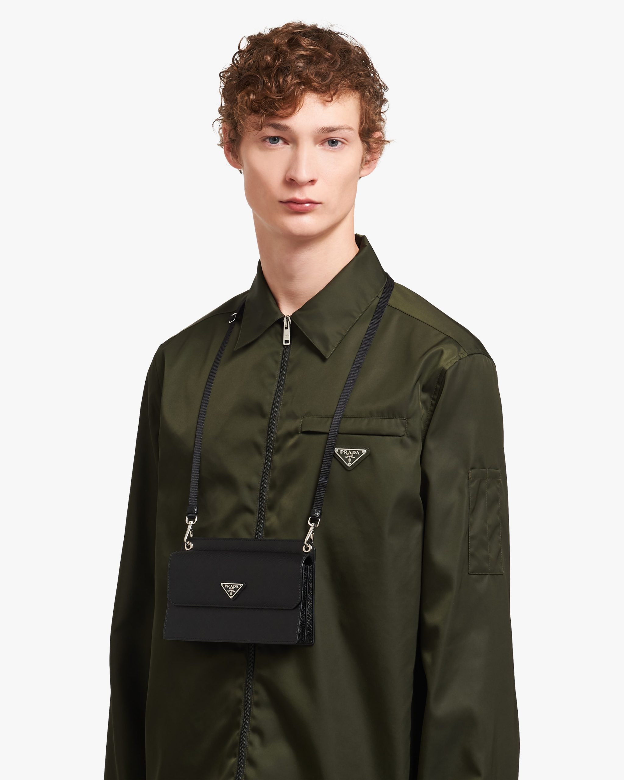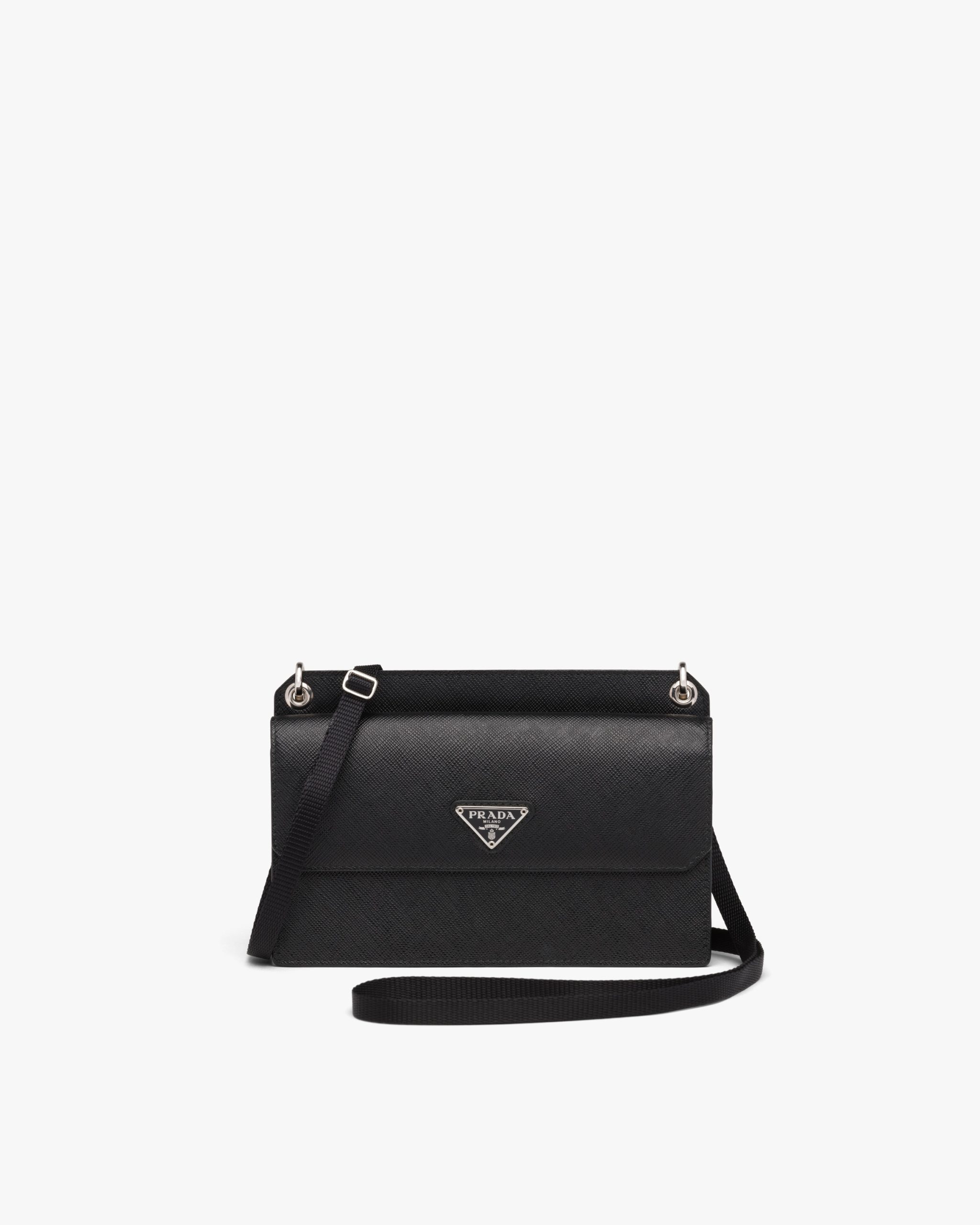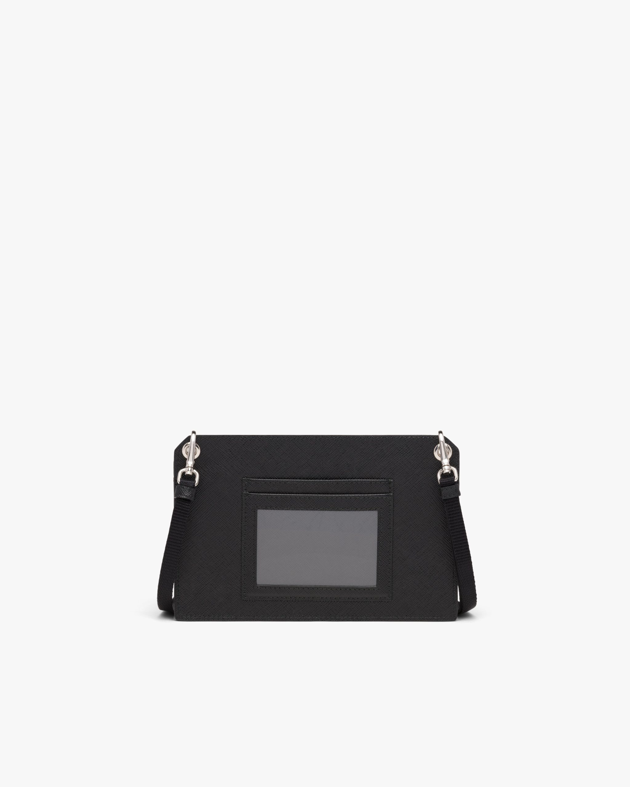 This Saffiano leather cellphone case with leather shoulder strap has a sleek design. The details and metal triangle logo2 on the front illuminate its lines.