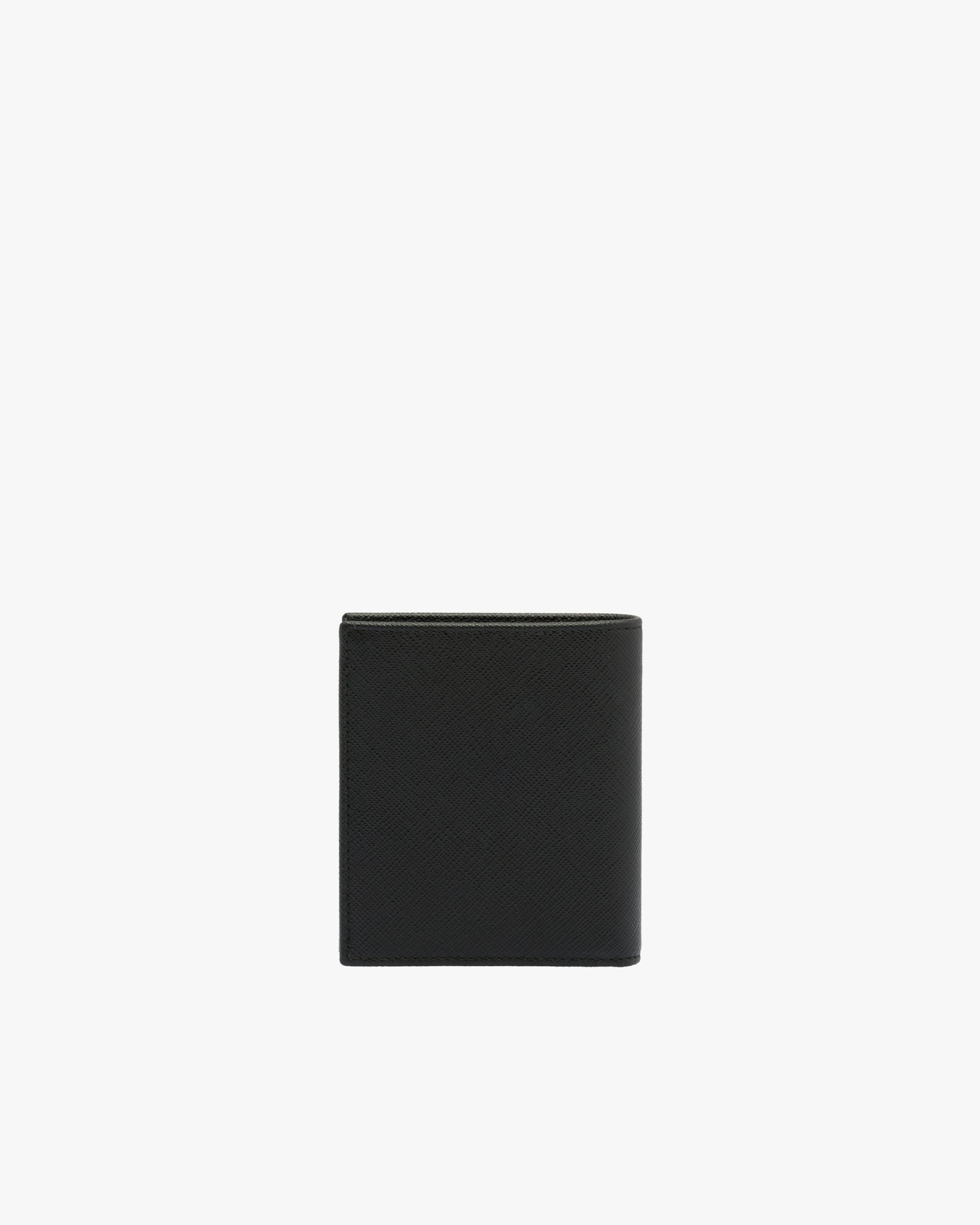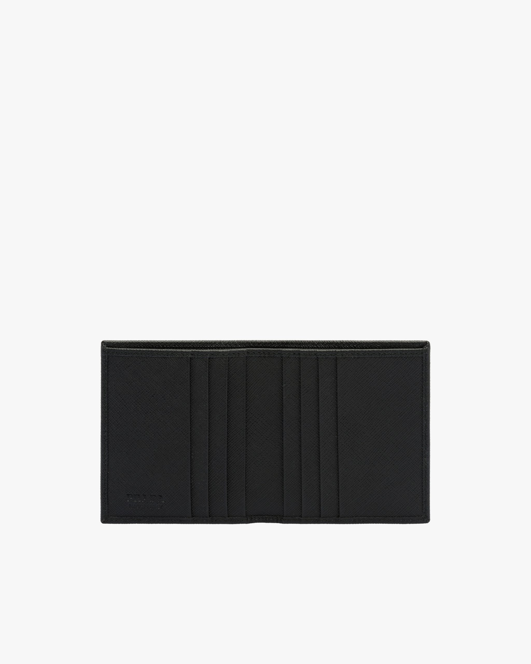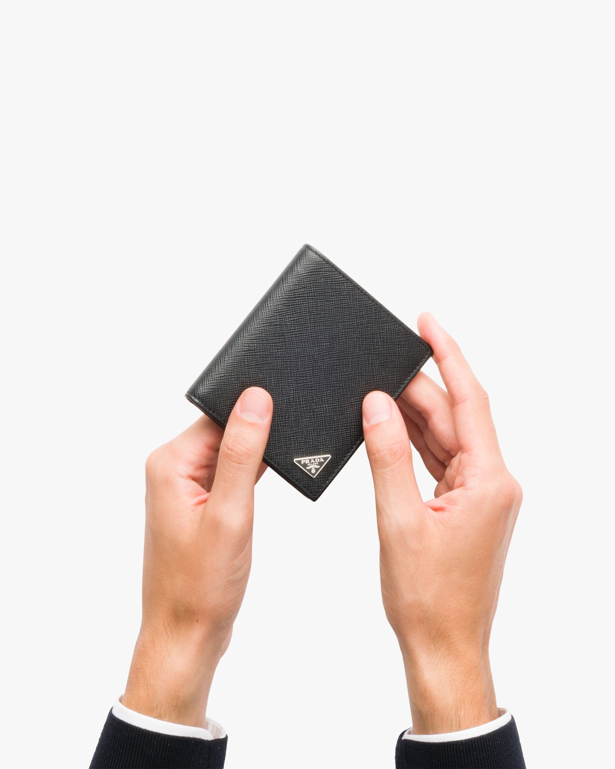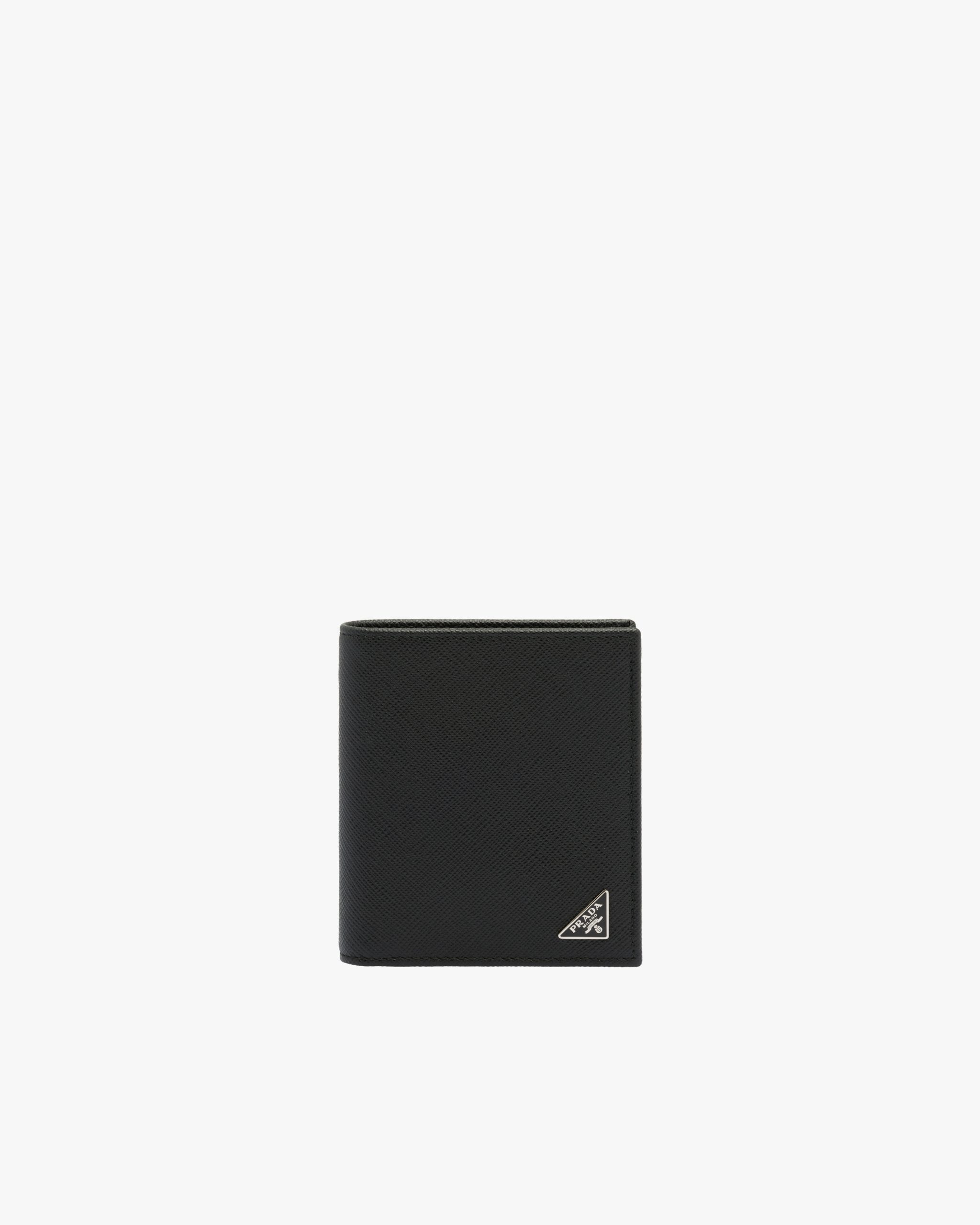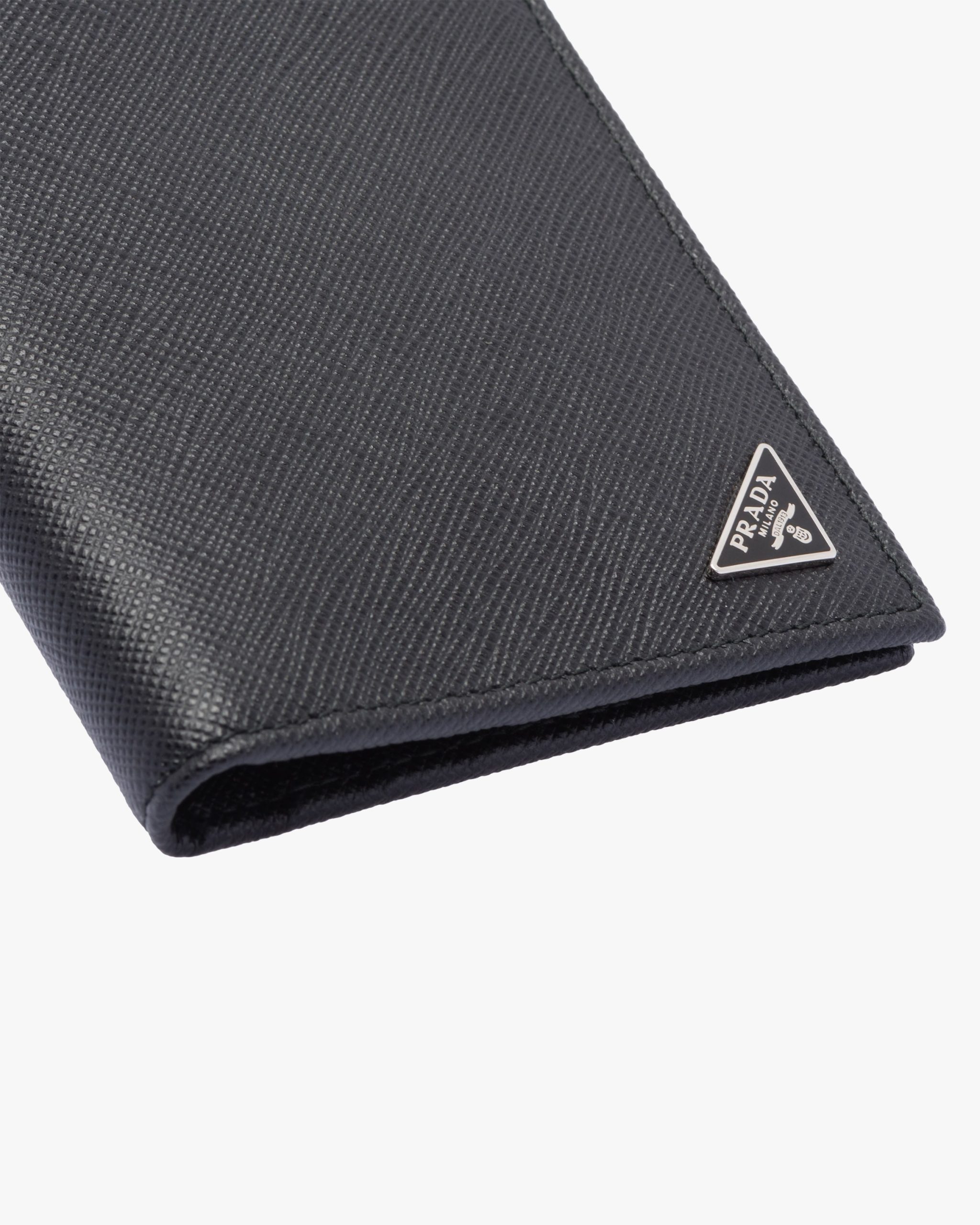 This elegant Saffiano leather wallet is decorated with the enamel triangle logo2. It has two pockets, one bill compartment and eight card slots inside.