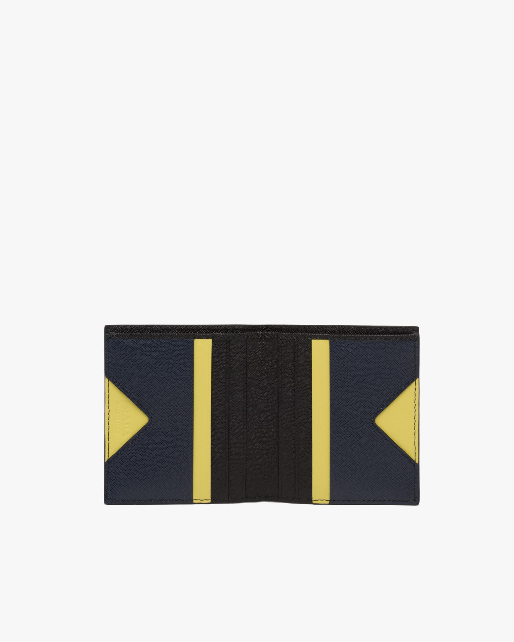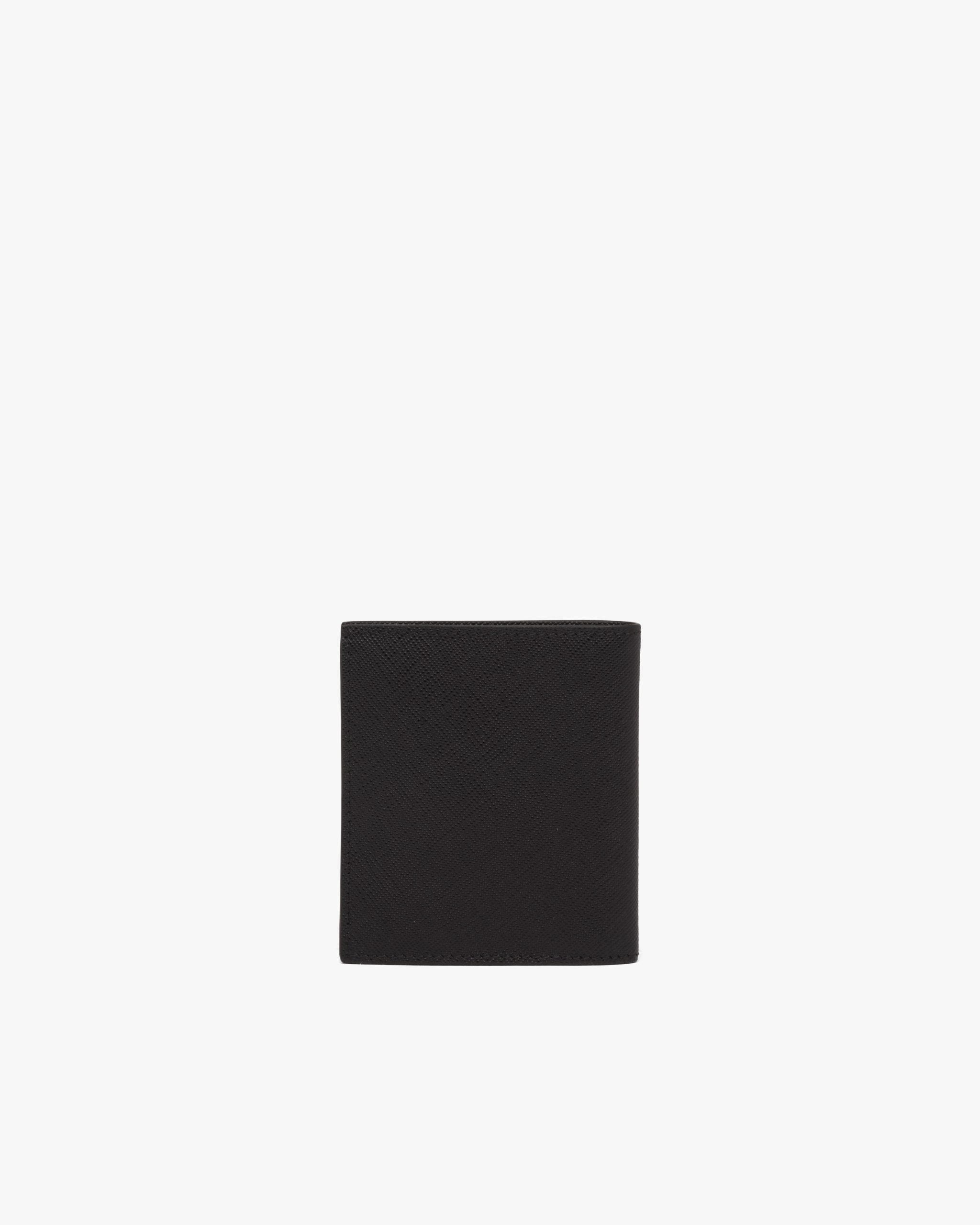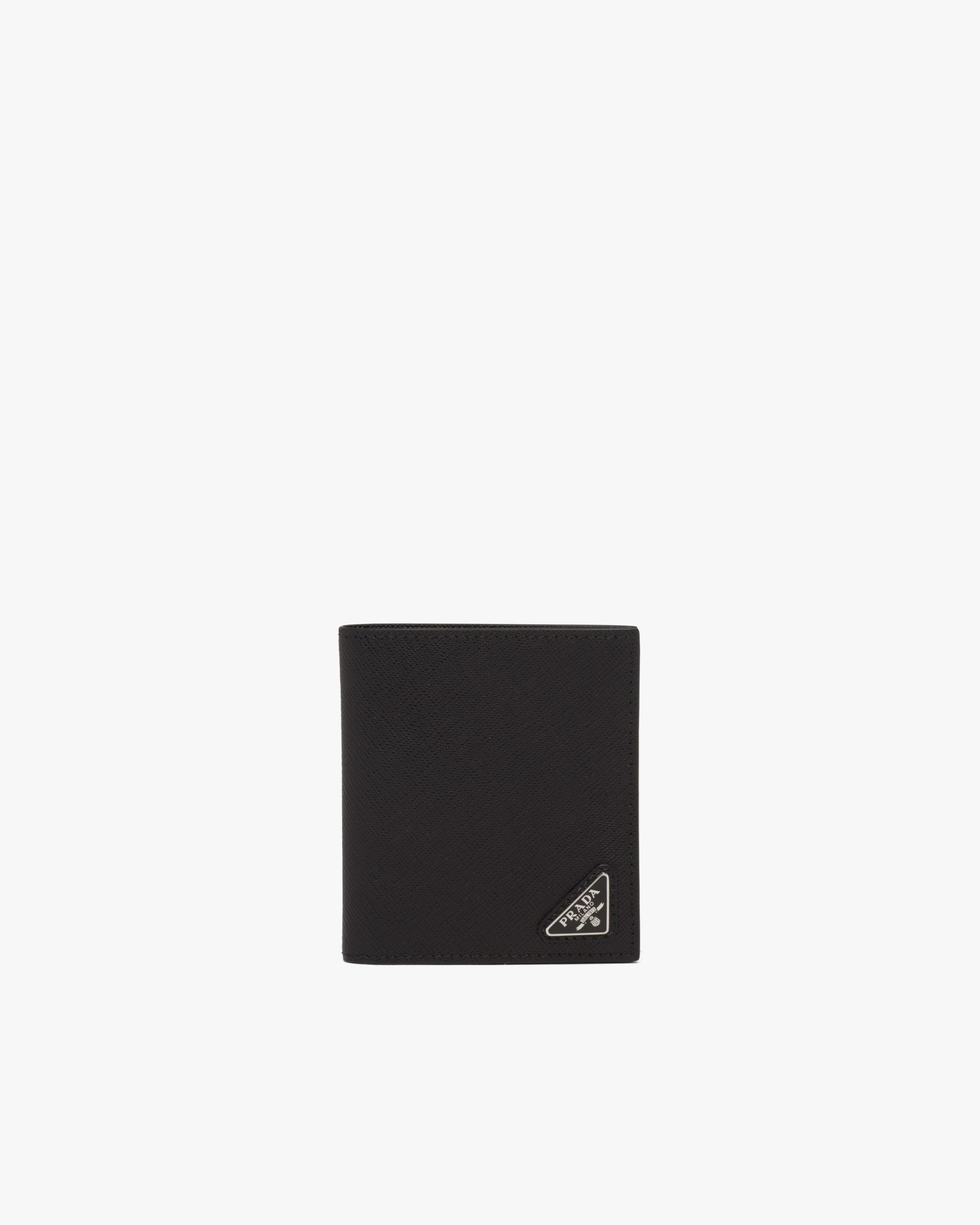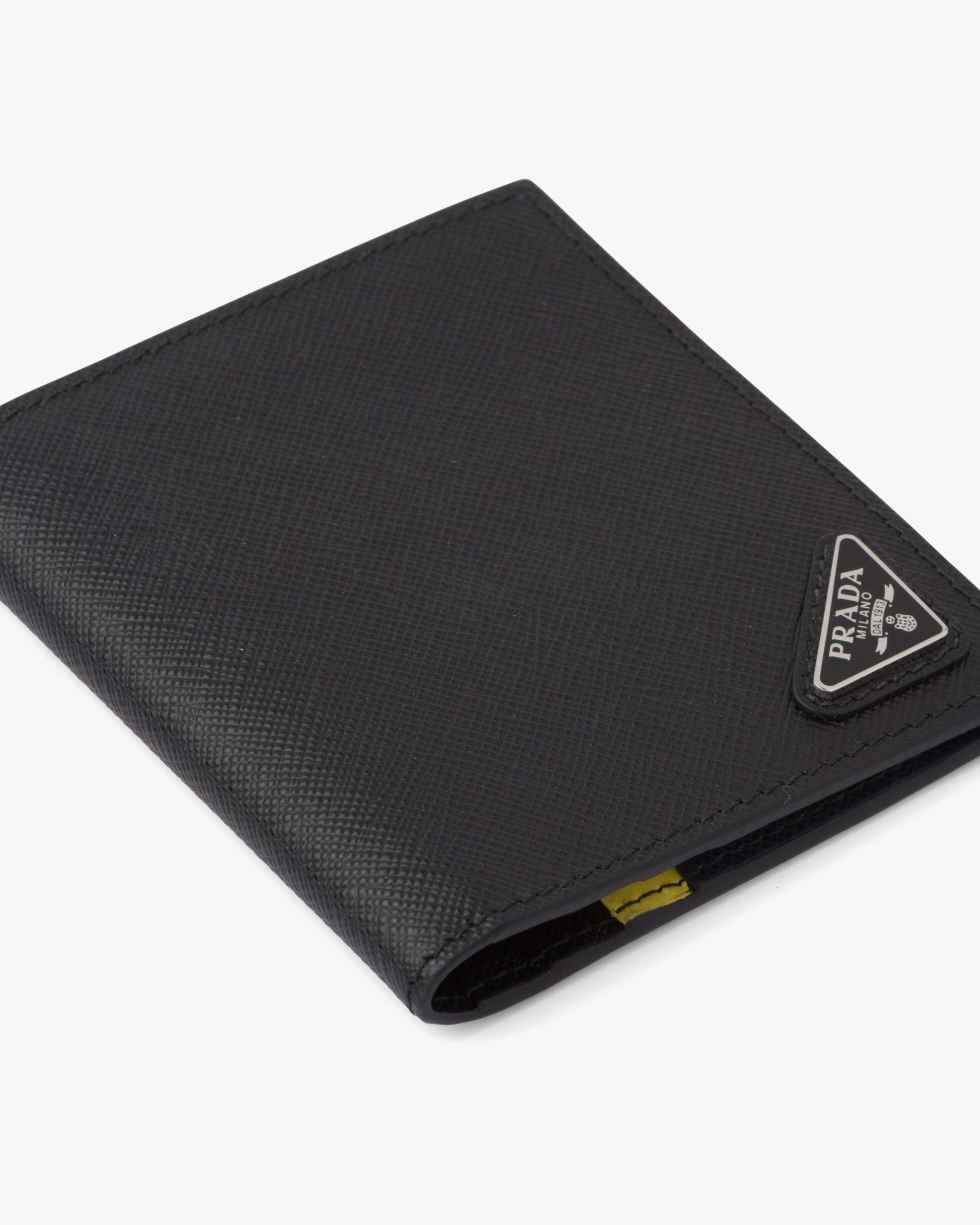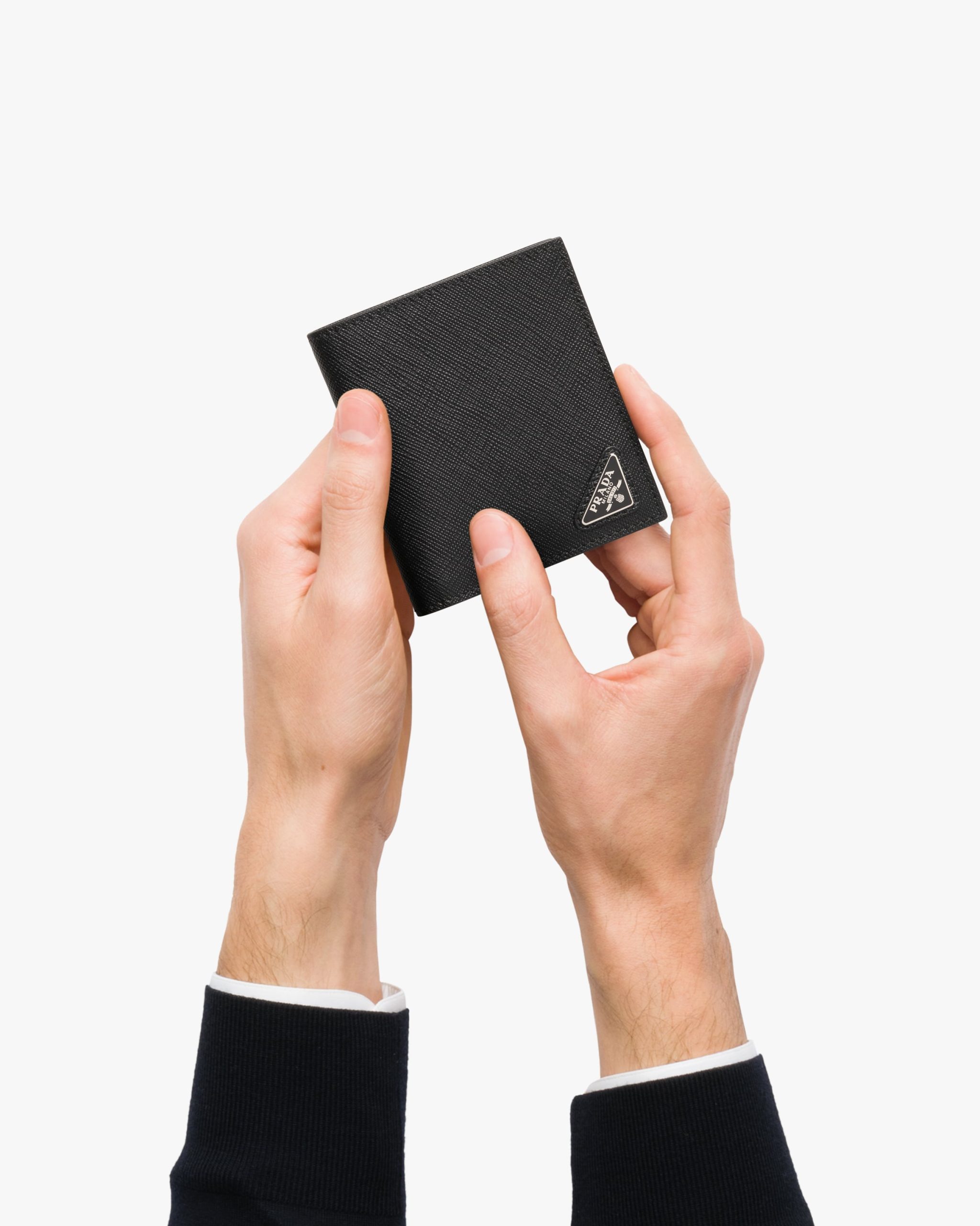 This wallet with the interior in a contrasting color is made of Saffiano, an iconic material of Prada: calf leather of the highest quality, defined by a crosshatch texture and a waxed finish. The enameled metal triangle logo2 completes the accessory.
