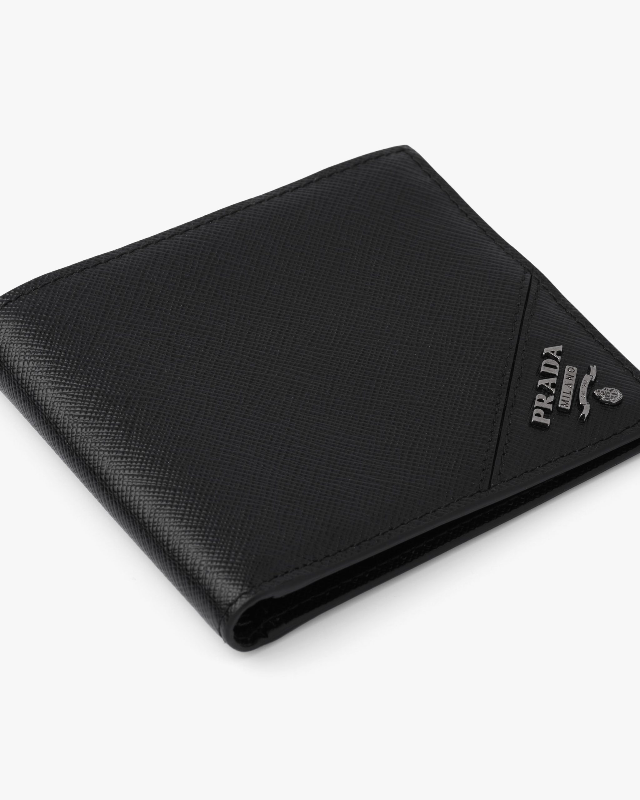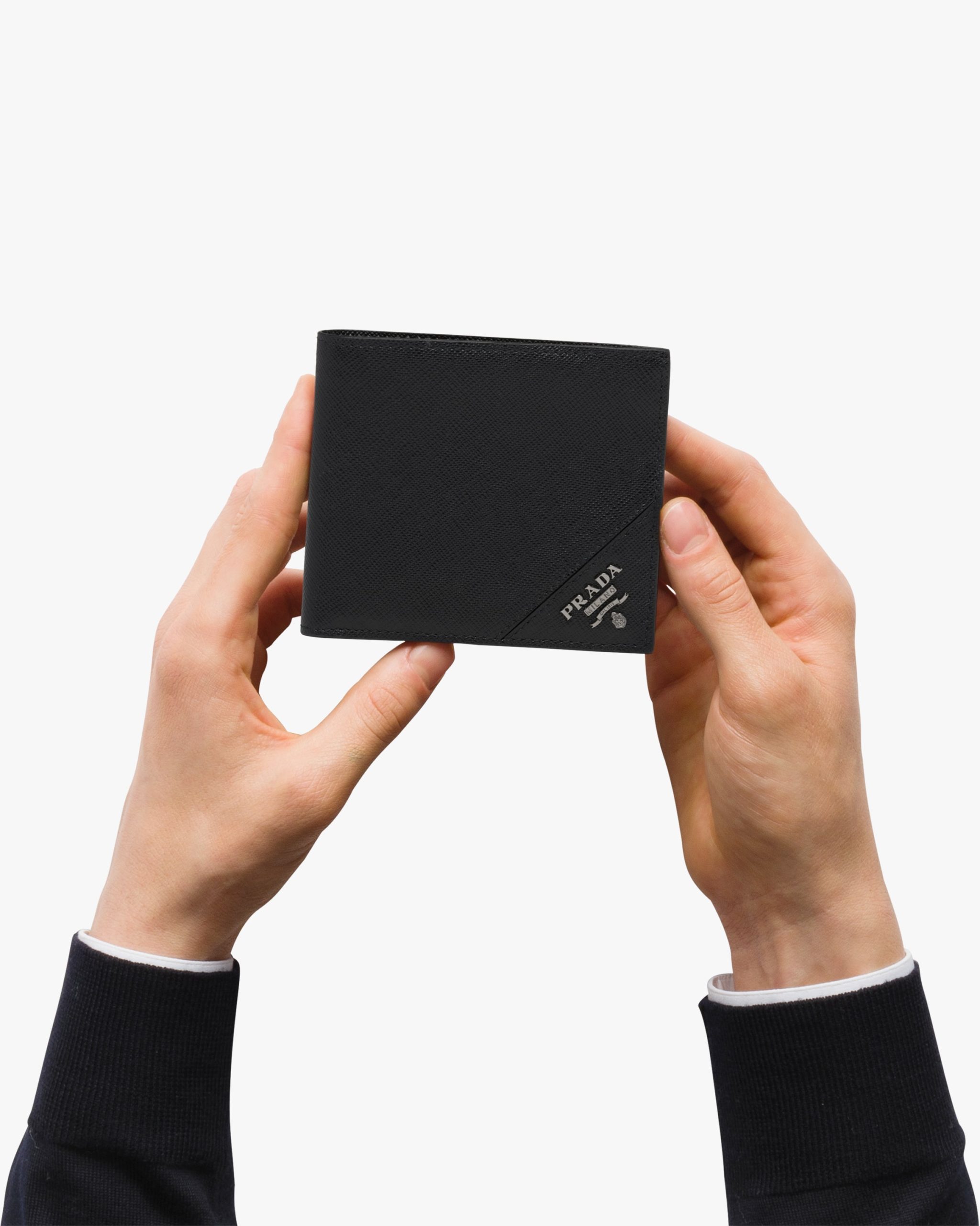 This wallet pairs stylish Saffiano leather and intarsia details decorated with a metal logo2 in the corner. It opens to compartments, pockets and slots, fabric lined throughout.