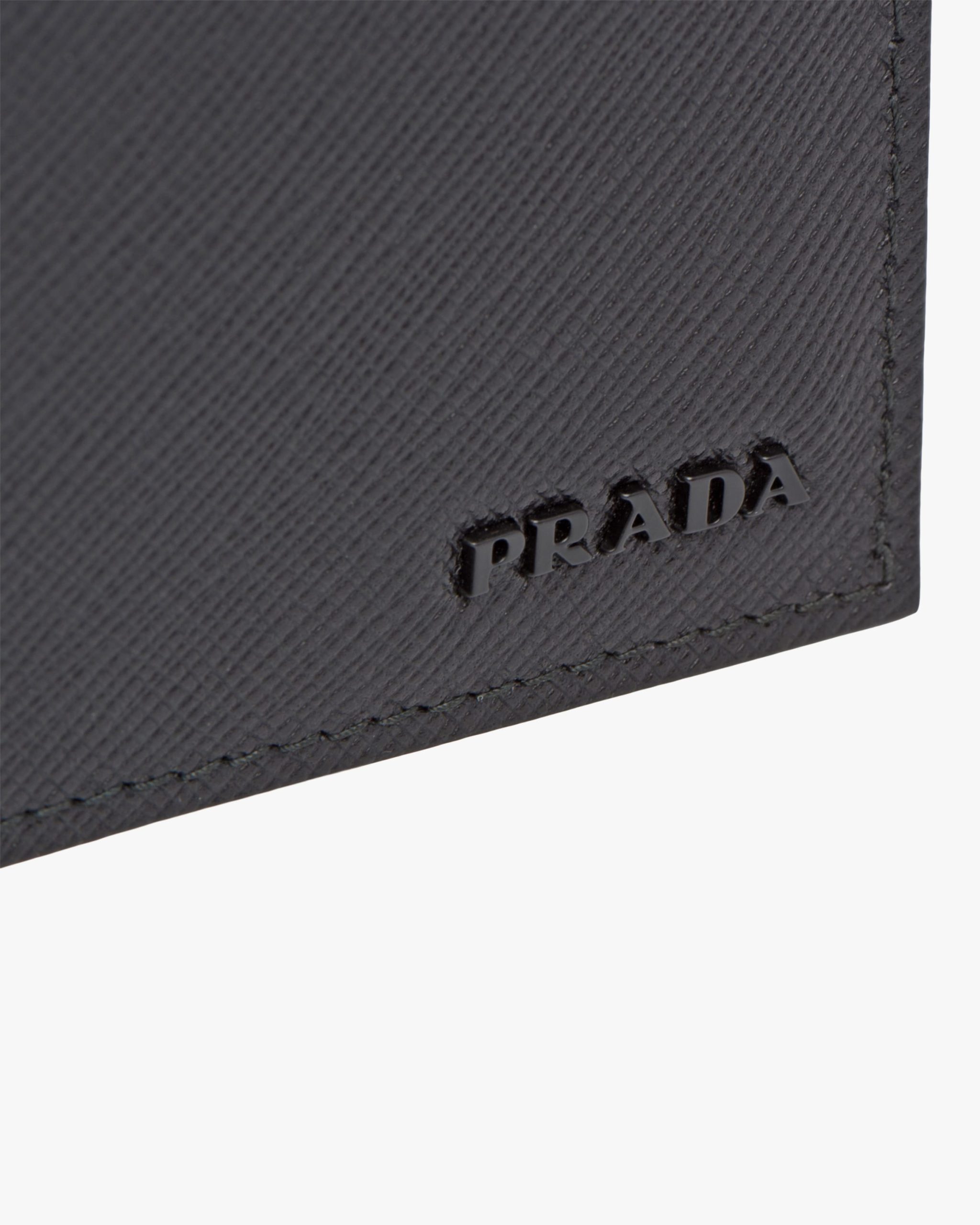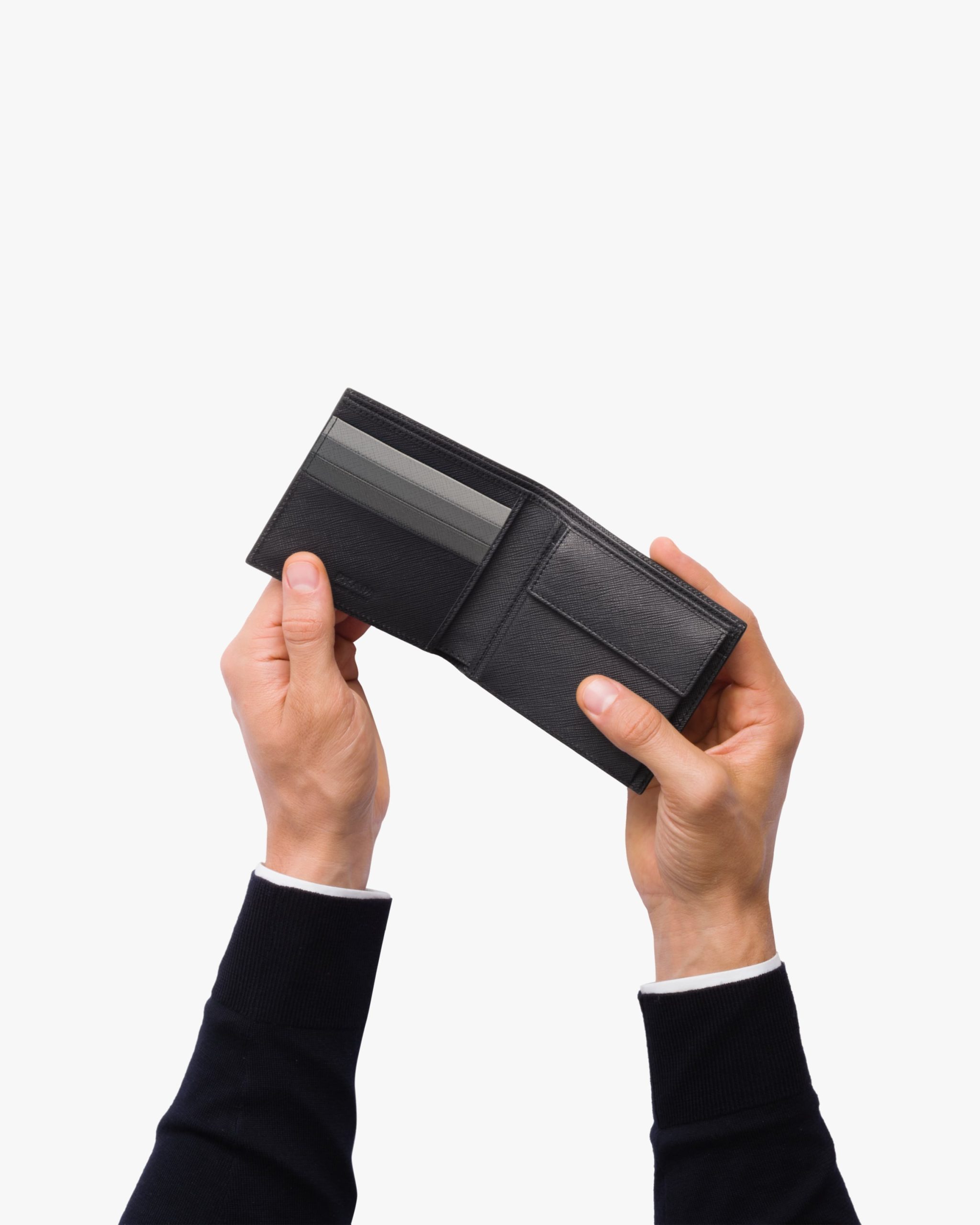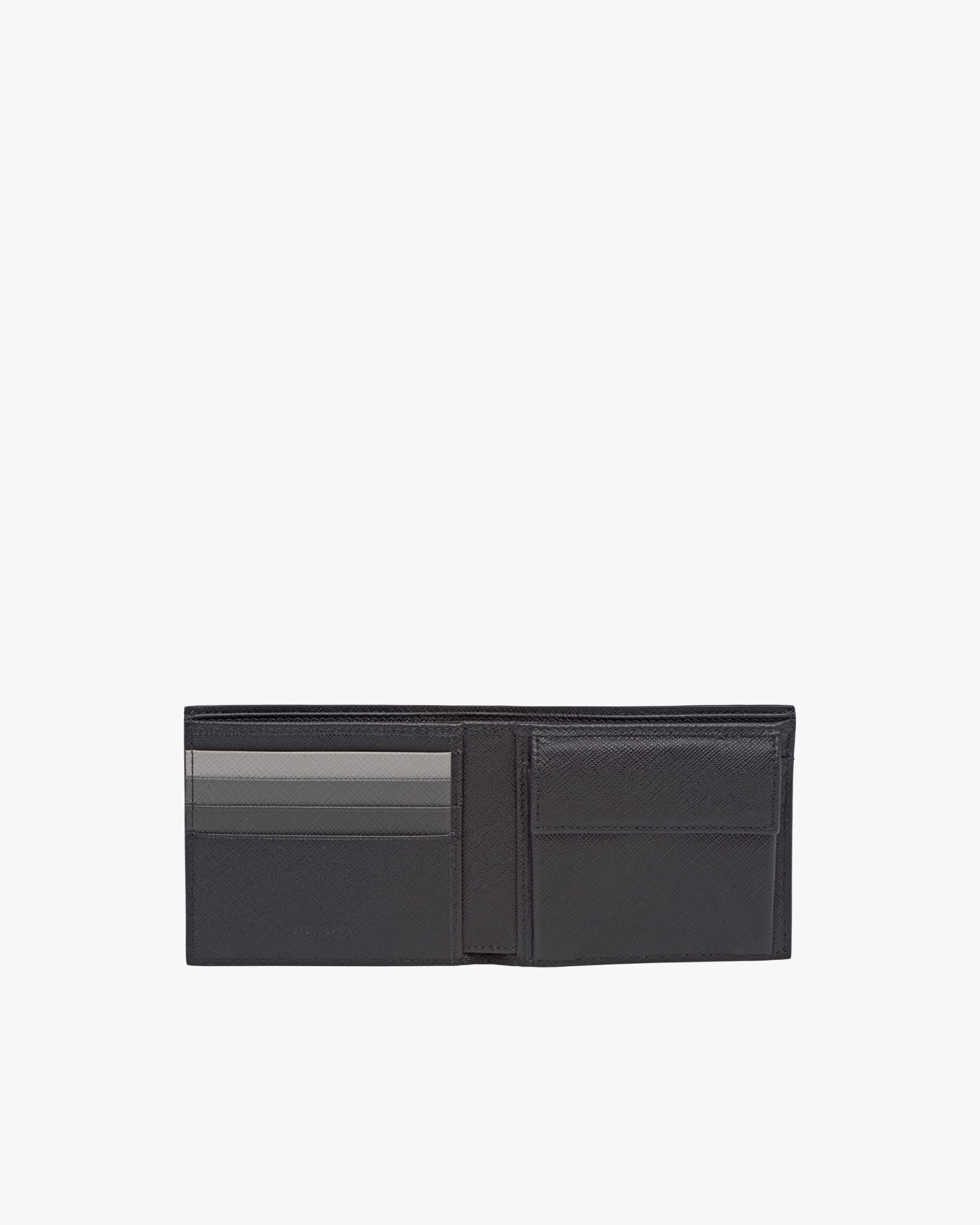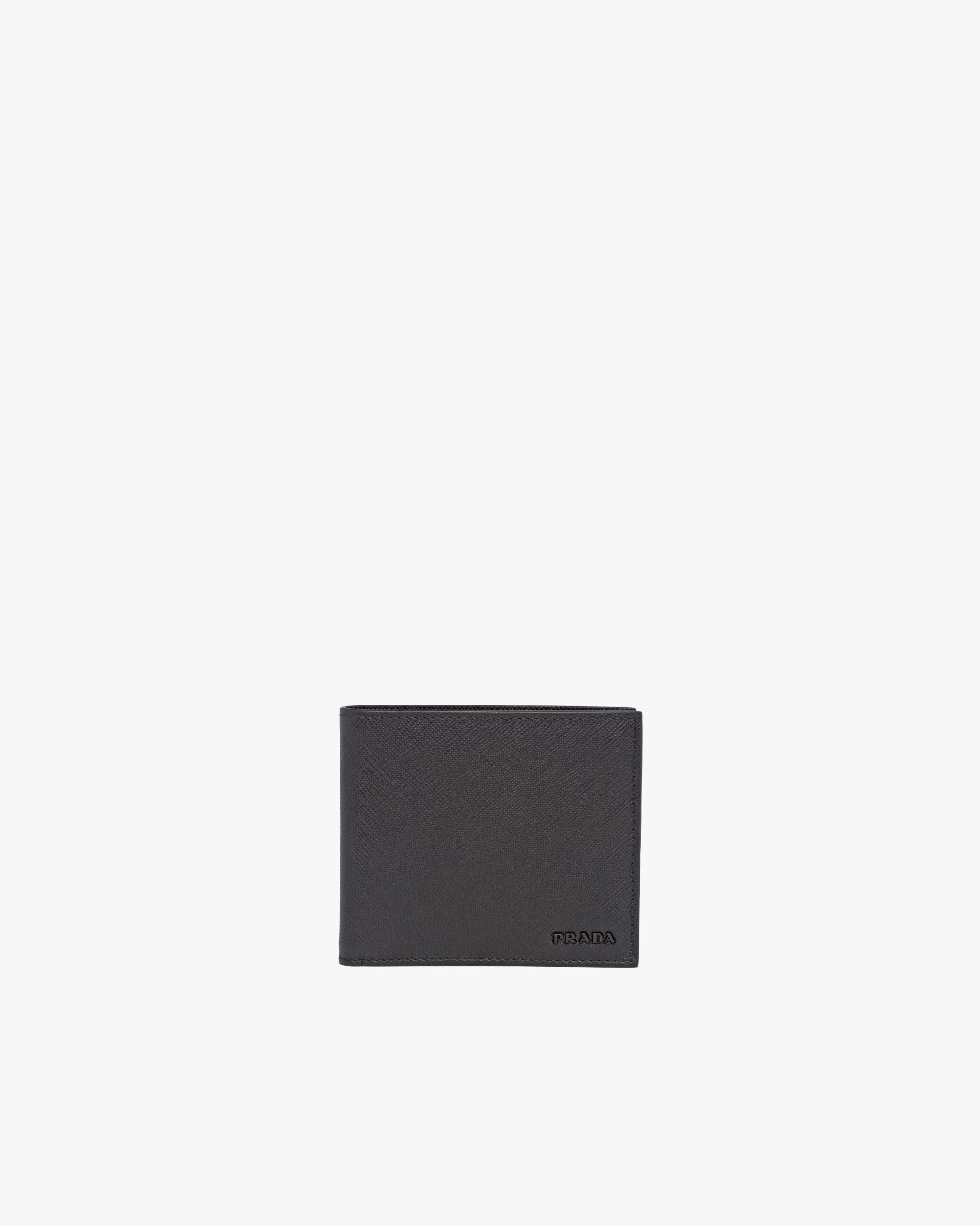 This Saffiano leather wallet expresses elegant simplicity. It is decorated with the metal logo2.