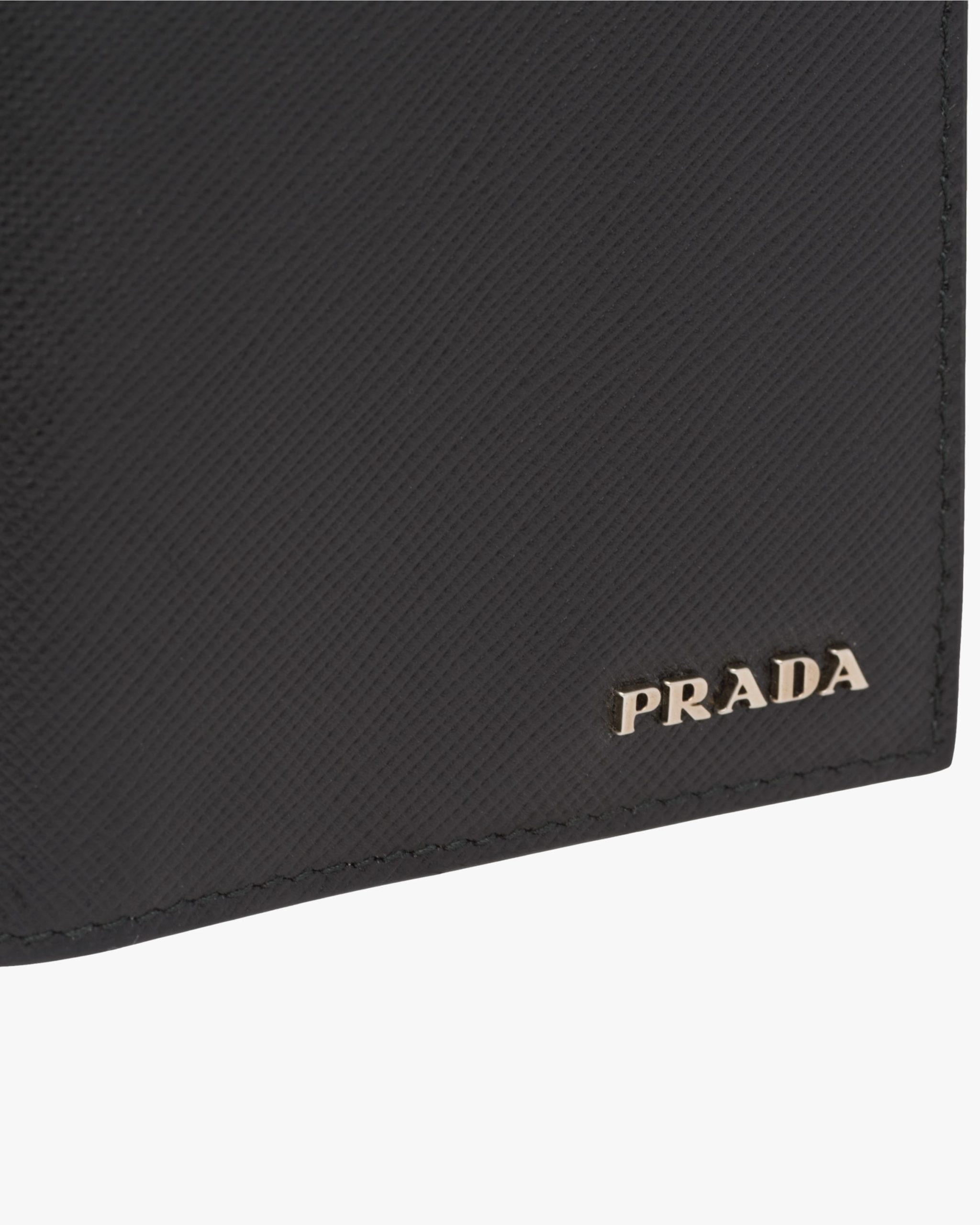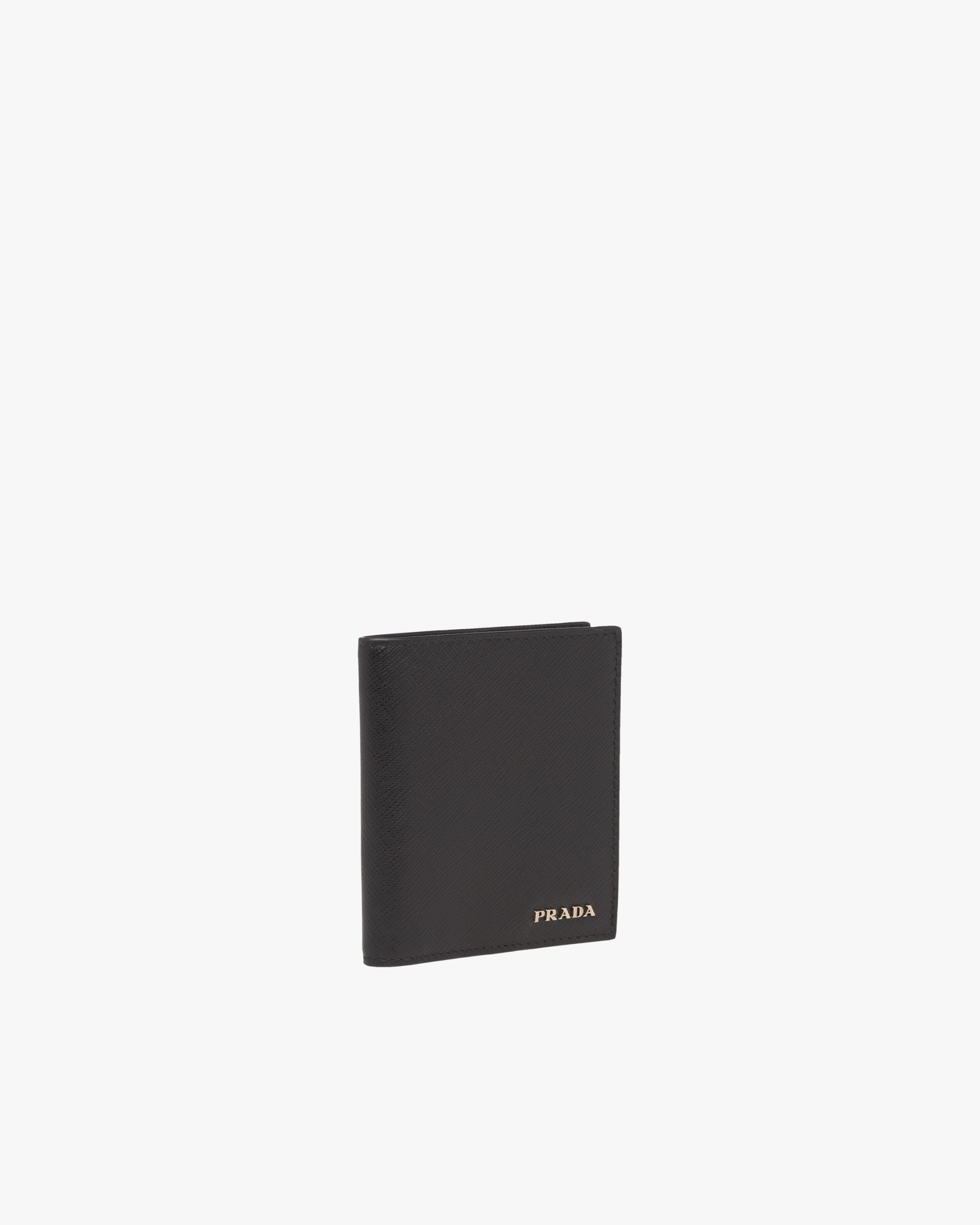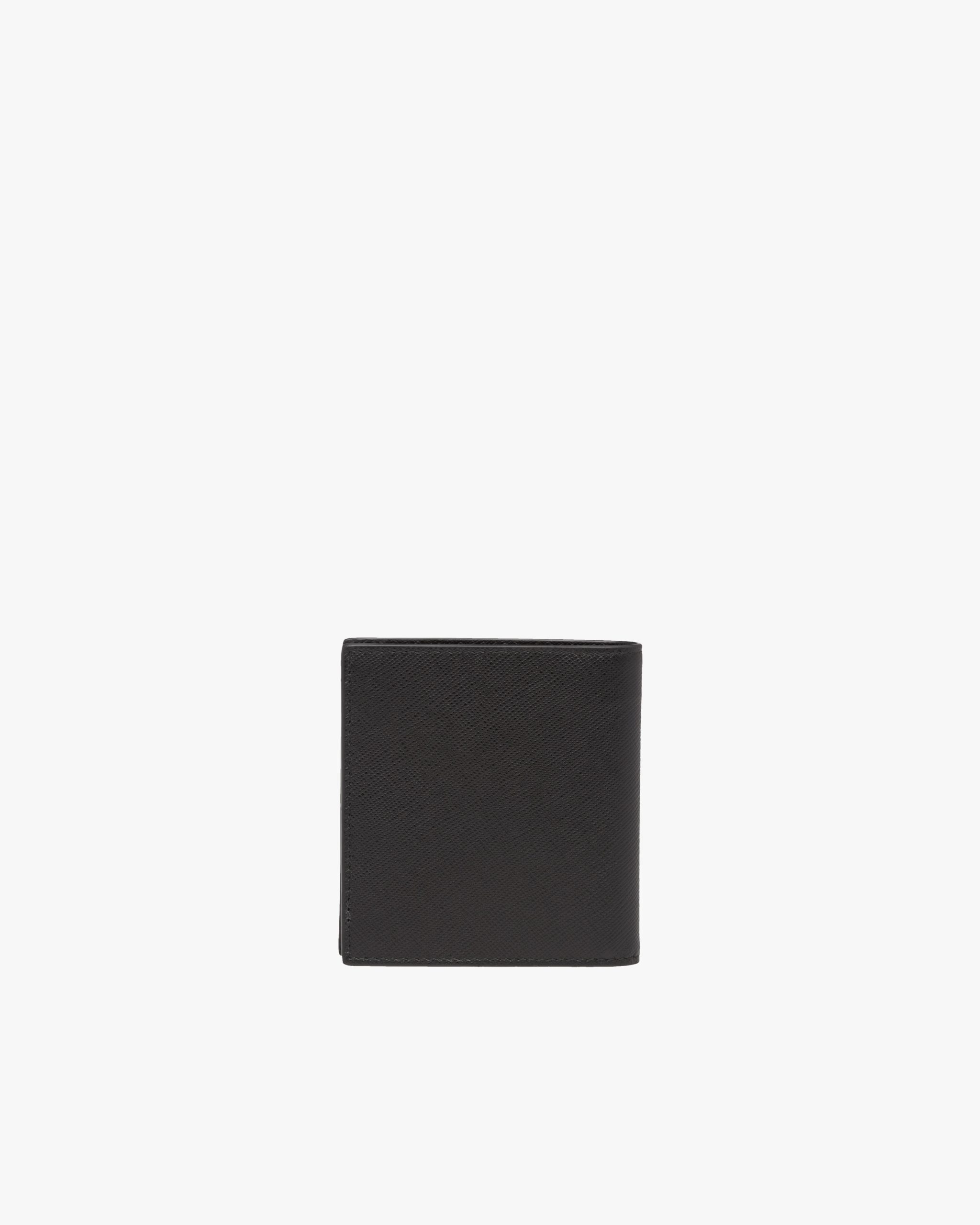 Saffiano leather wallet with metal lettering logo2, lined with leather in a contrasting color and featuring a bill compartment, six credit card slots, and two document pockets.