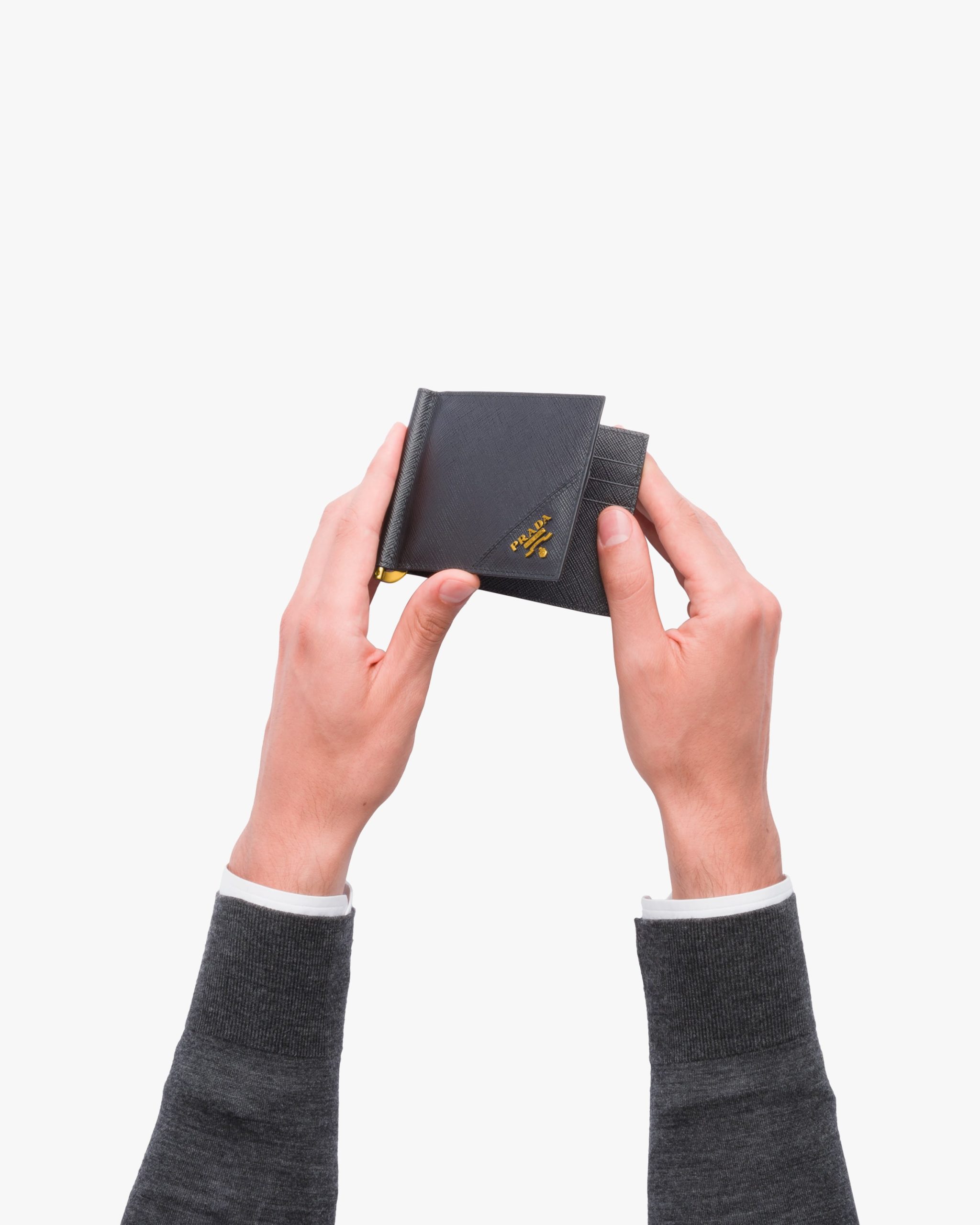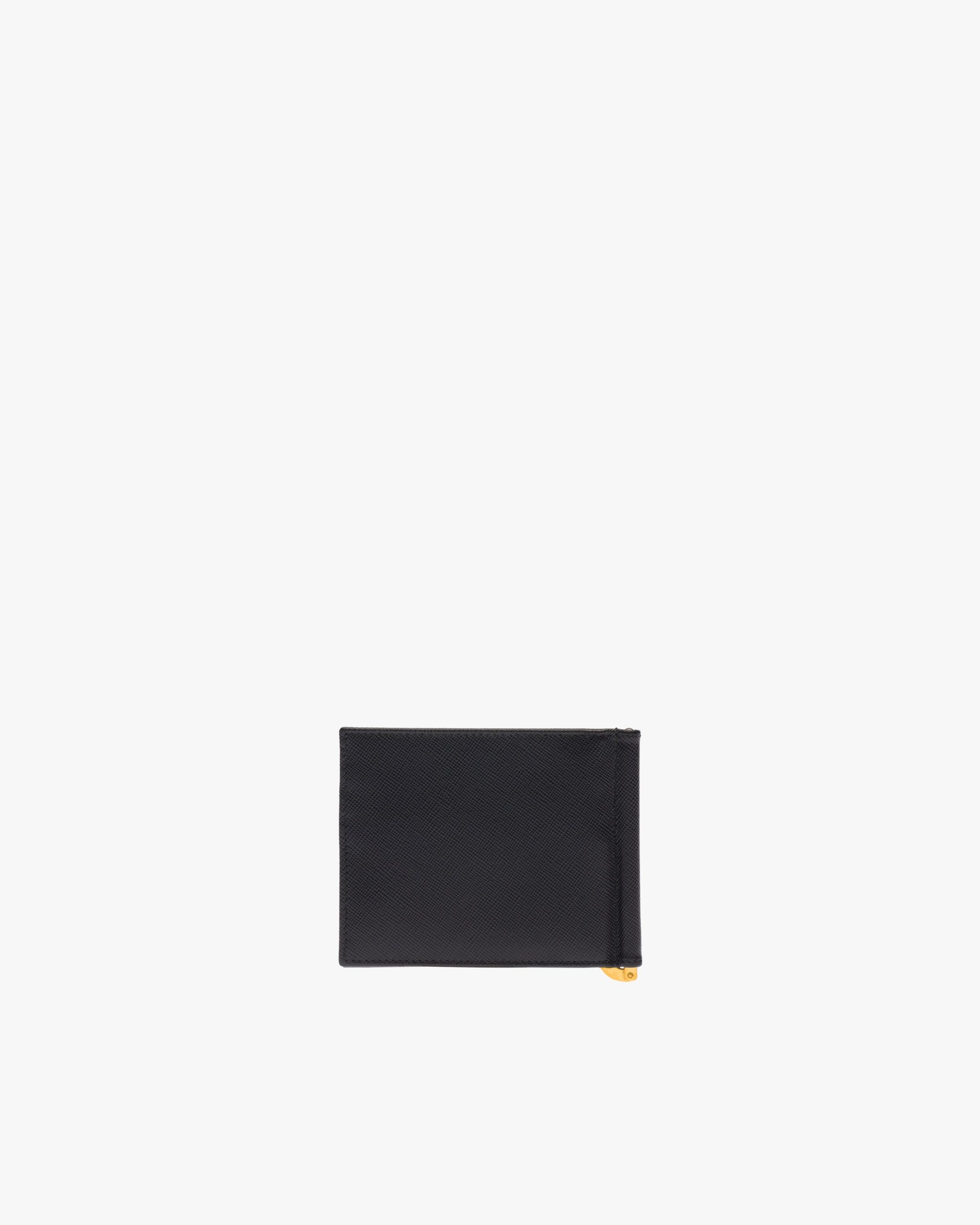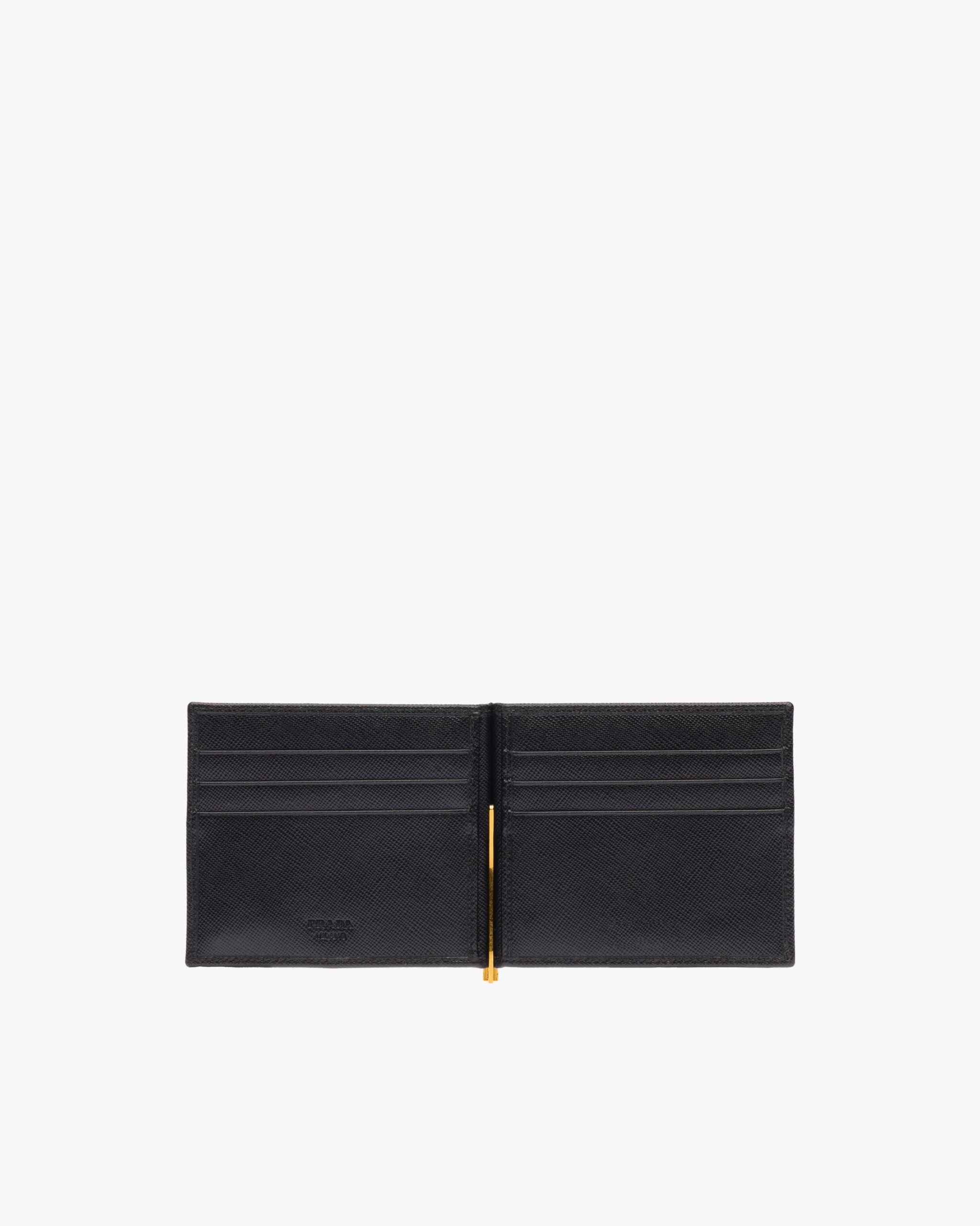 This Saffiano leather wallet is defined by its metal details, pairing a handy interior metal money clip with a stylish metal Prada logo2 on the front. It opens to a fabric lining and six credit card slots.
