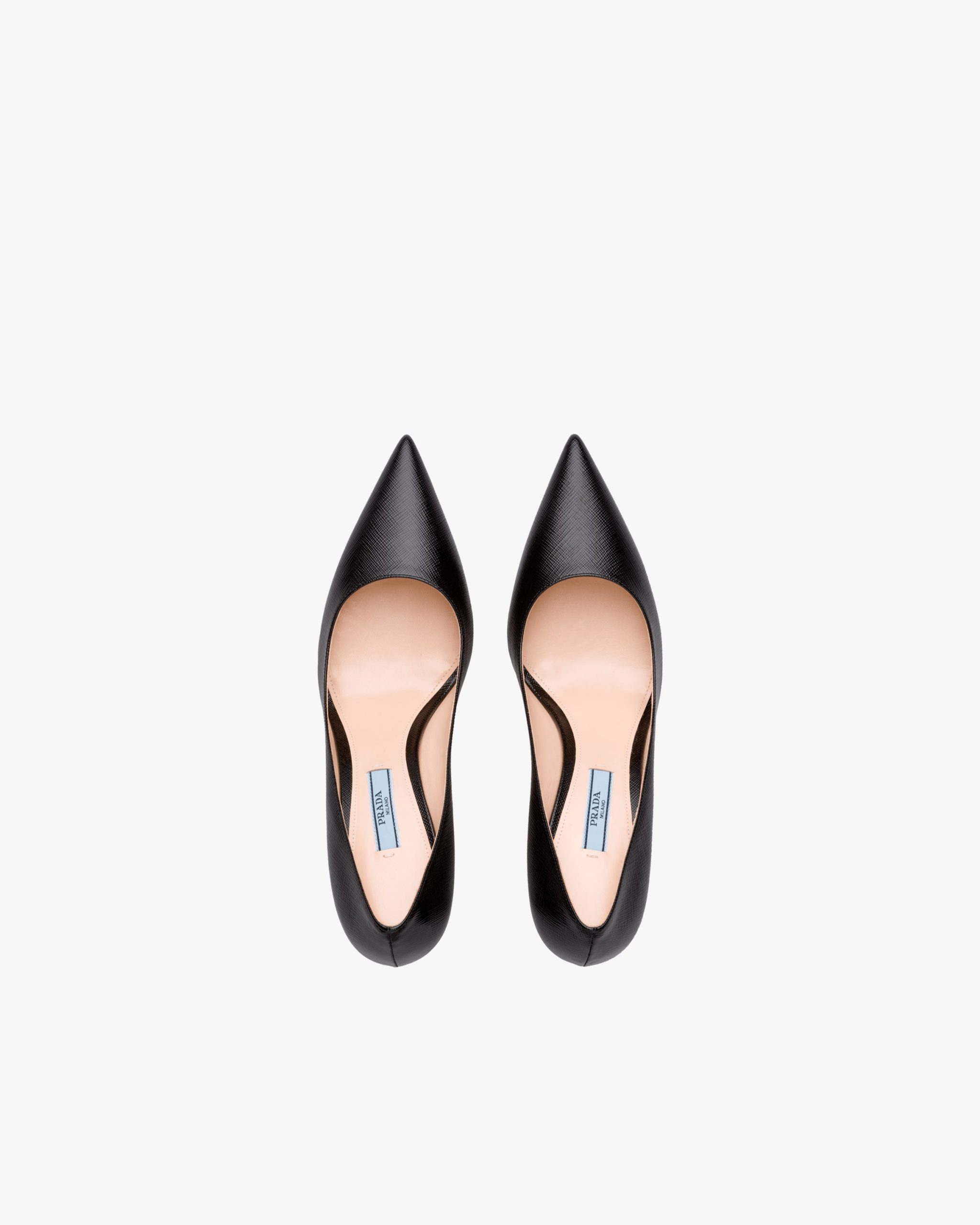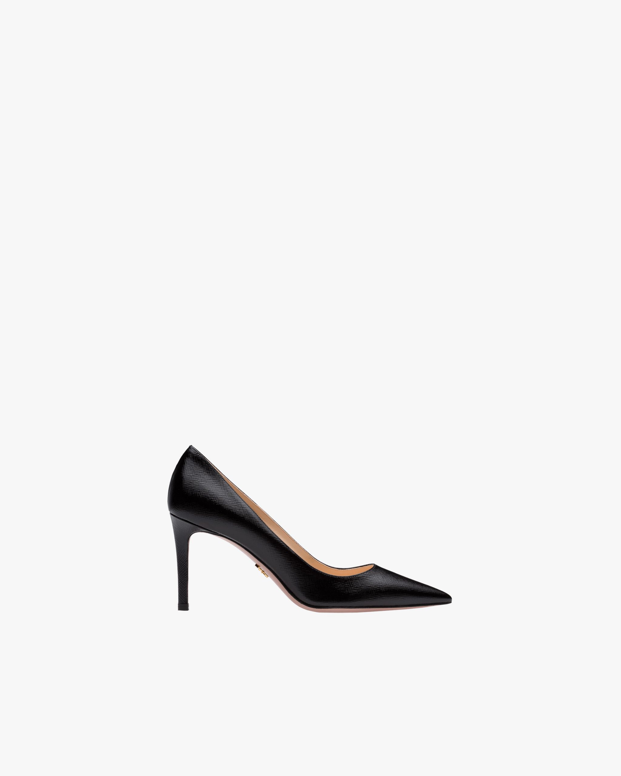 These Saffiano textured patent leather pumps with tapered silhouette and slim 85 mm stiletto heel express timeless femininity.