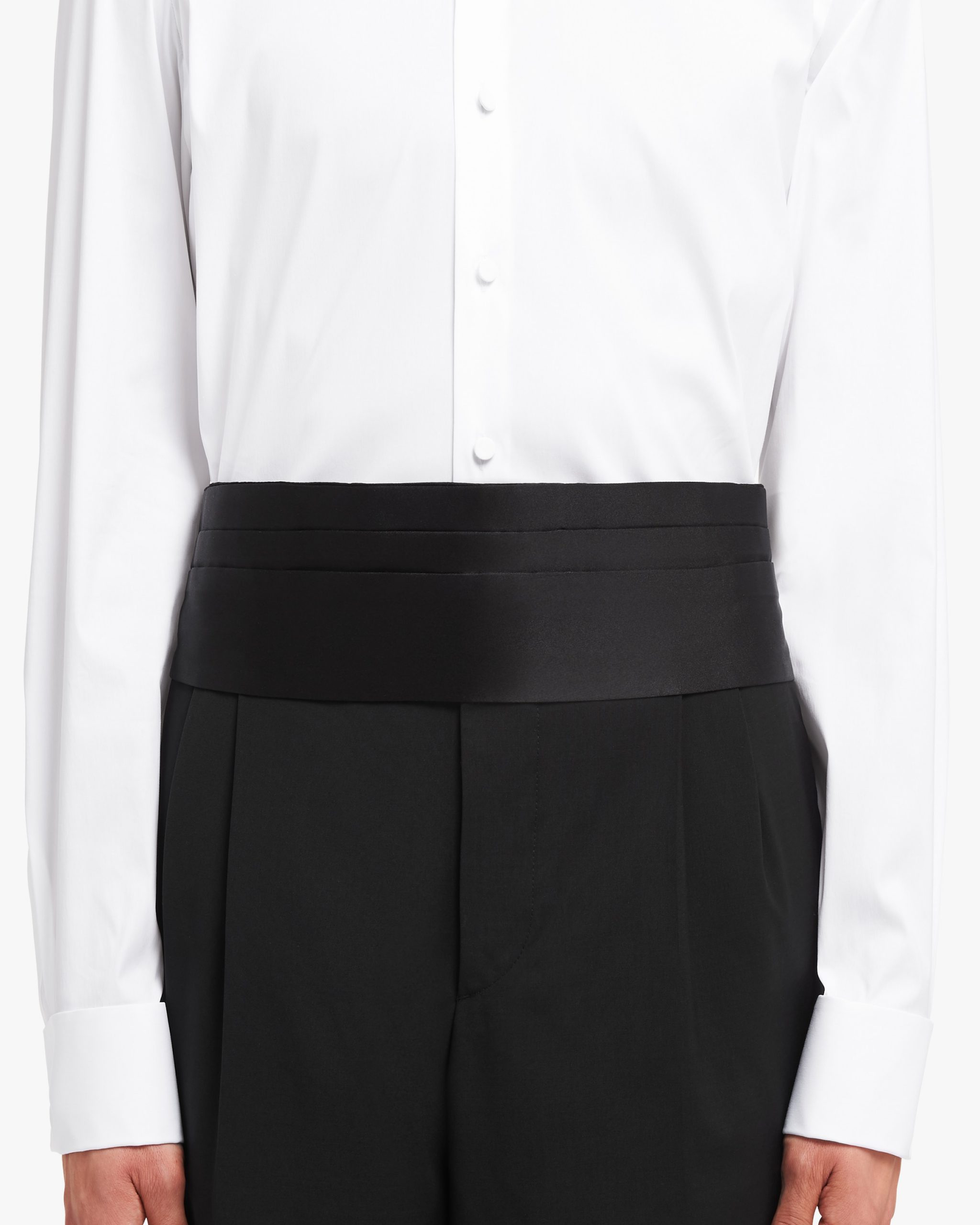 The classic satin tuxedo cummerbund has an adjustable tab closure with hooks.