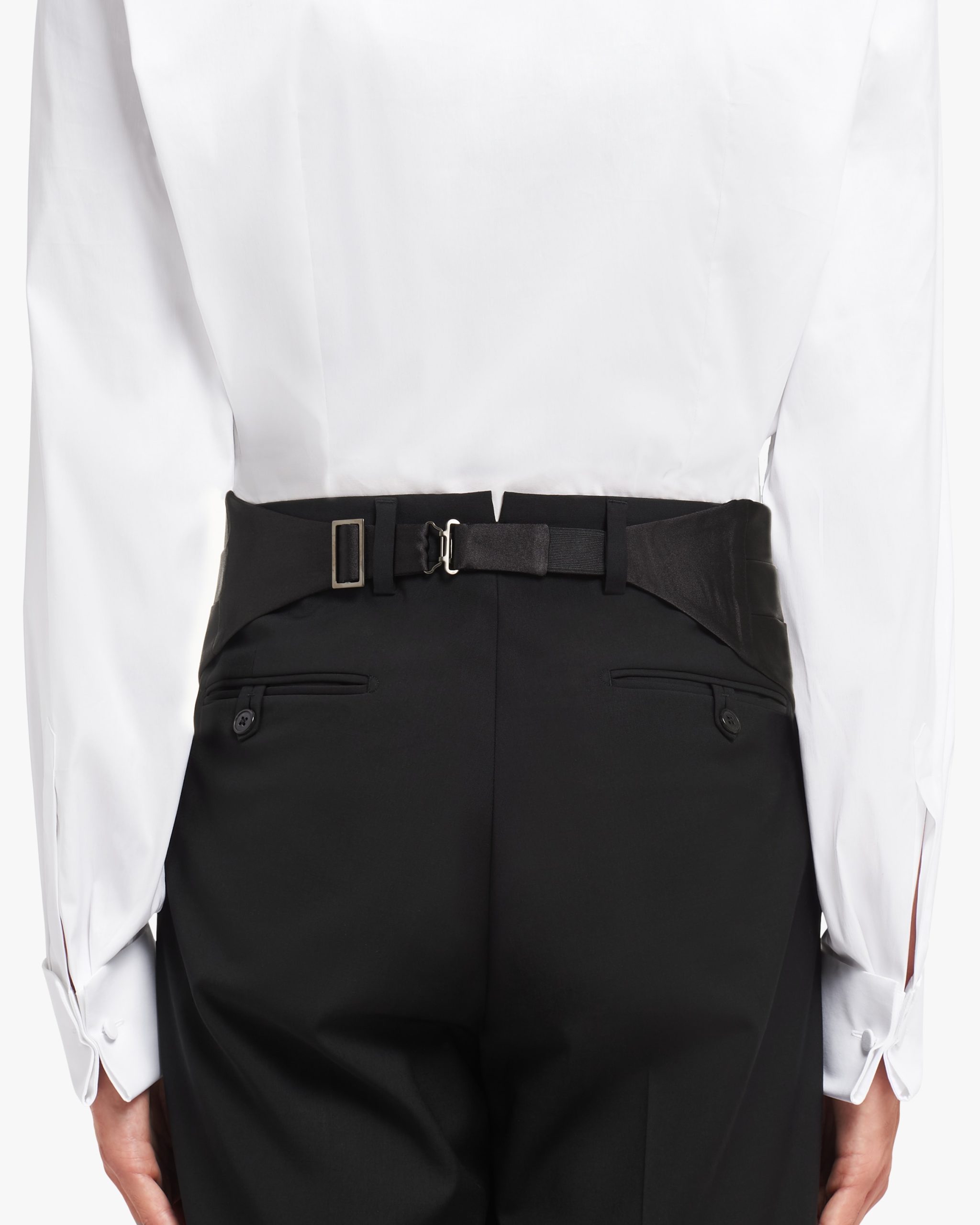 The classic satin tuxedo cummerbund has an adjustable tab closure with hooks.