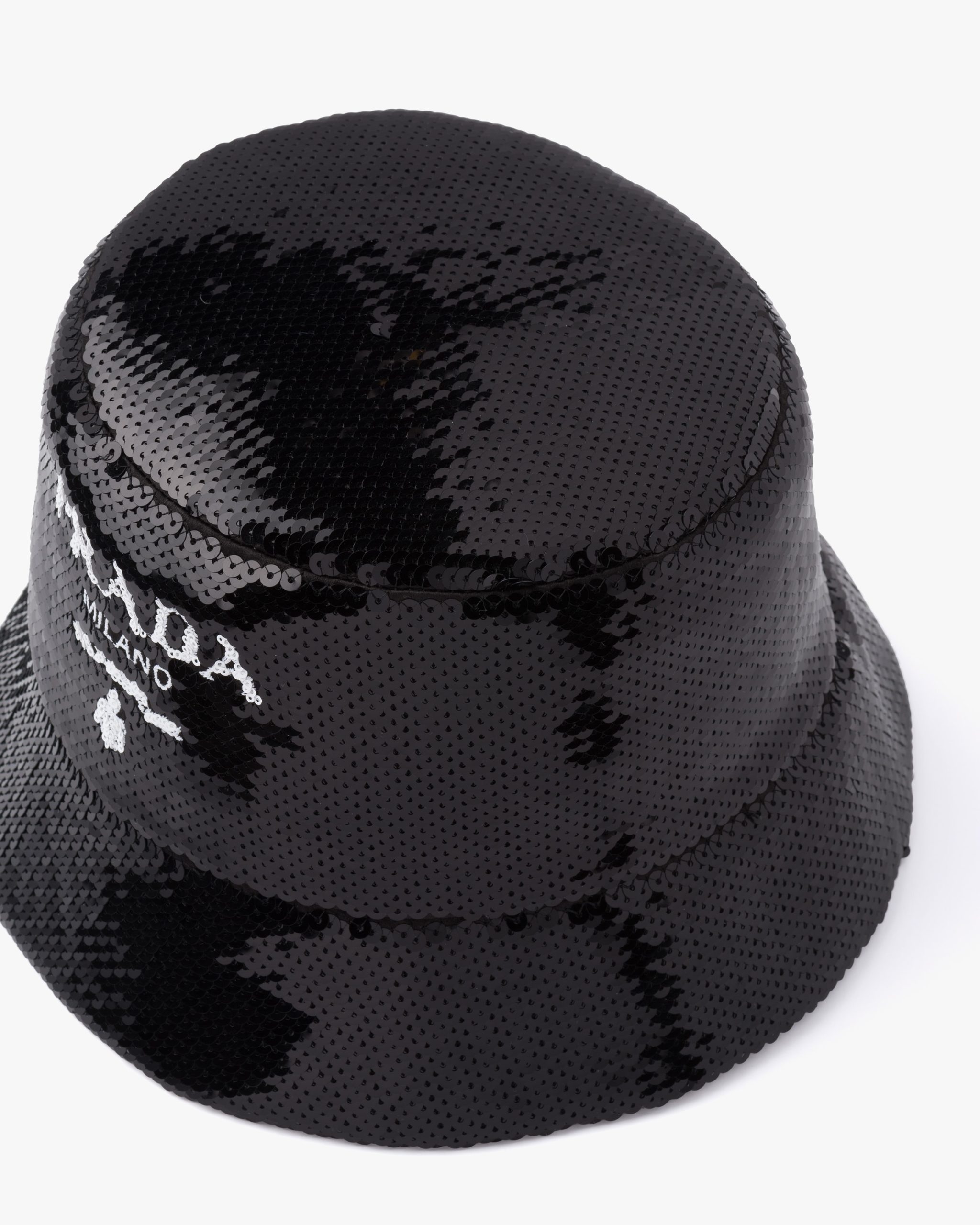 A cascade of sequins covers this bucket hat, adding an unexpectedly luxurious touch to an iconic, contemporary design of Prada collectsions. The embroidered lettering logo2 adds a contrasting note.