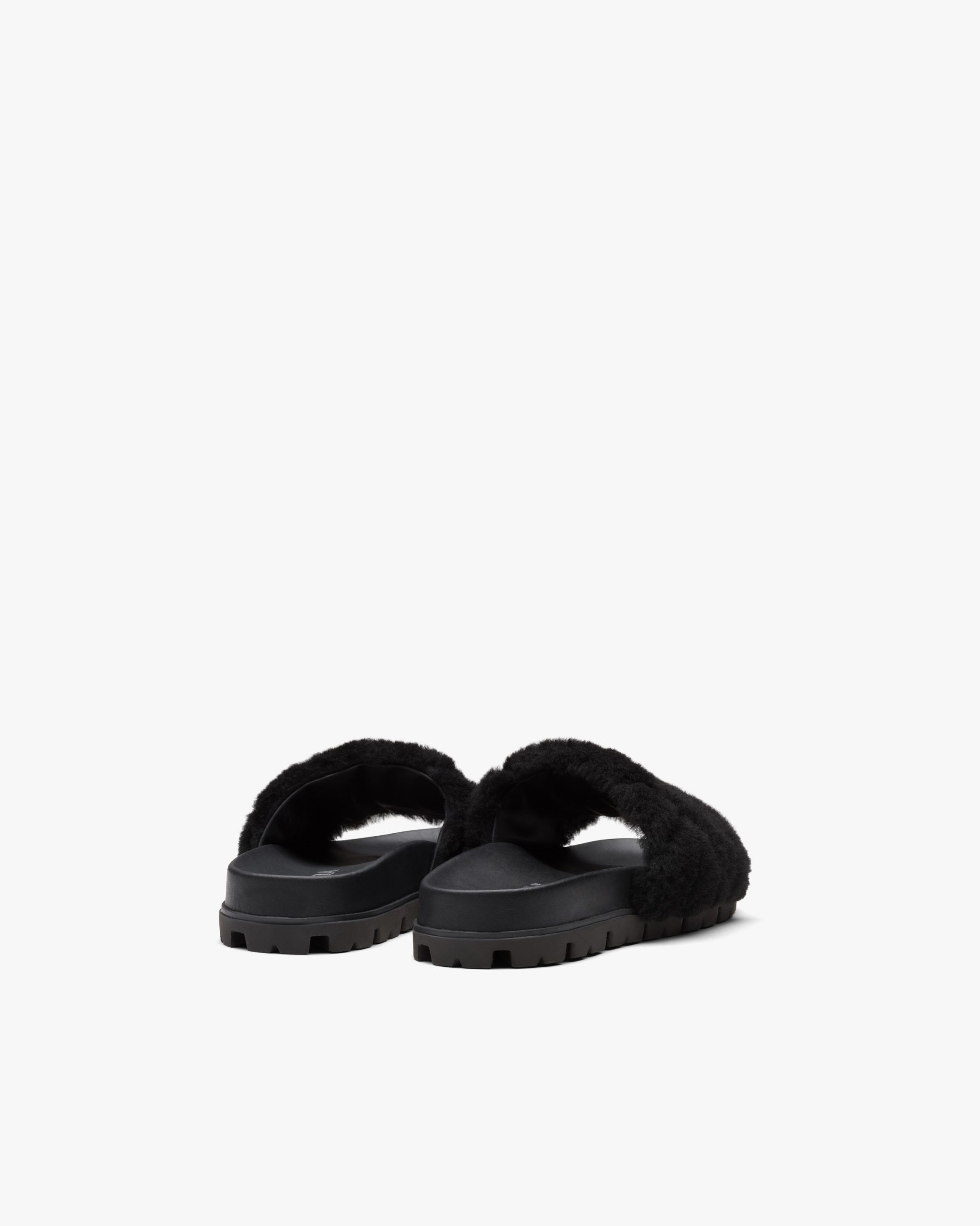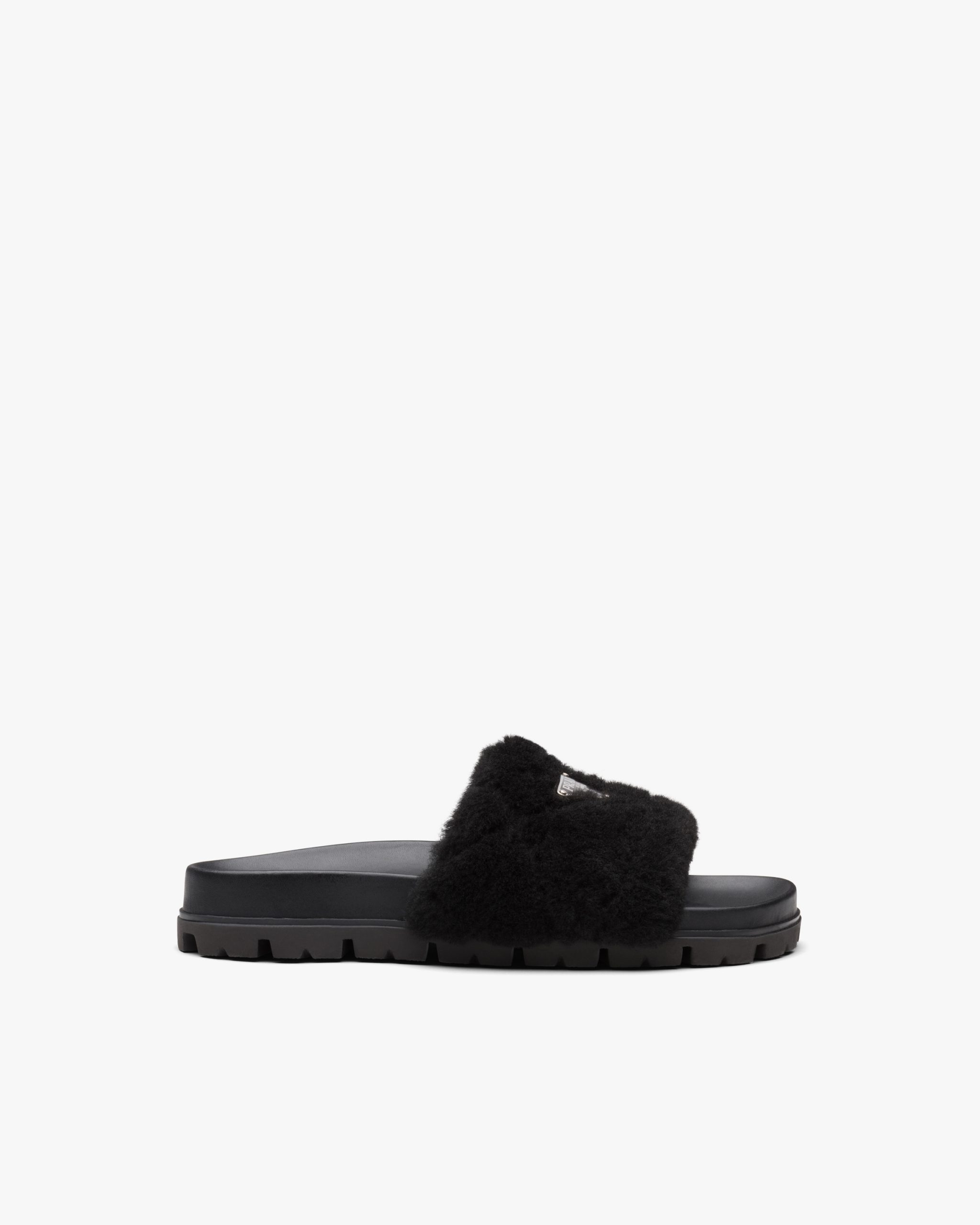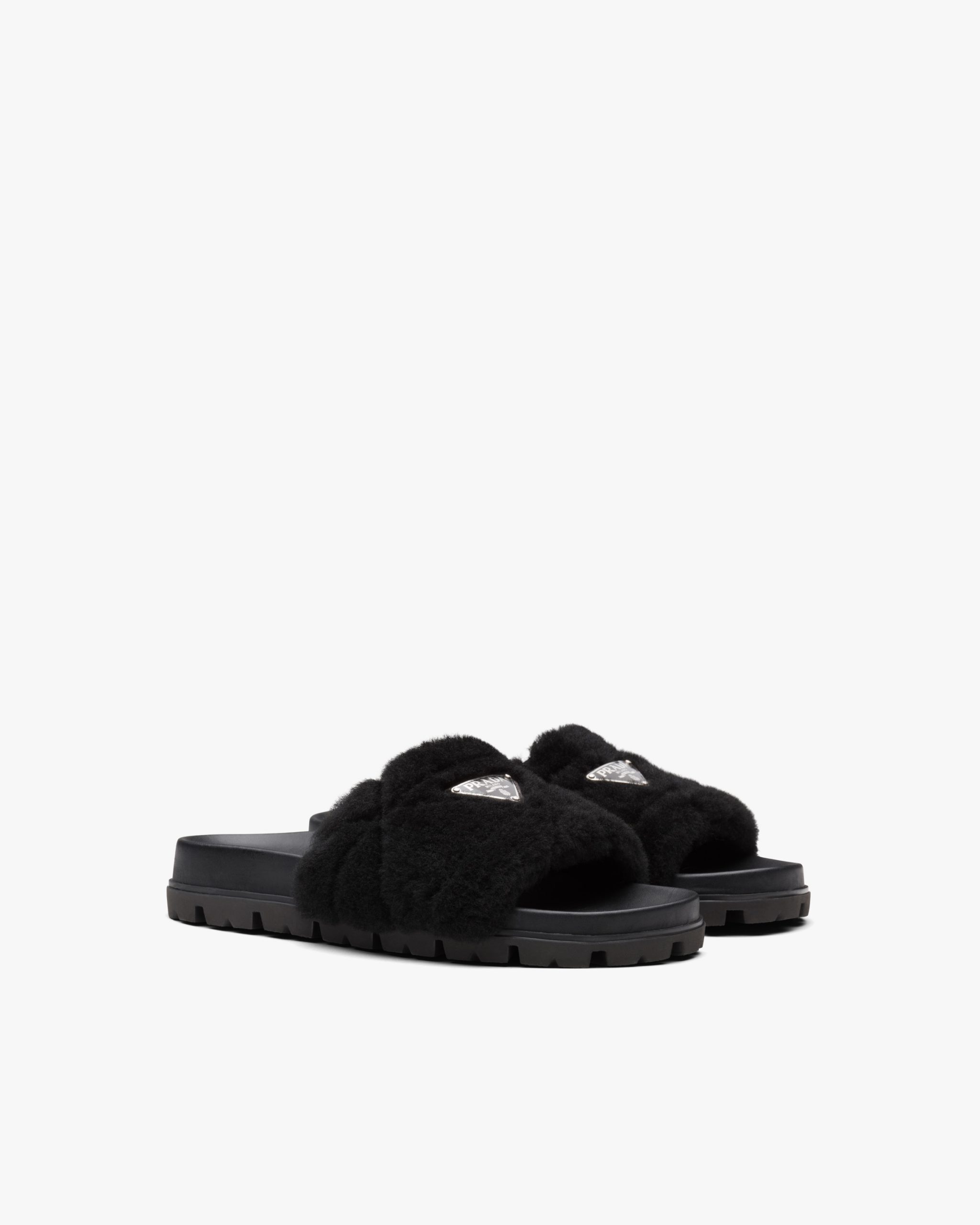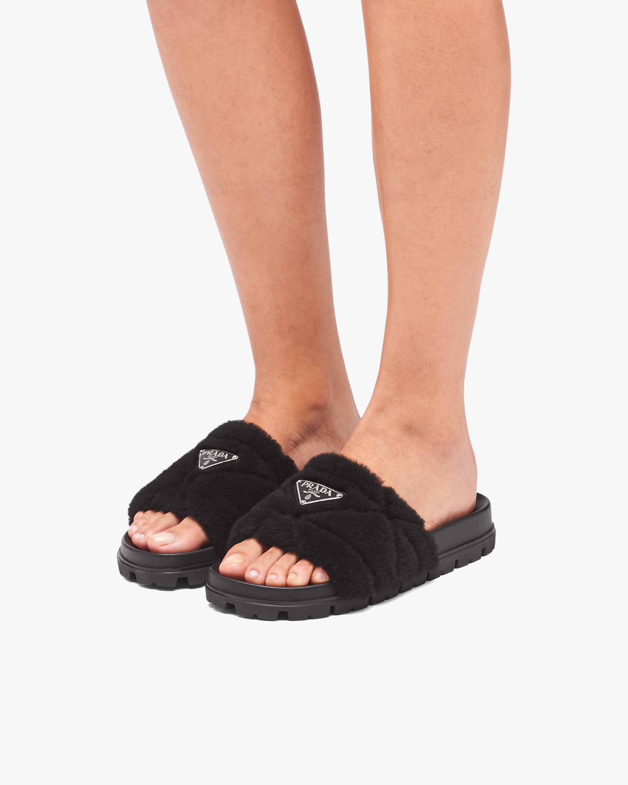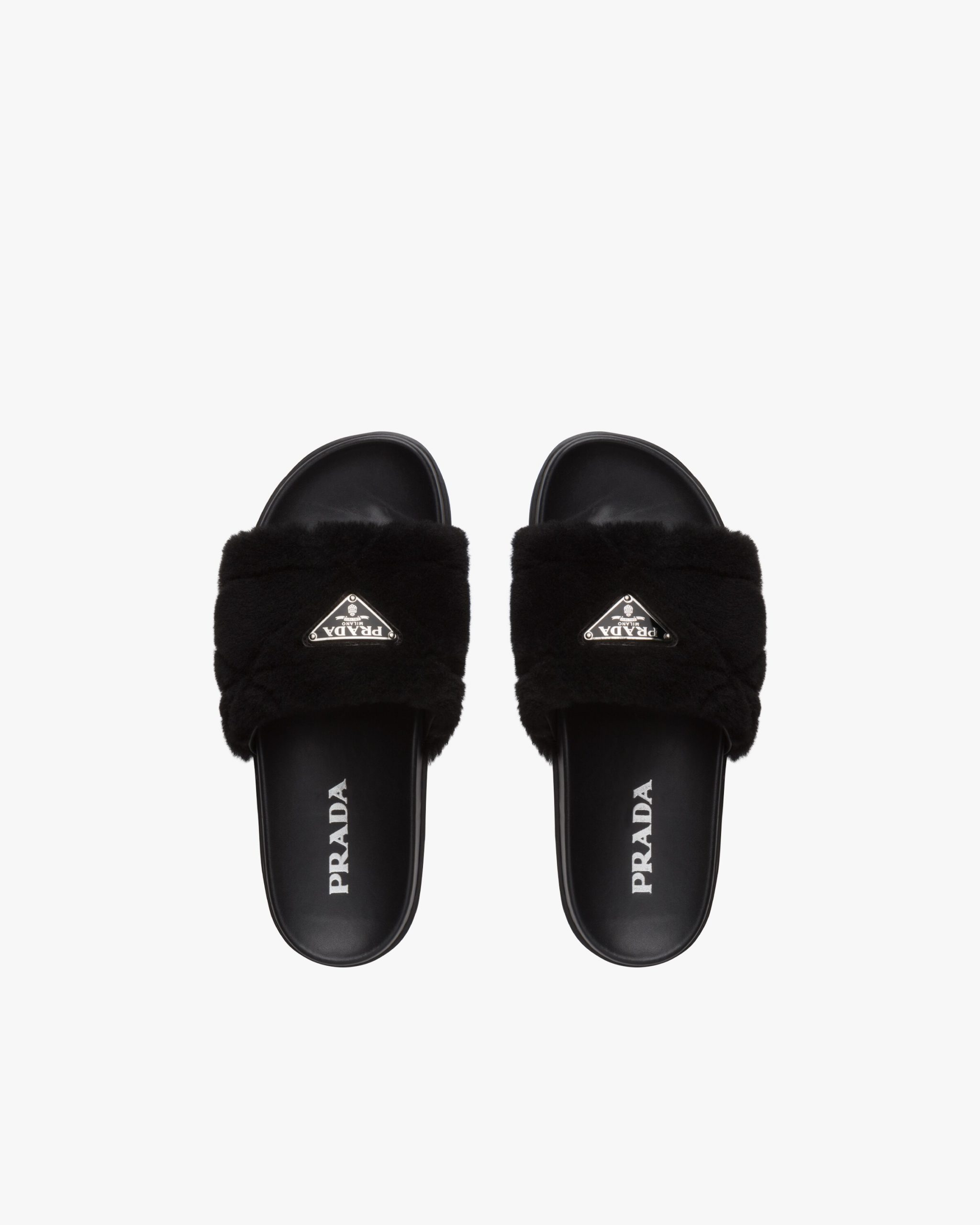 The iconic Prada triangle is echoed in the quilted motif of these shearling slides on a rubber sole and accented by the enameled metal triangle logo2.