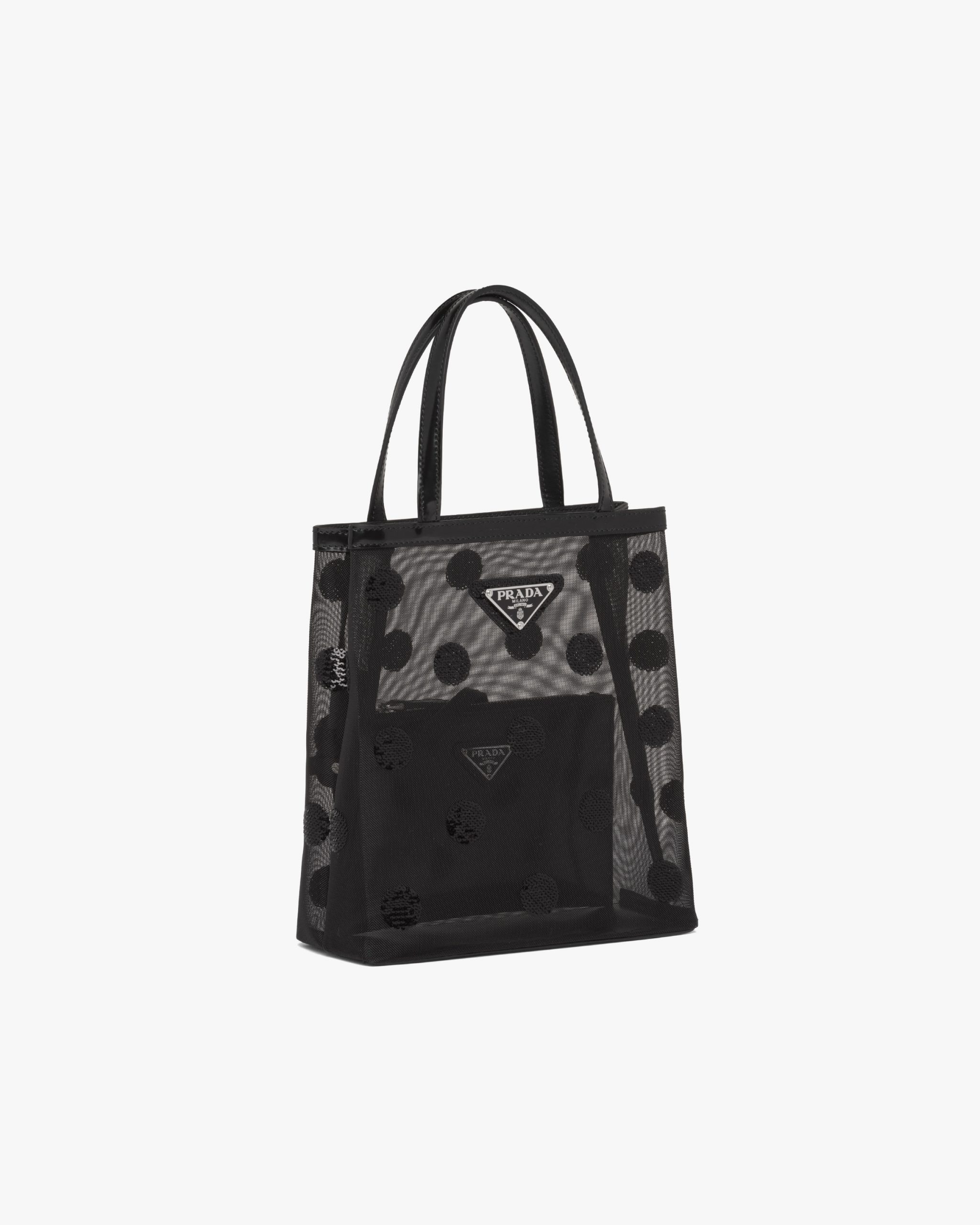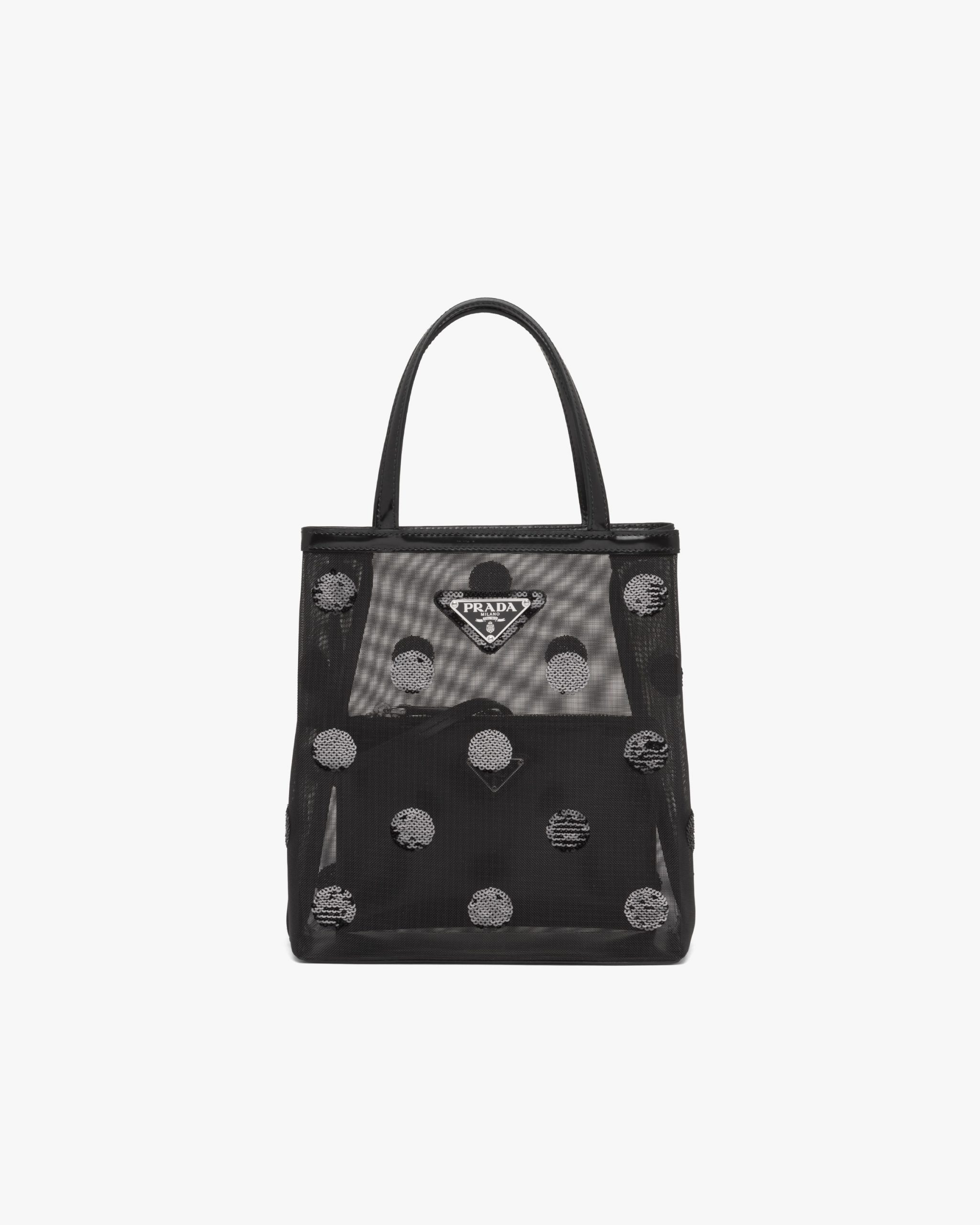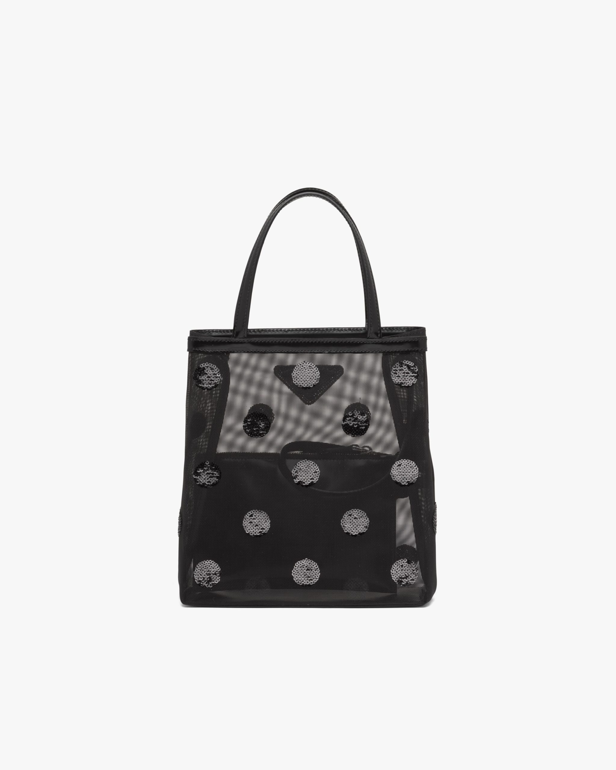 A contemporary soul and precious accents characterize this small mesh tote bag decorated with a sophisticated sequin polka-dot motif. Provided with a double handle and defined by its sleek design, the accessory with leather trim has a removable pouch inside and is decorated with Prada’s iconic enameled metal triangle logo2.