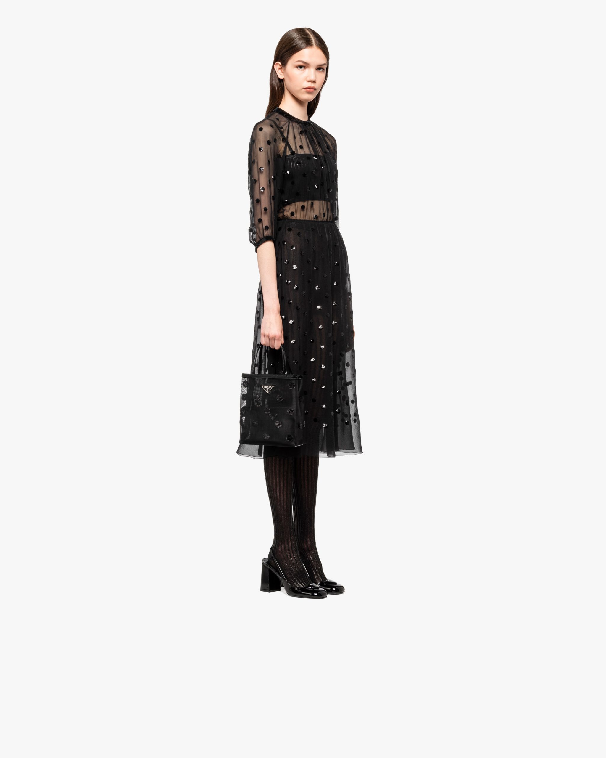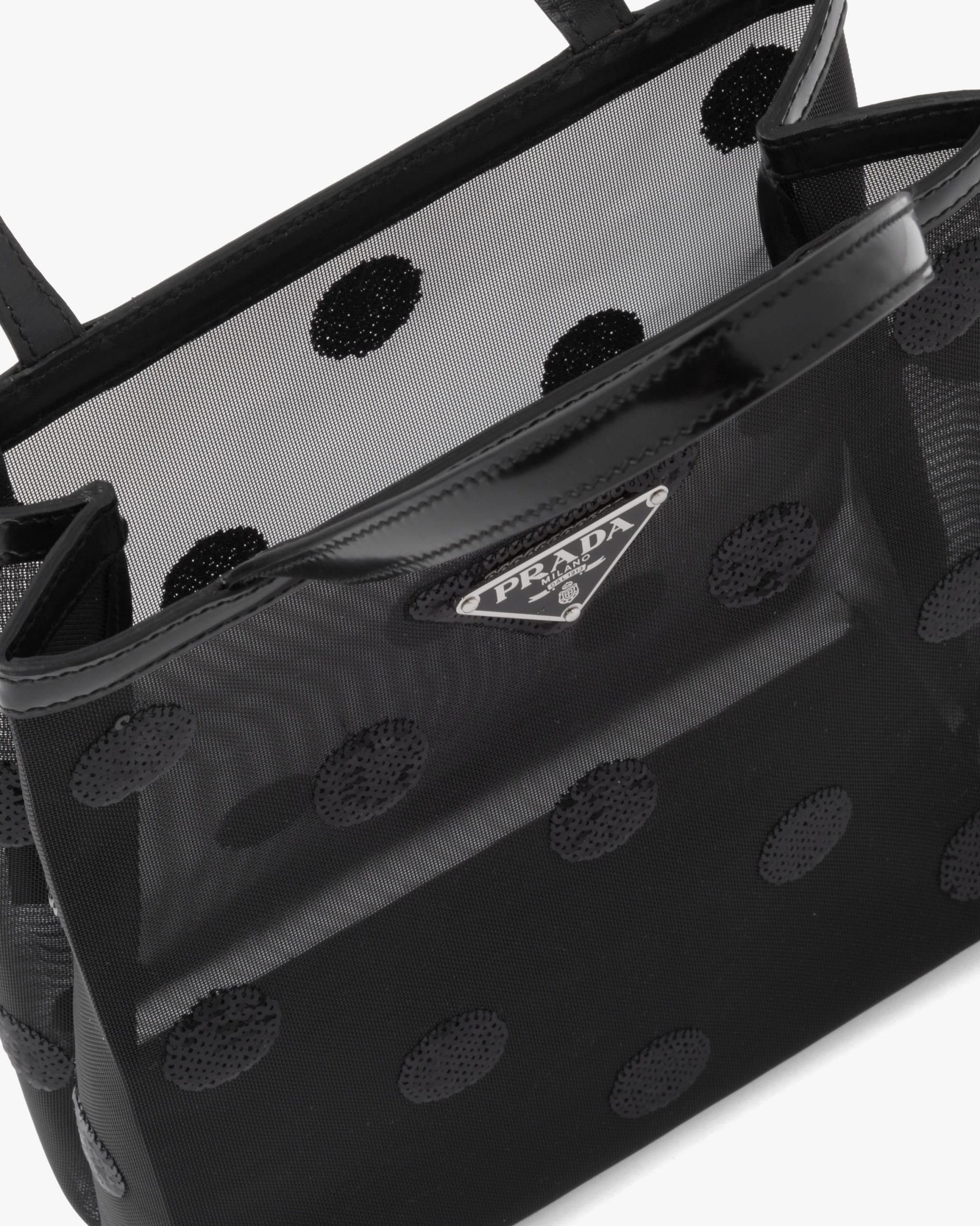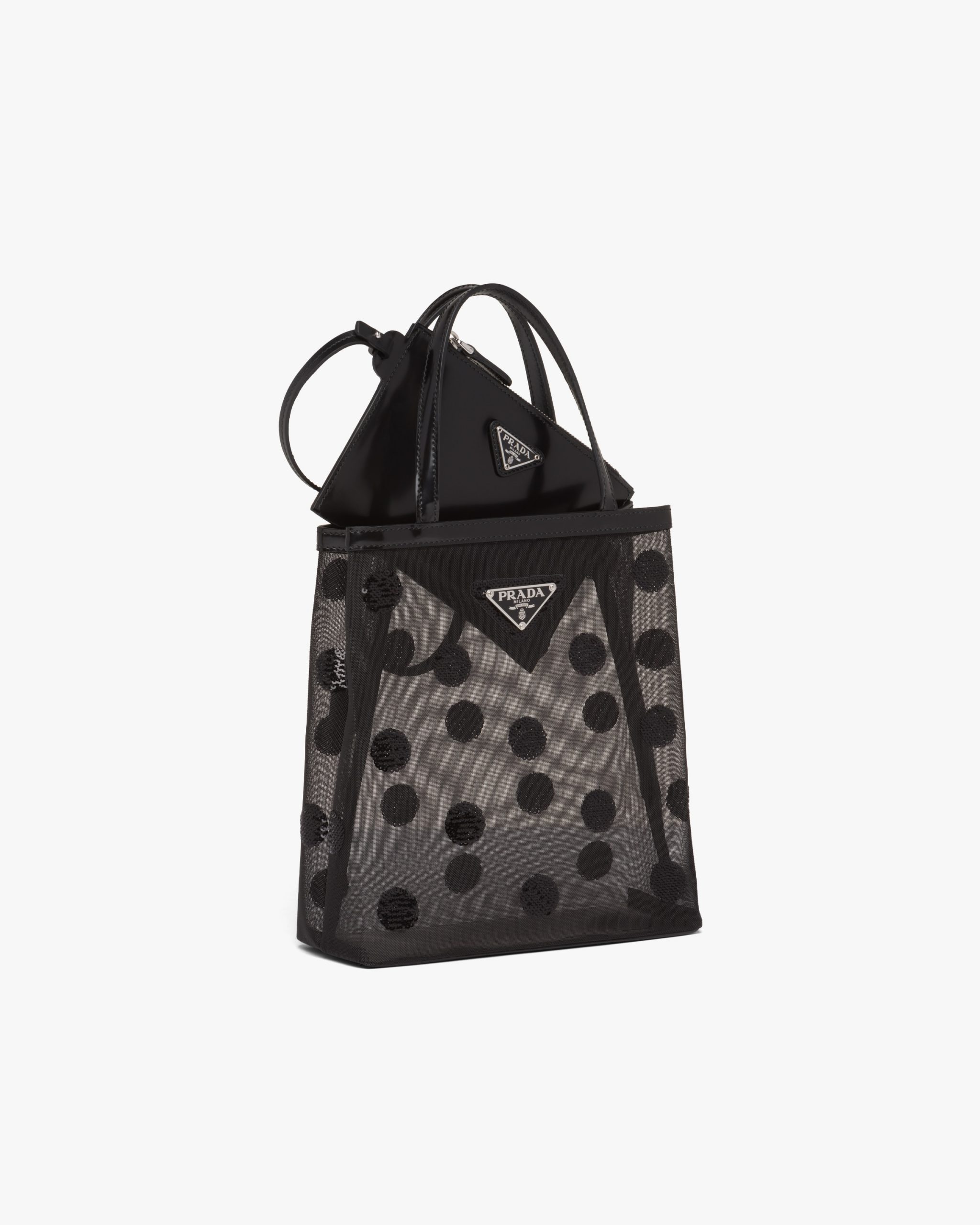 A contemporary soul and precious accents characterize this small mesh tote bag decorated with a sophisticated sequin polka-dot motif. Provided with a double handle and defined by its sleek design, the accessory with leather trim has a removable pouch inside and is decorated with Prada’s iconic enameled metal triangle logo2.