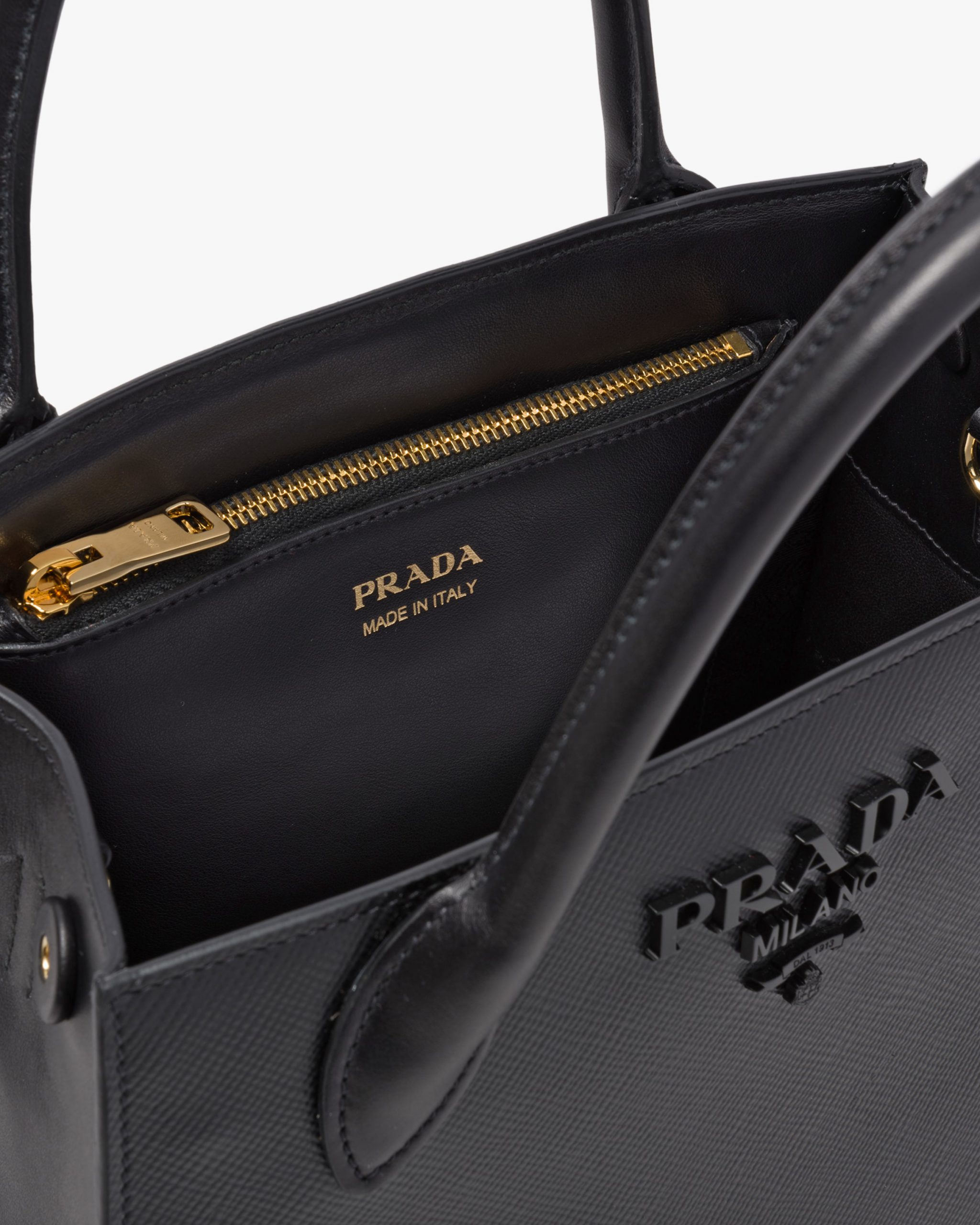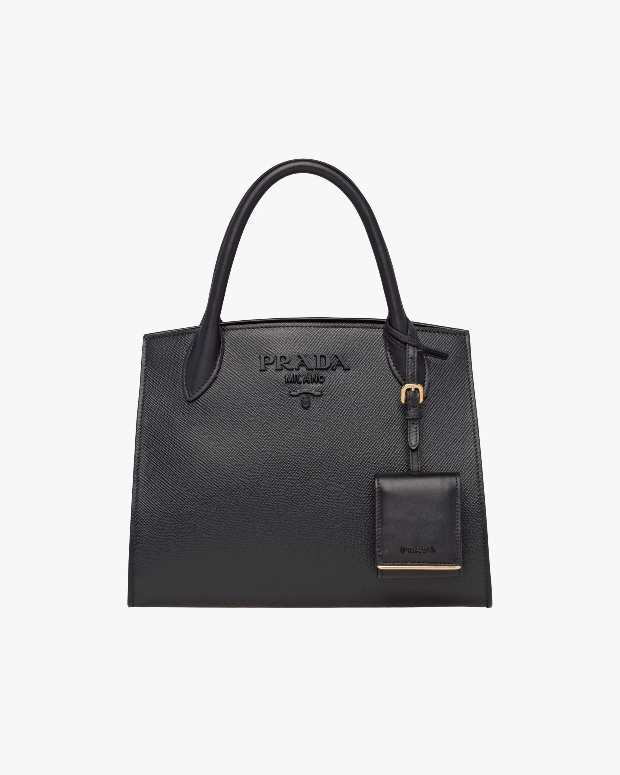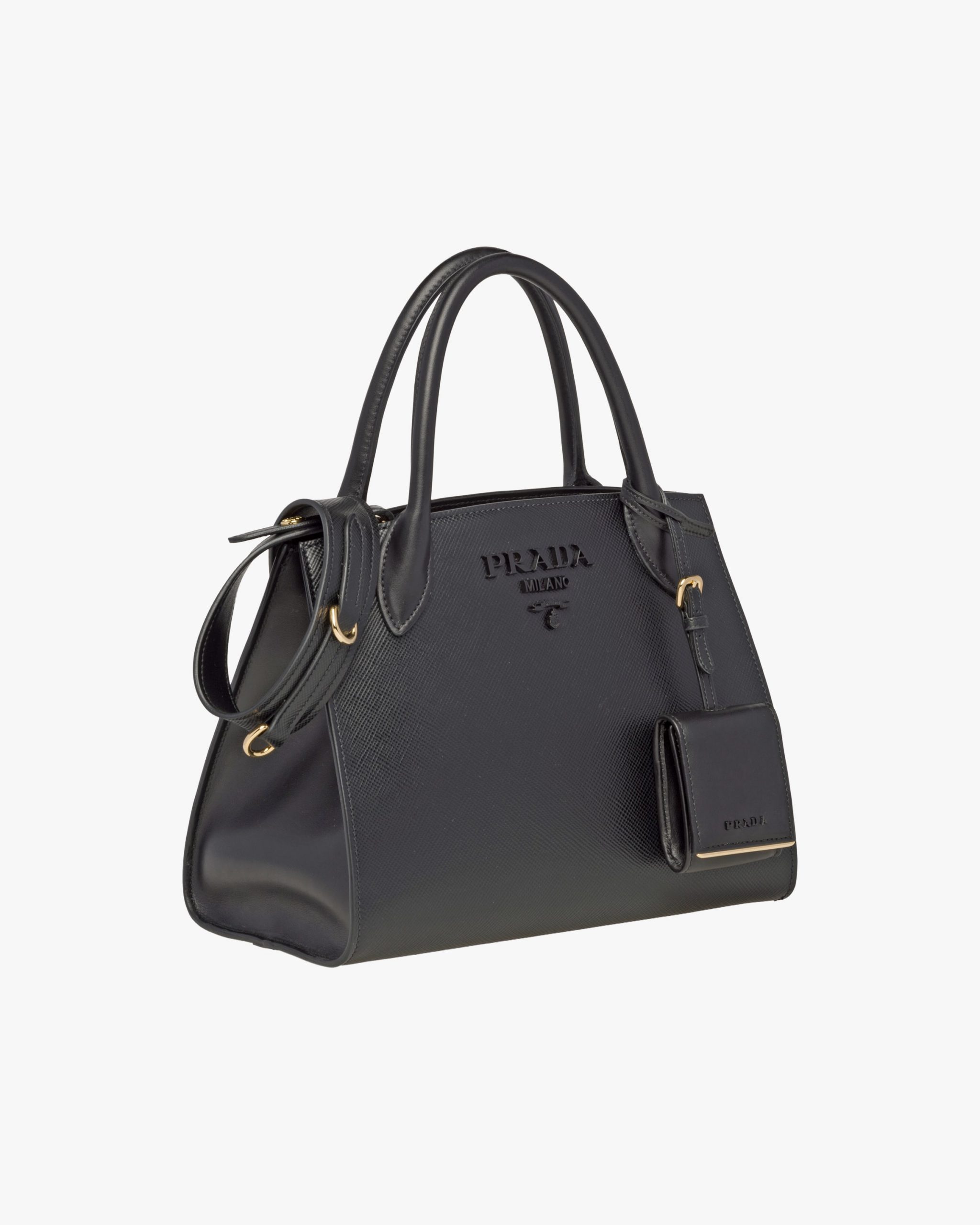 The refined front of the bag is completely monochrome. Made of fine Saffiano leather, it is characterized by the distinctive tone-on-tone effect of the metal lettering logo2.