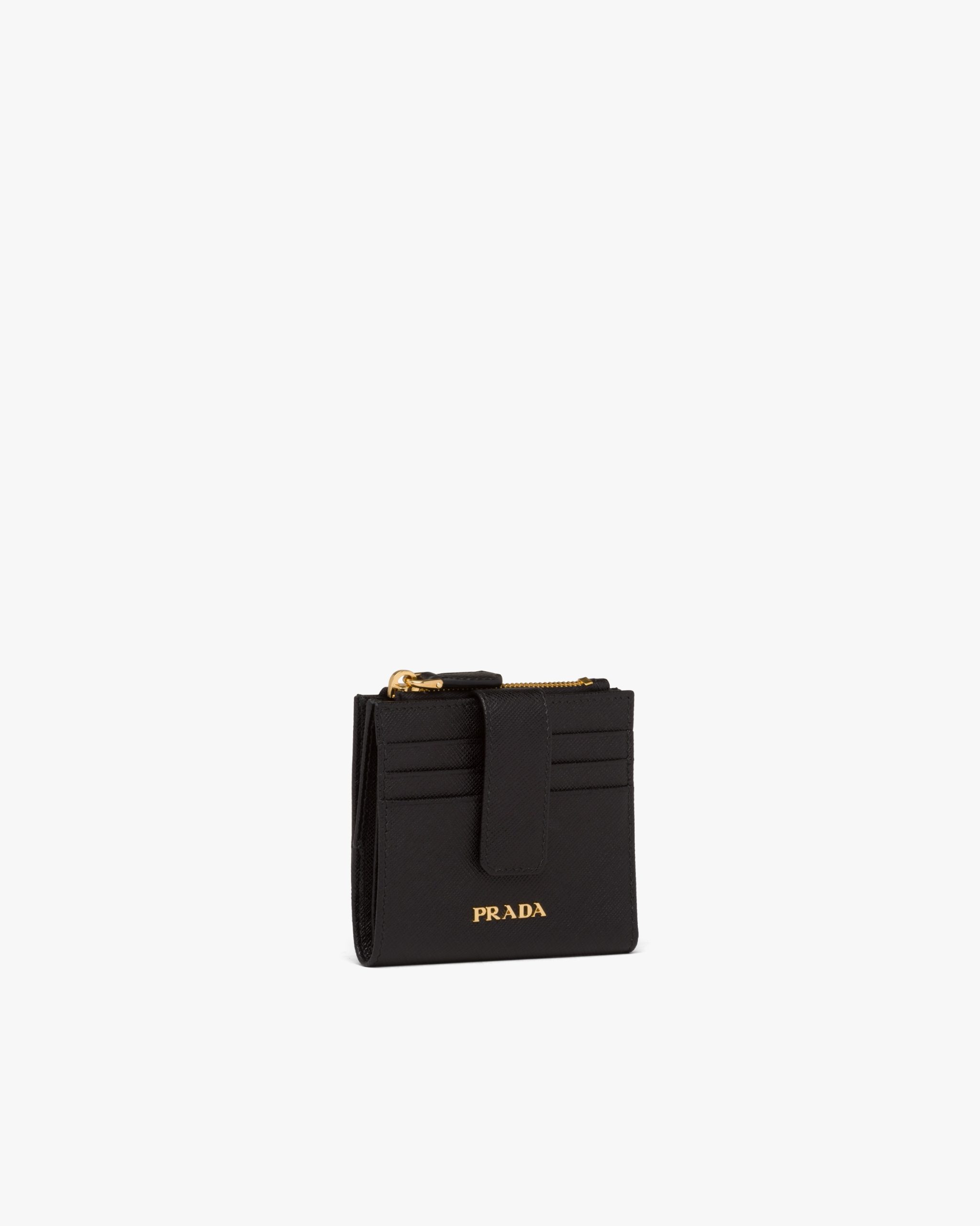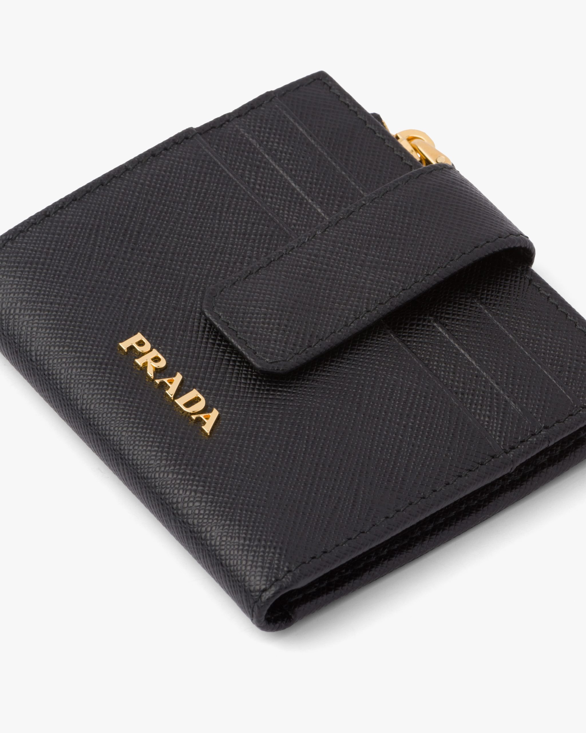 This small wallet is made of Saffiano, an iconic Prada material: calf leather of the highest quality, defined by a crosshatch texture and a waxed finish. The lettering logo2 decorates the accessory.