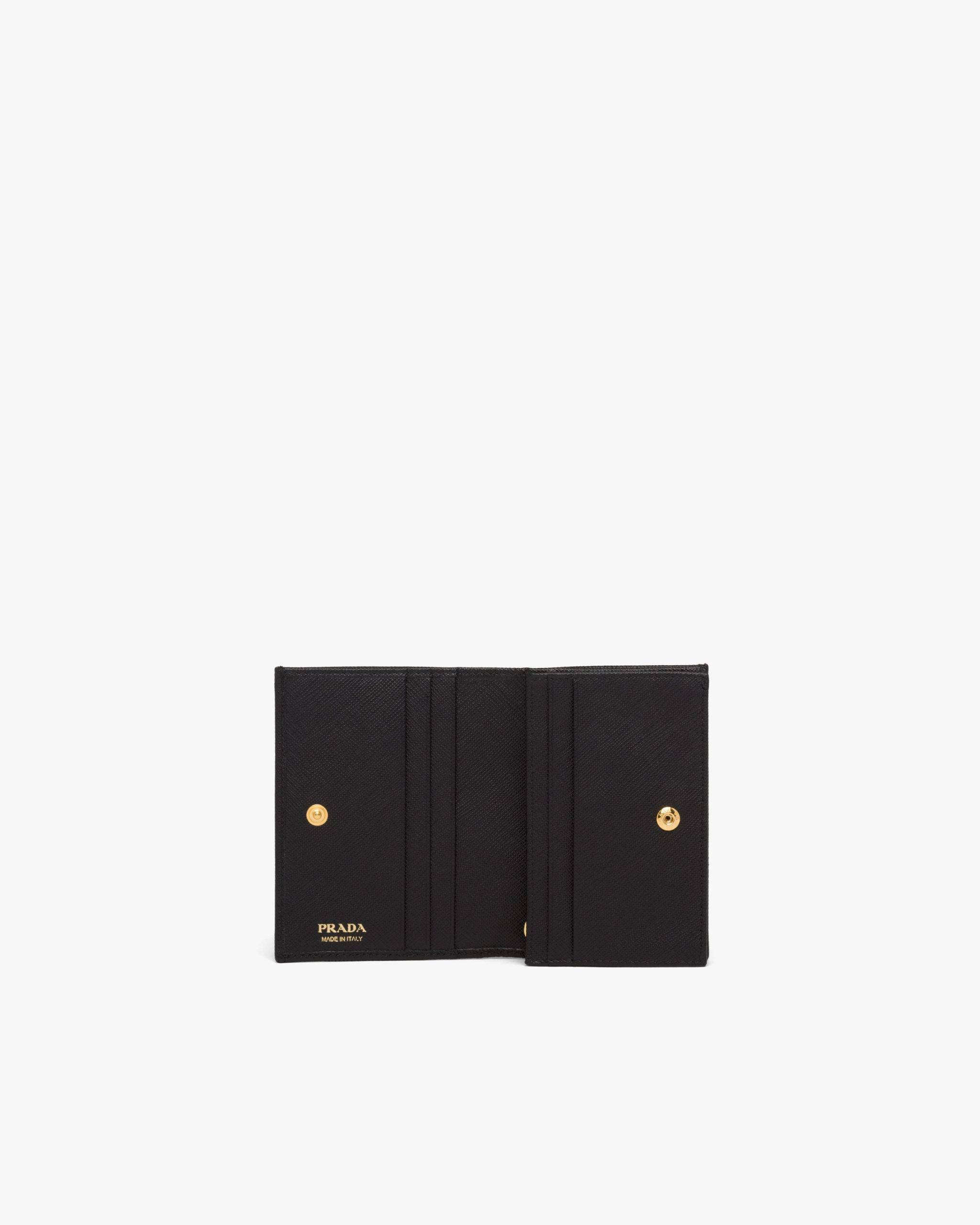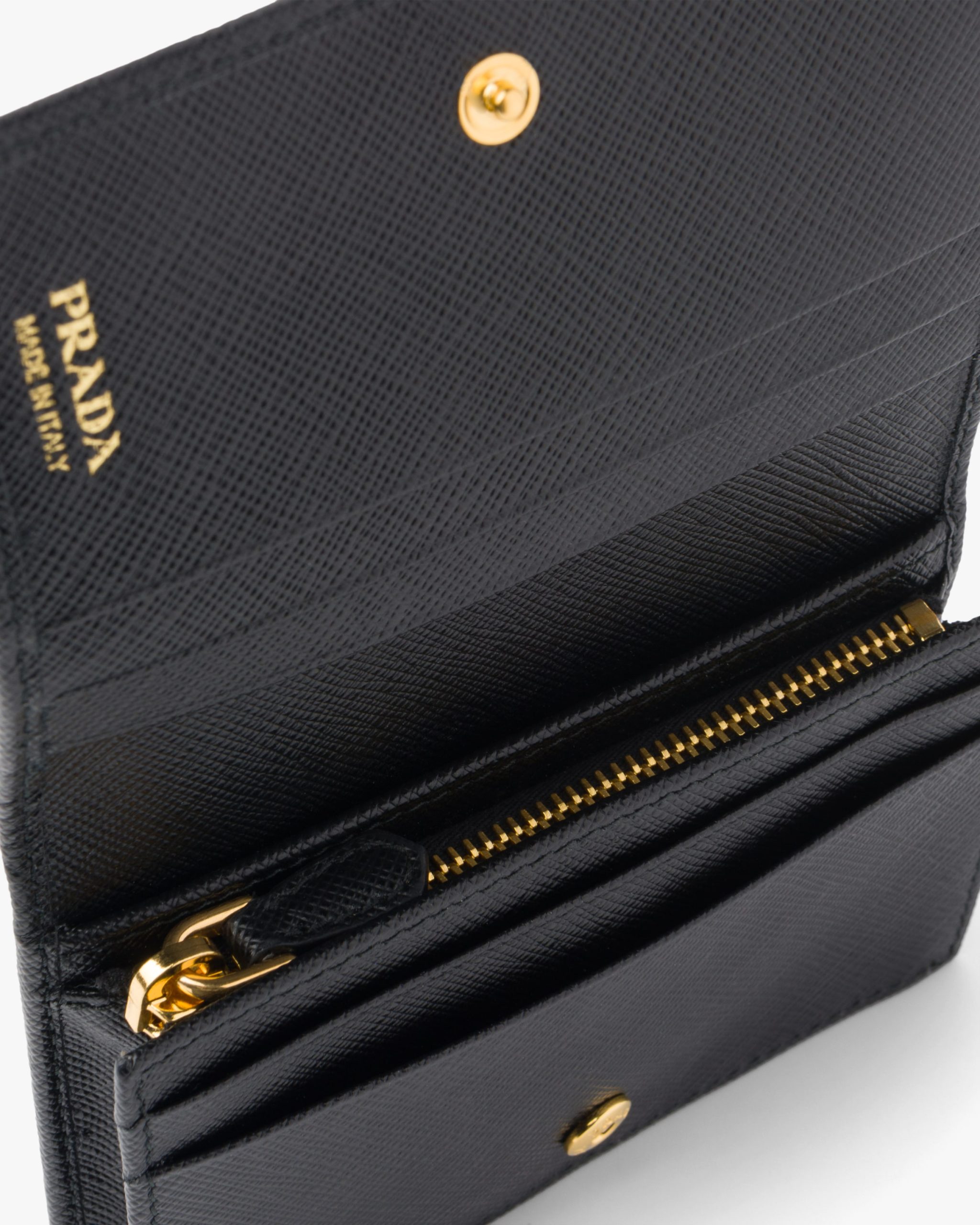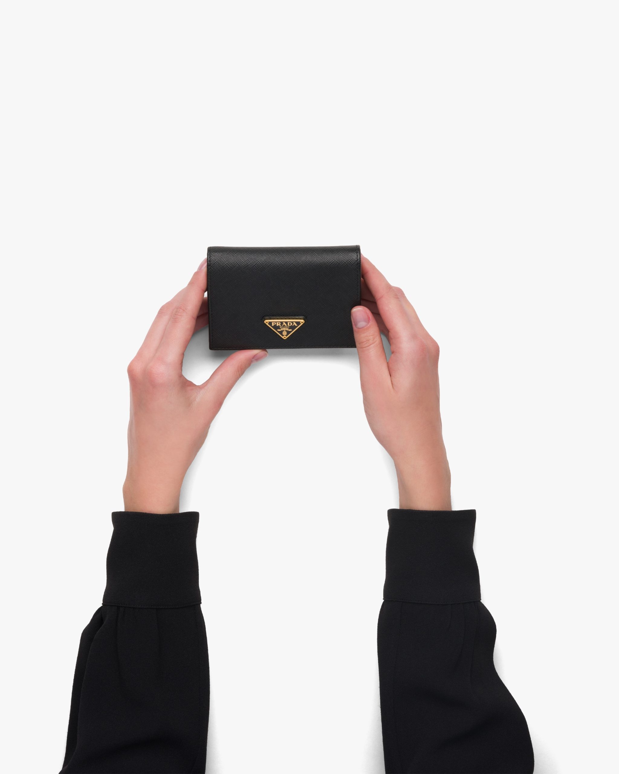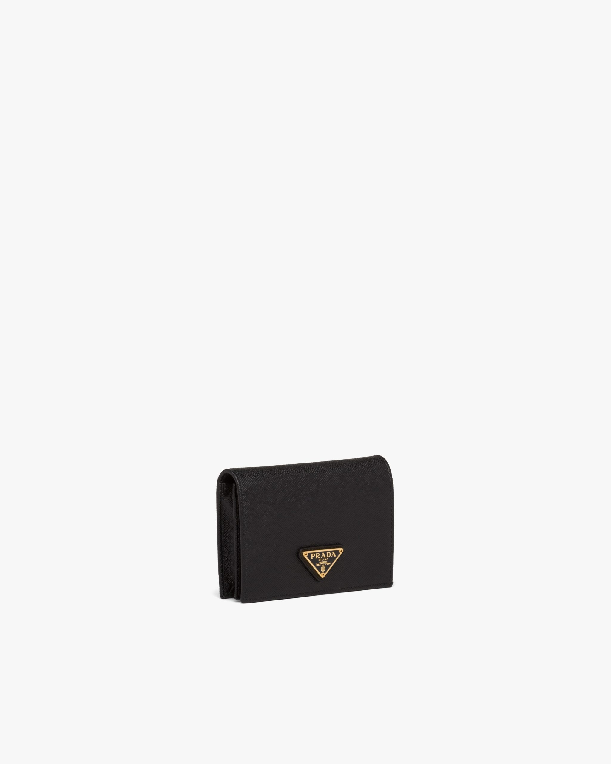 This Saffiano leather wallet with enameled metal triangle logo2 expresses sleek elegance. The accessory with clean lines has a zipper coin compartment, bill compartment, and five card slots.