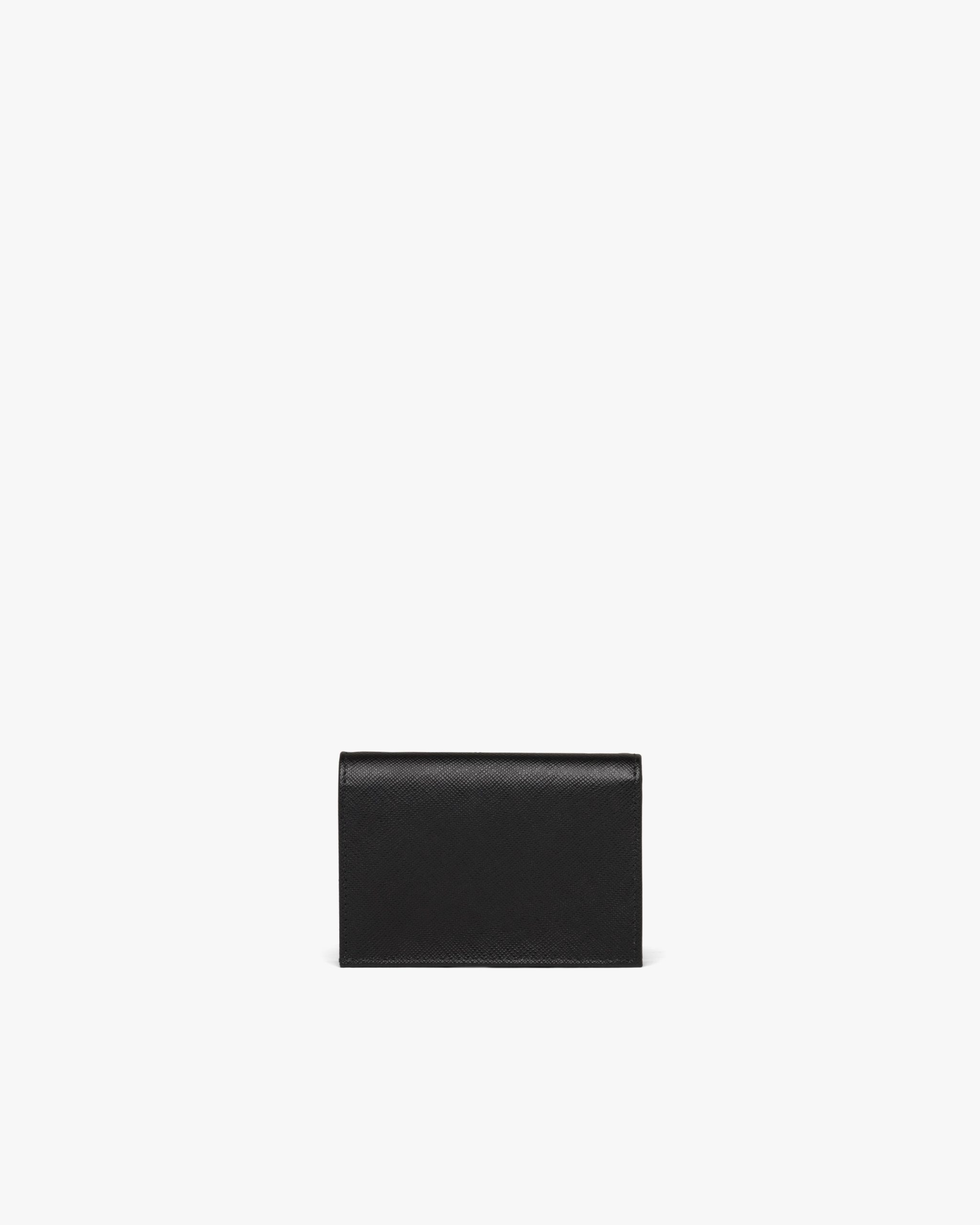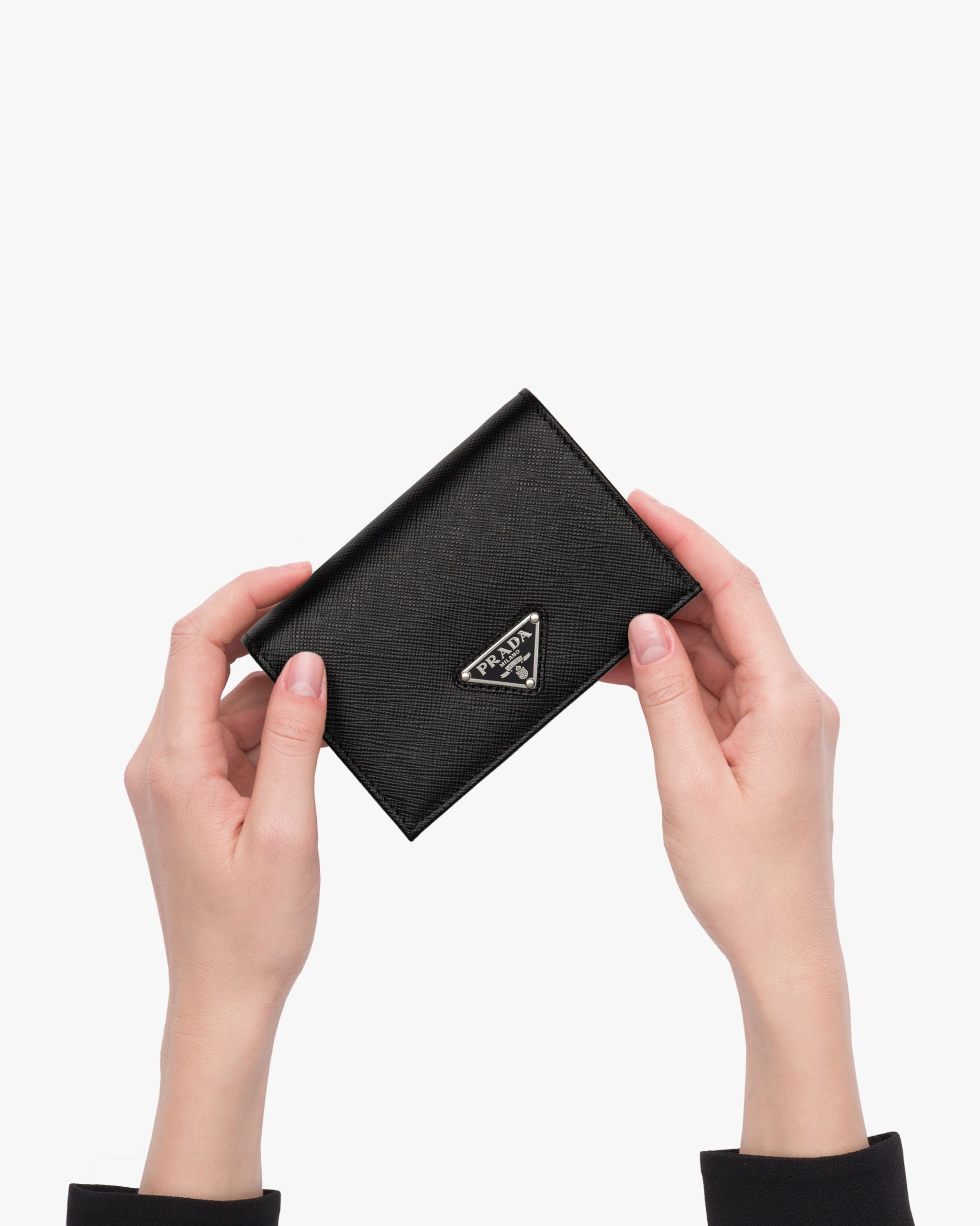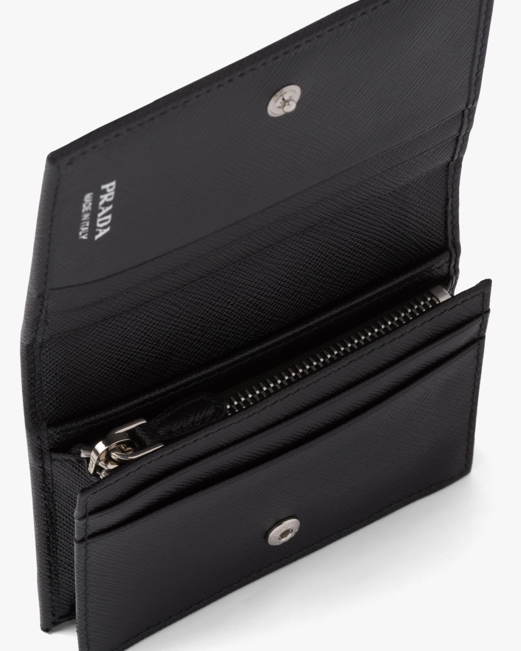 This Saffiano leather wallet with enameled metal triangle logo2 expresses sleek elegance. The accessory with clean lines has a zipper coin compartment, bill compartment, and five card slots.