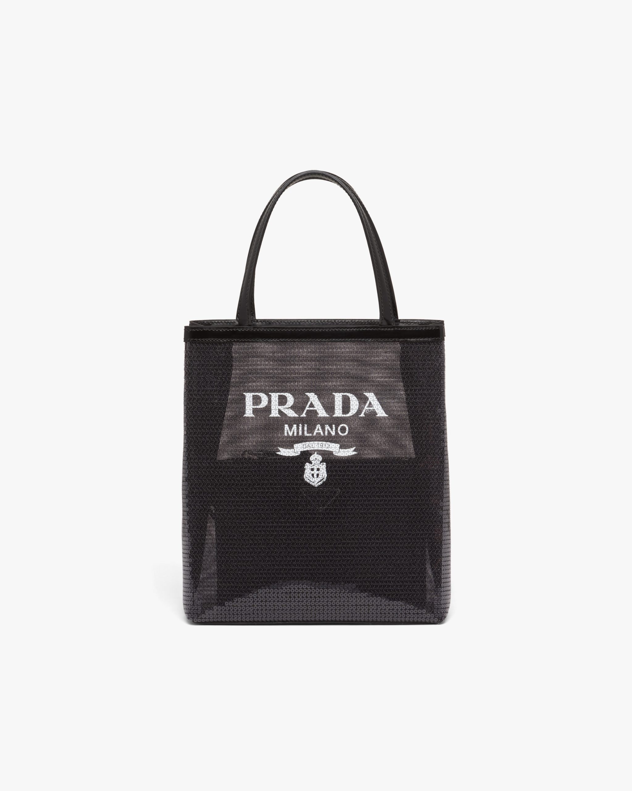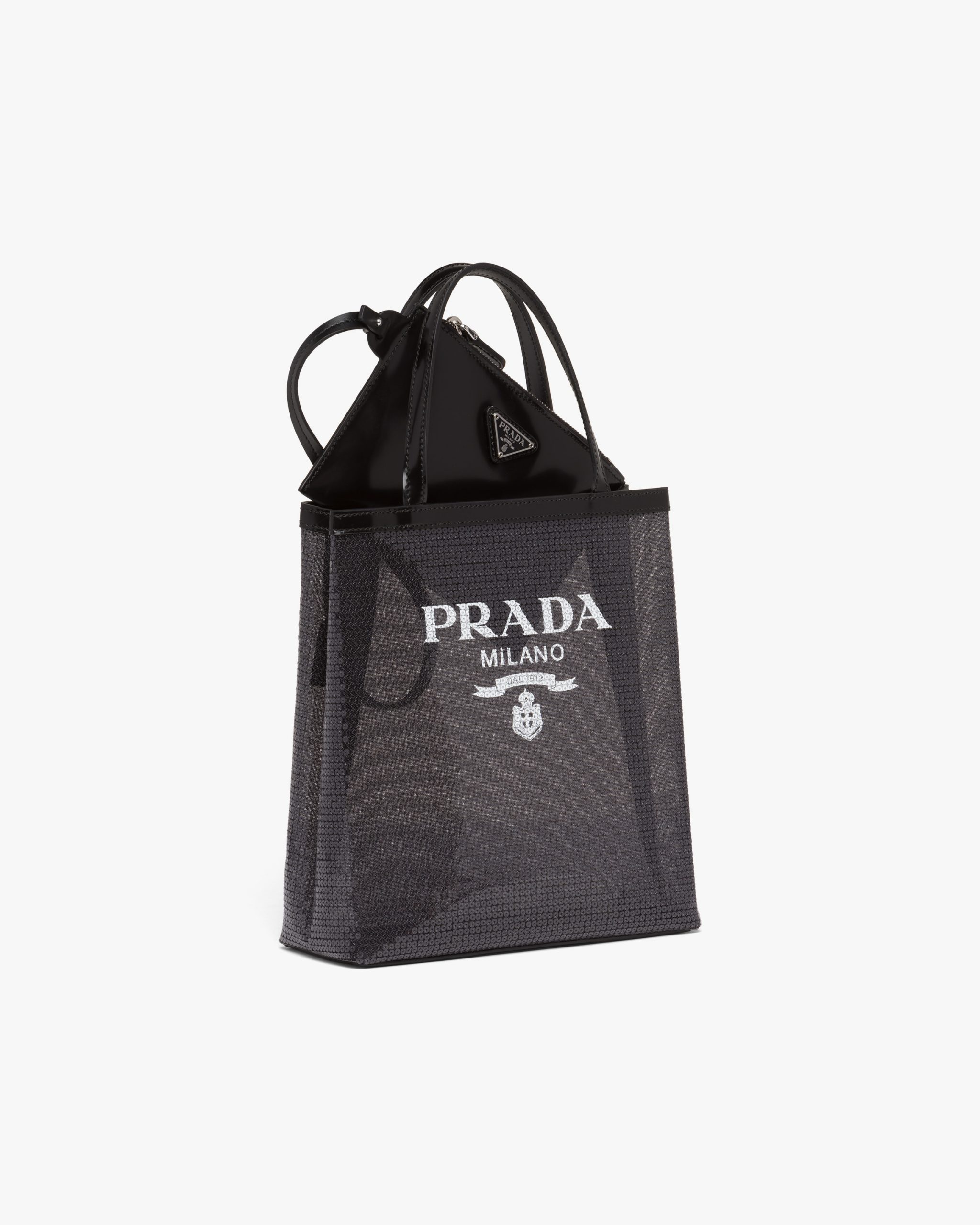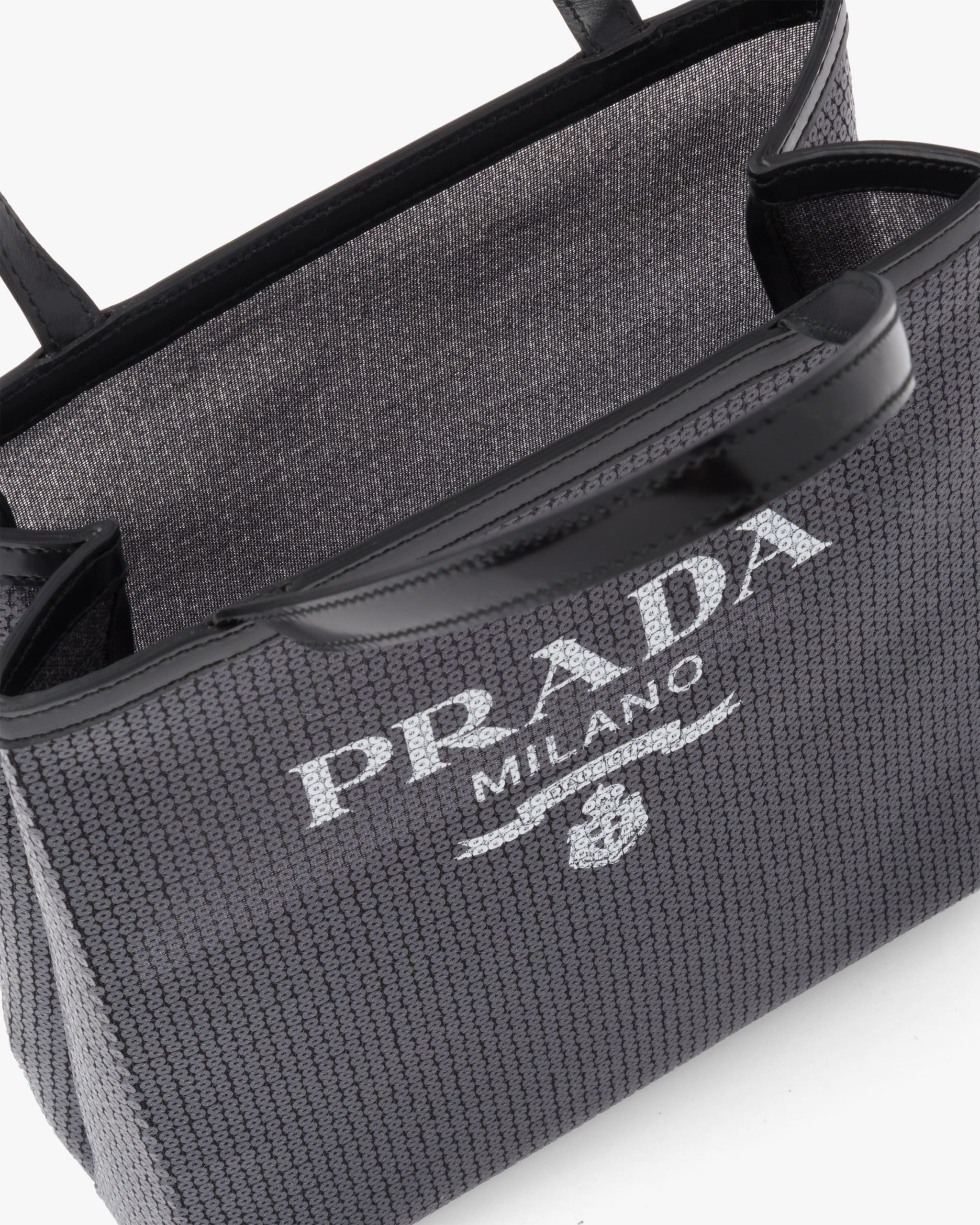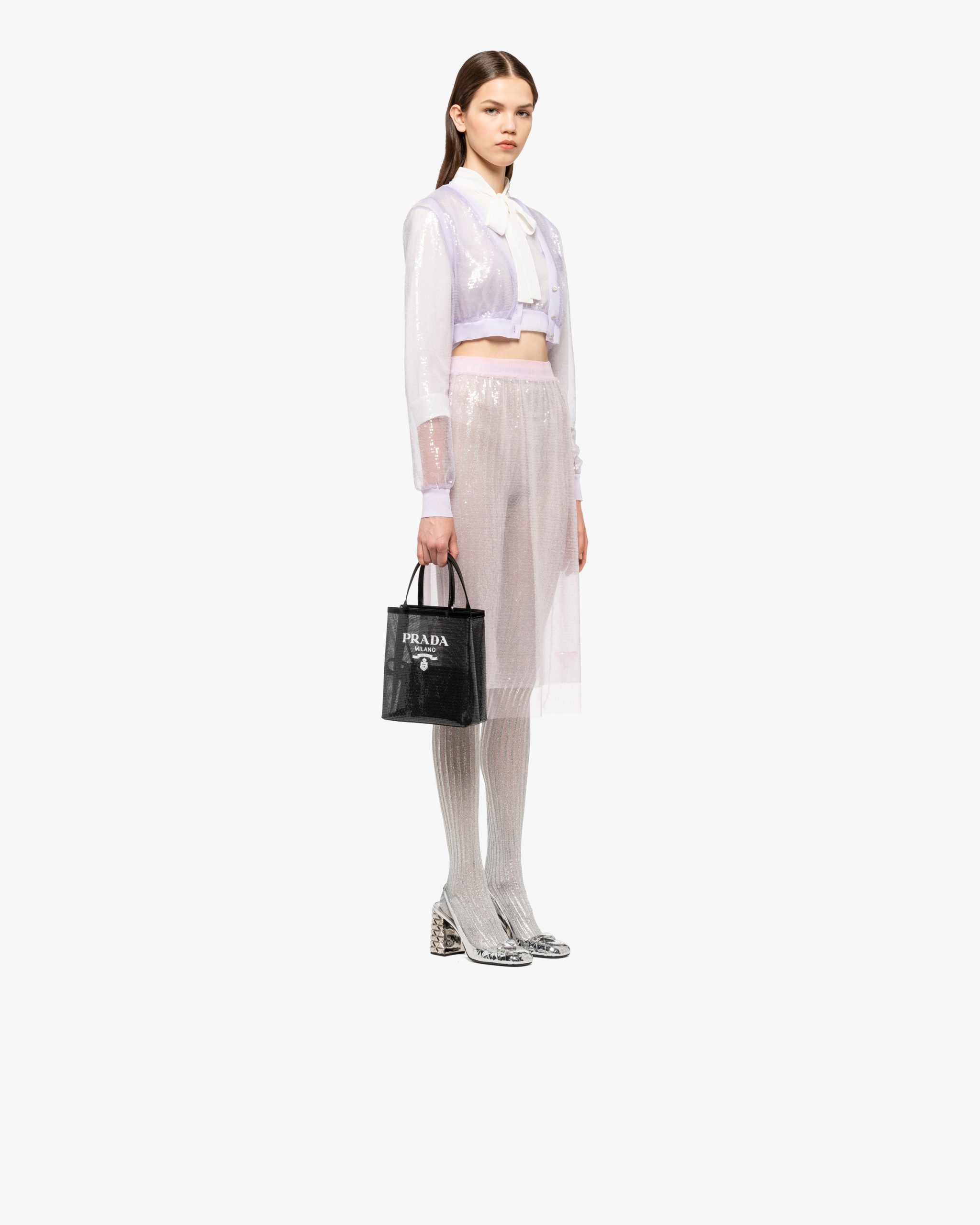 A contemporary soul and precious accents characterize this small tote bag entirely covered with sequins and embellished with the lettering logo2 printed on the front. Provided with a double handle and defined by its sleek design, the accessory with leather trim has a removable pouch inside.