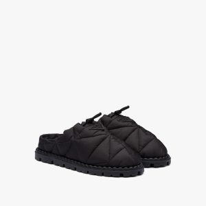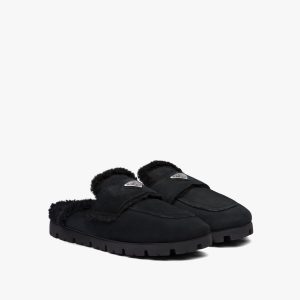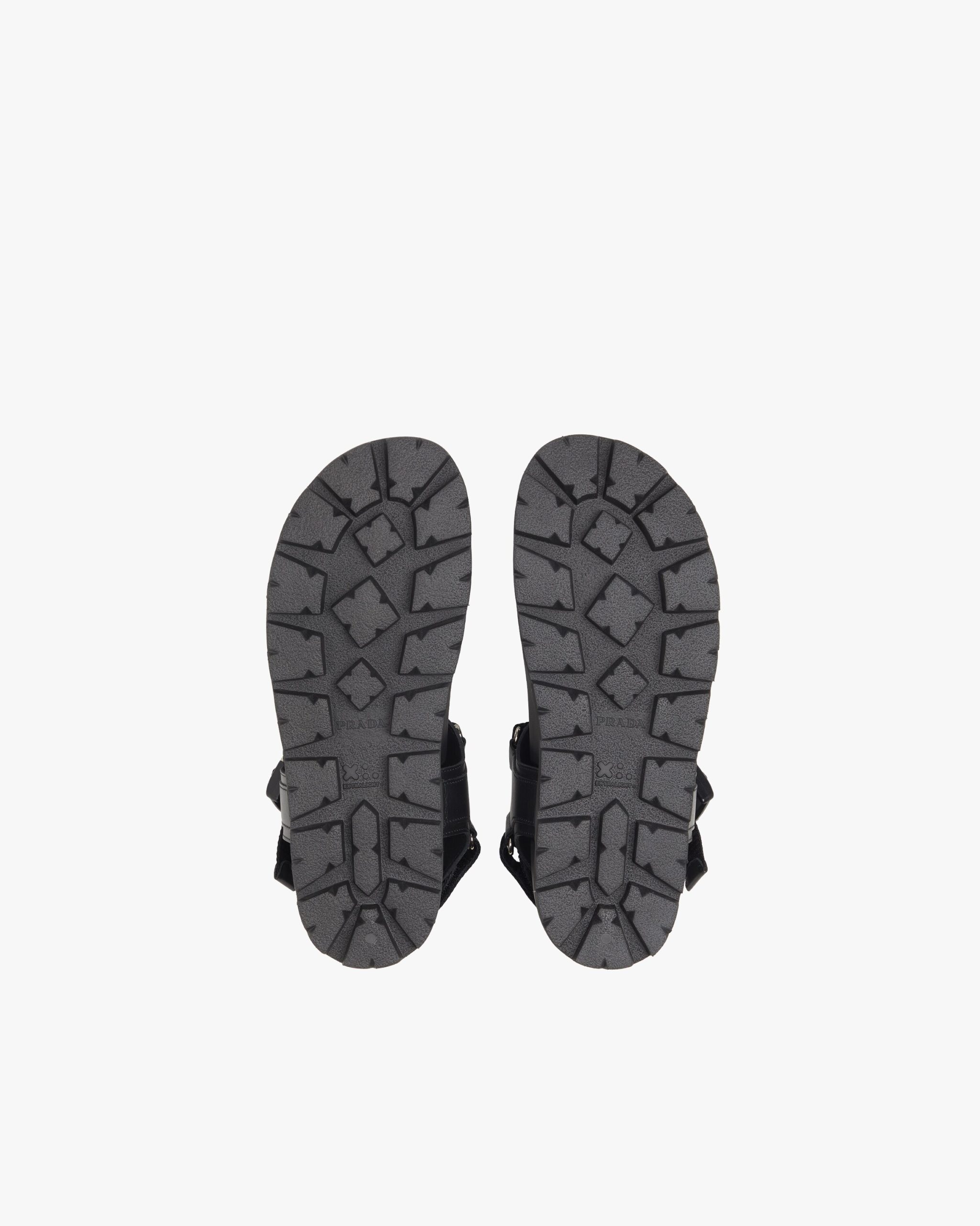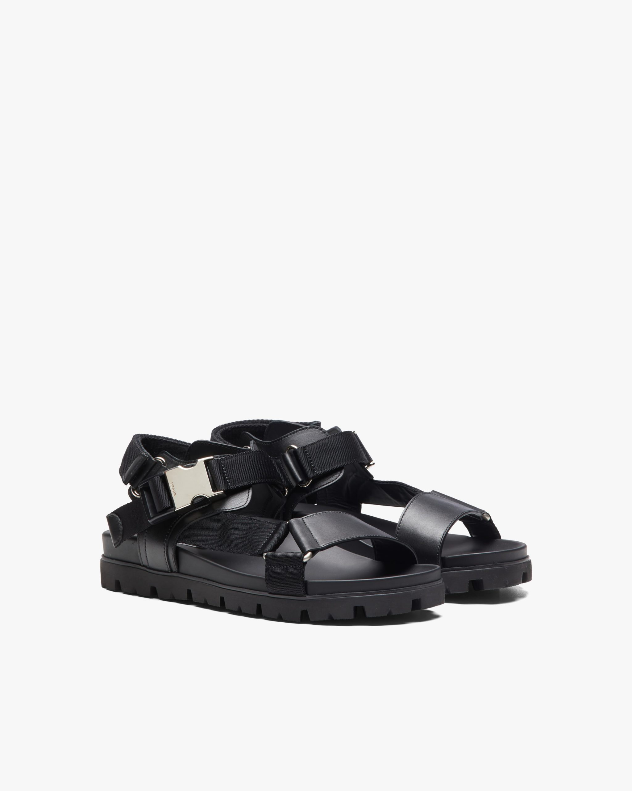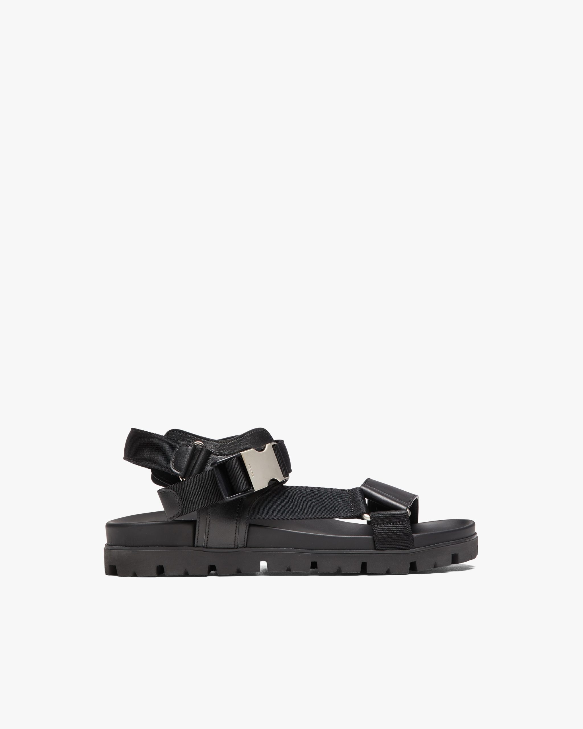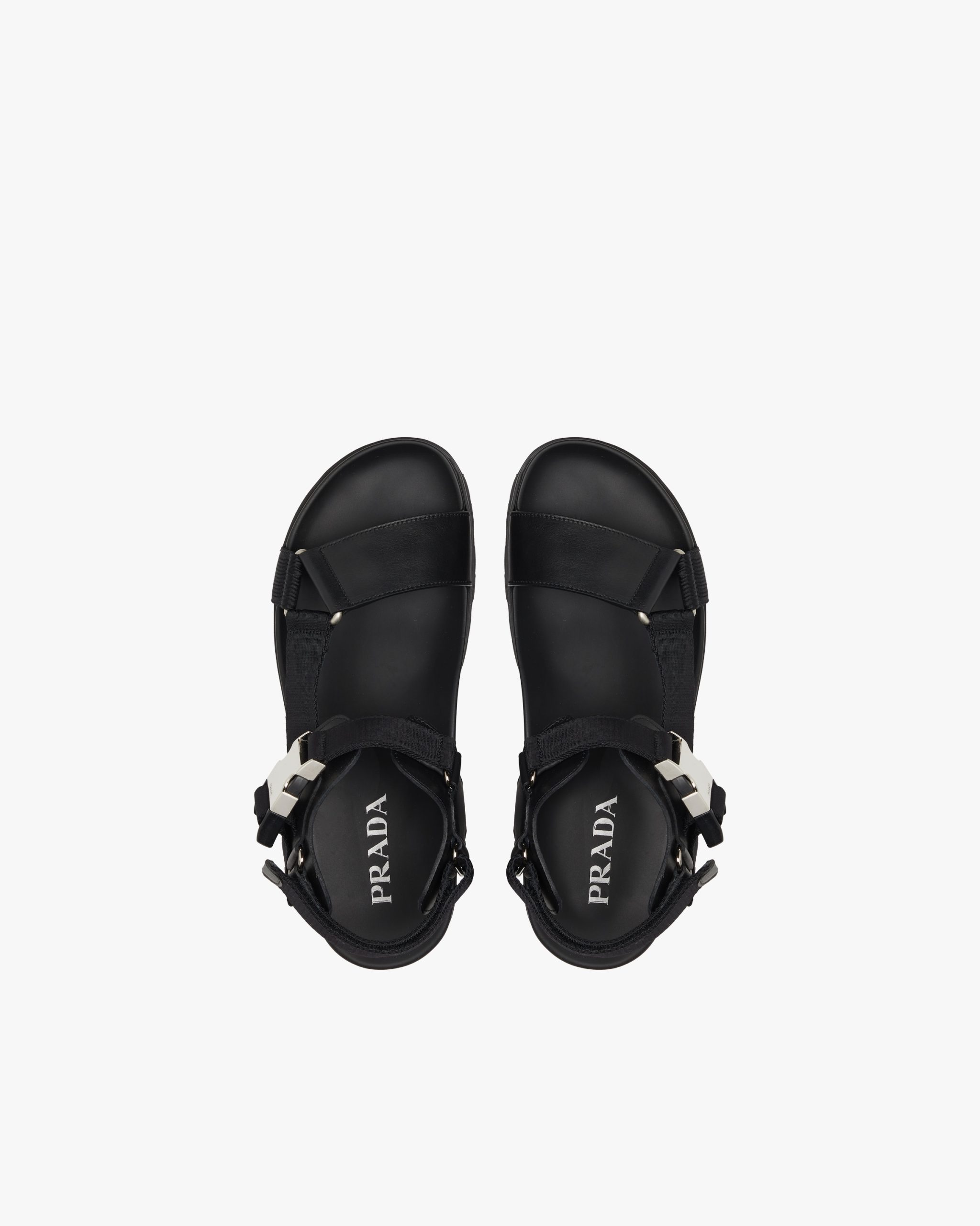 These leather and nylon tape sandals with modern elegance are characterized by the metal side-release buckle engraved with the Prada logo2. The rubber lug sole contrasts with the minimalist, urban allure of the upper.