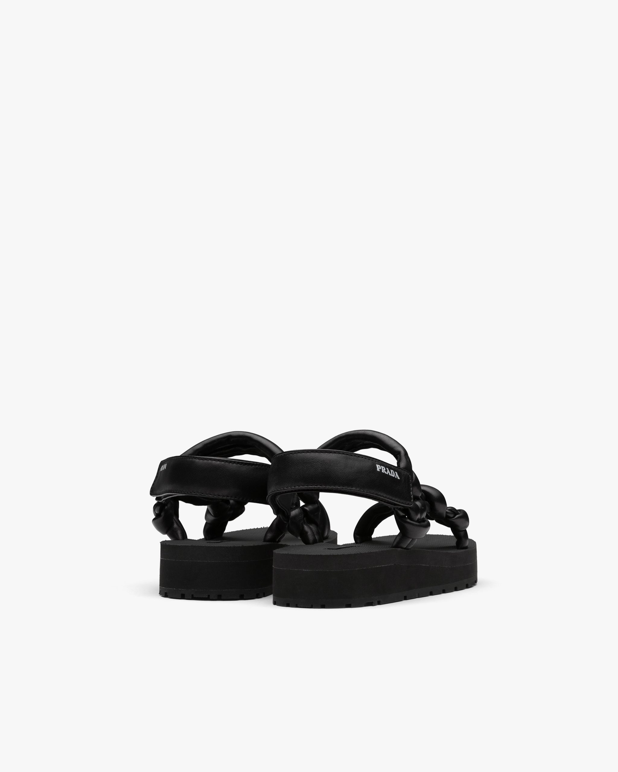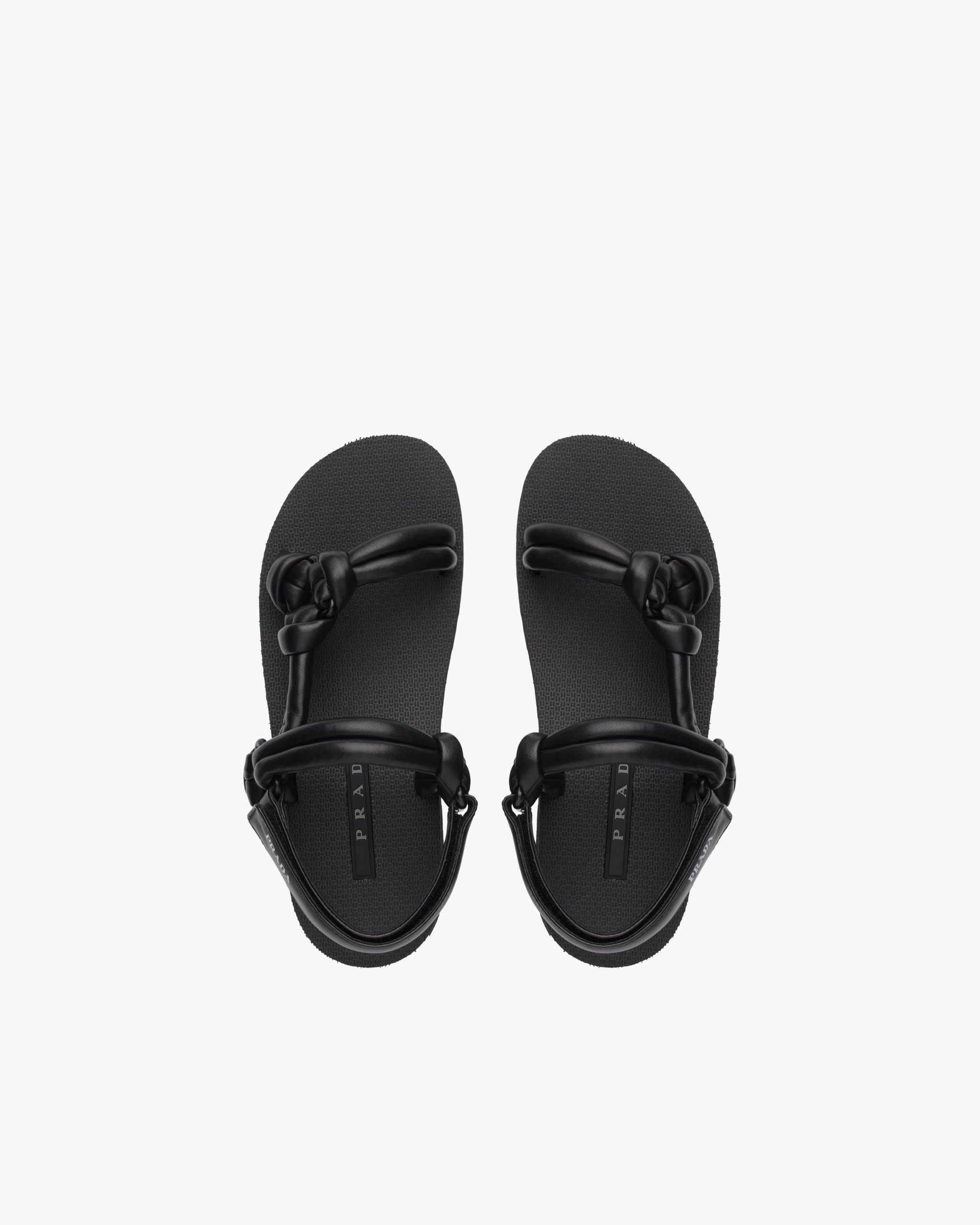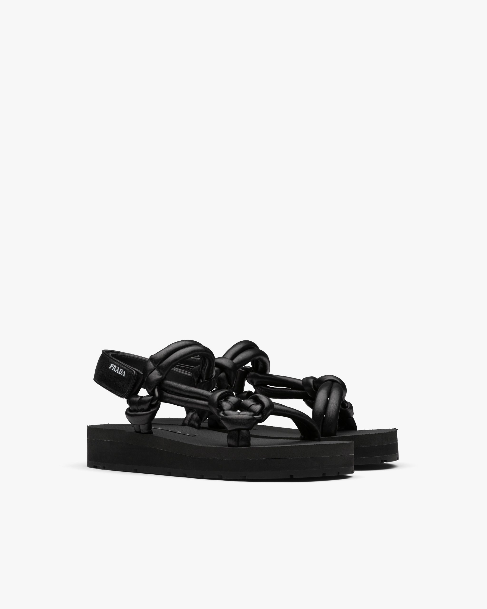 The hybrid concept, which is part of Prada’s genetic code, is translated in a design that blends different influences and contrasting materials to create interesting and unique combinations. Craftsmanship and a contemporary soul meet in this sporty sandal that combines tubular straps in soft nappa leather with hand-made knots and a light rubber flatform sole.