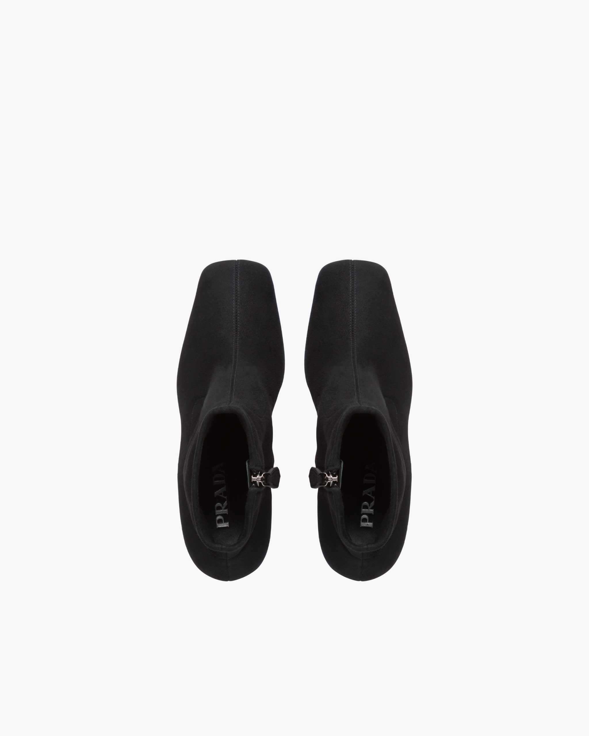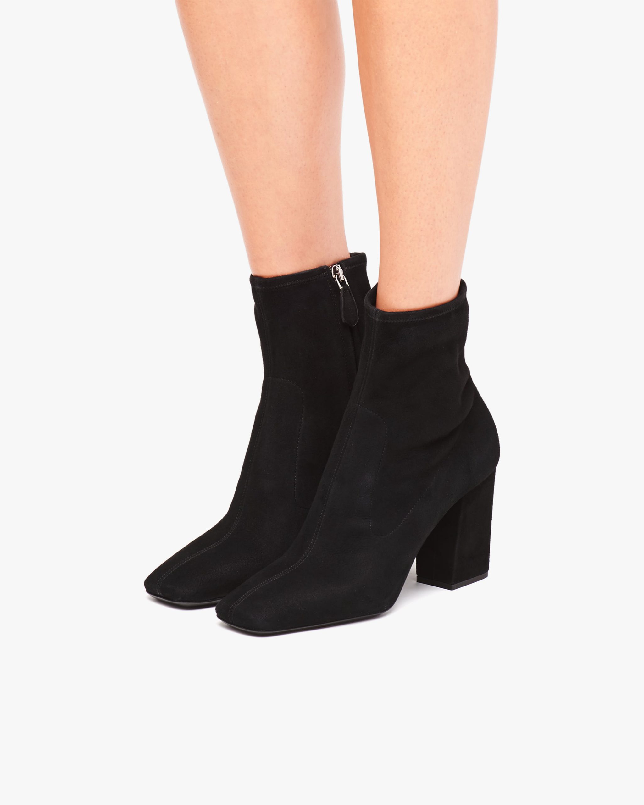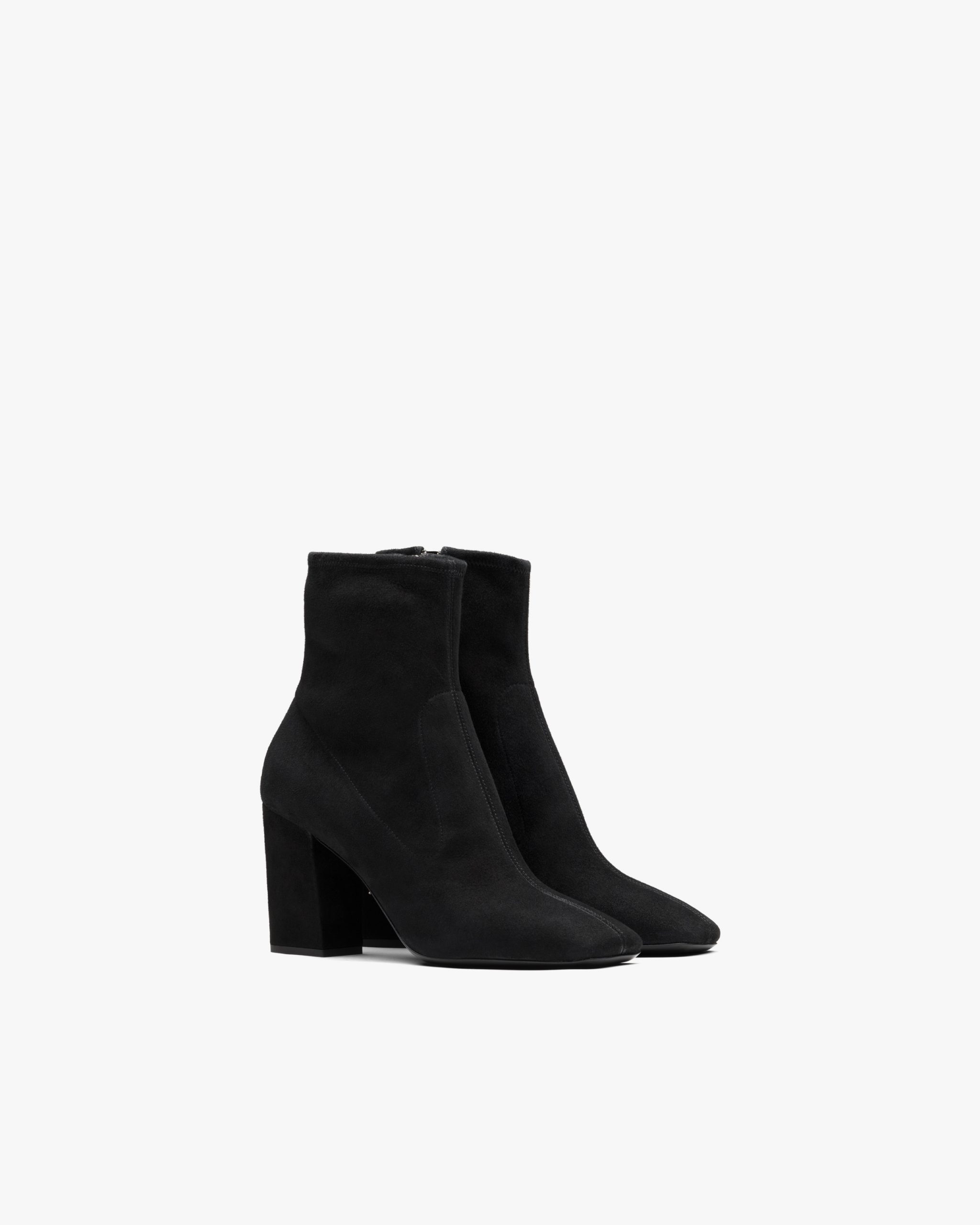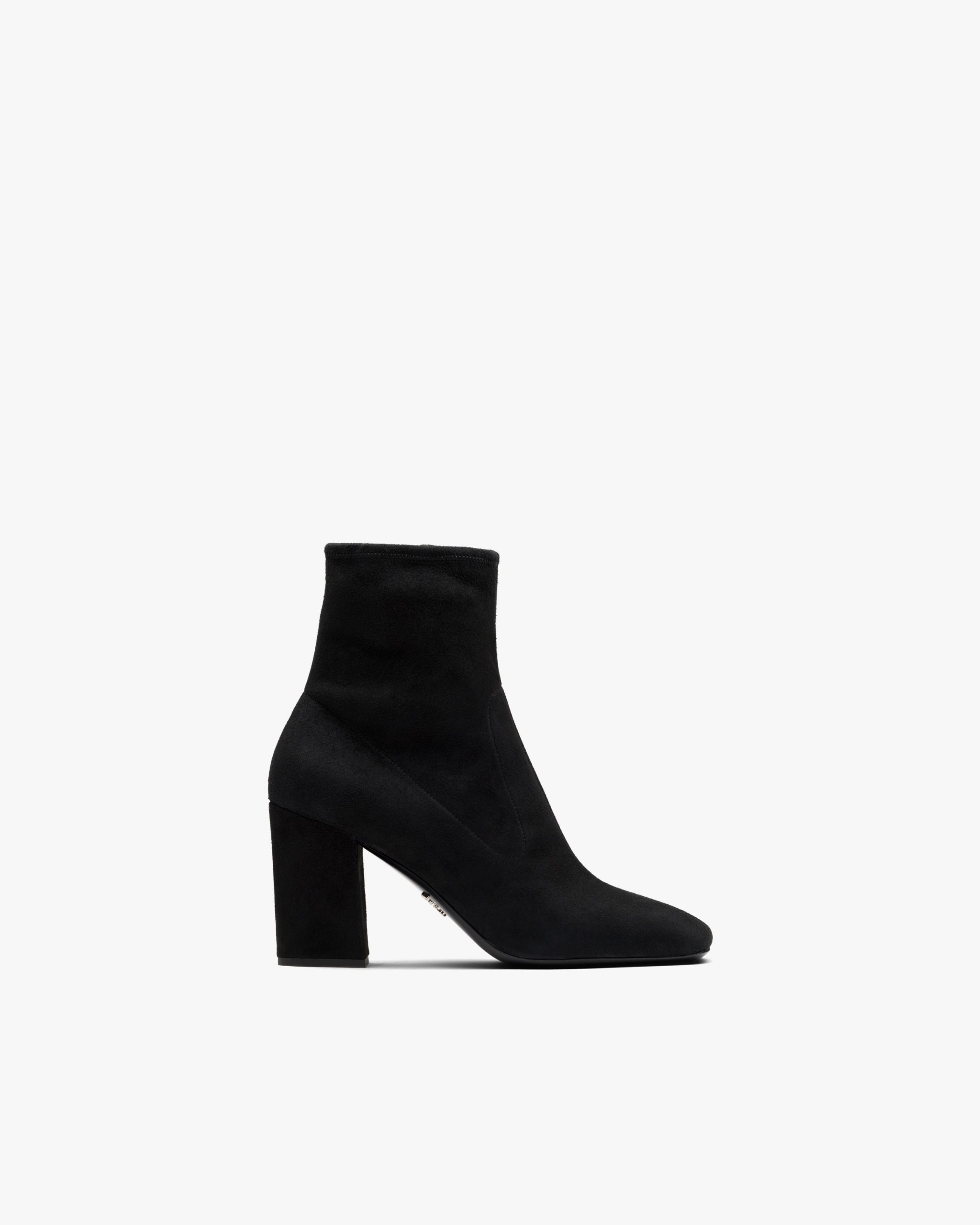 A feminine silhouette distinguishes these stretch suede booties with leather-covered high heel. The leather sole is embellished with the iconic metal lettering logo2.