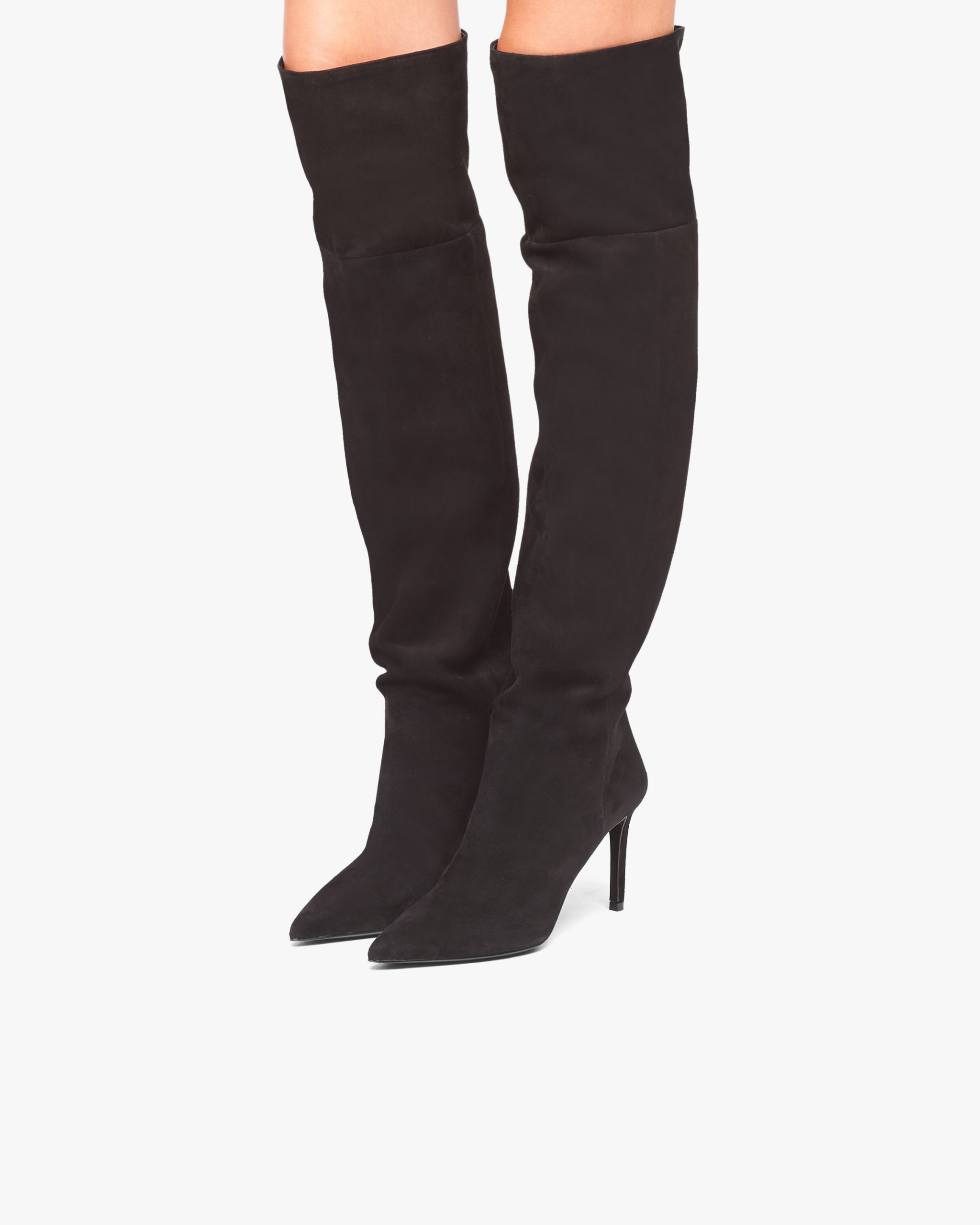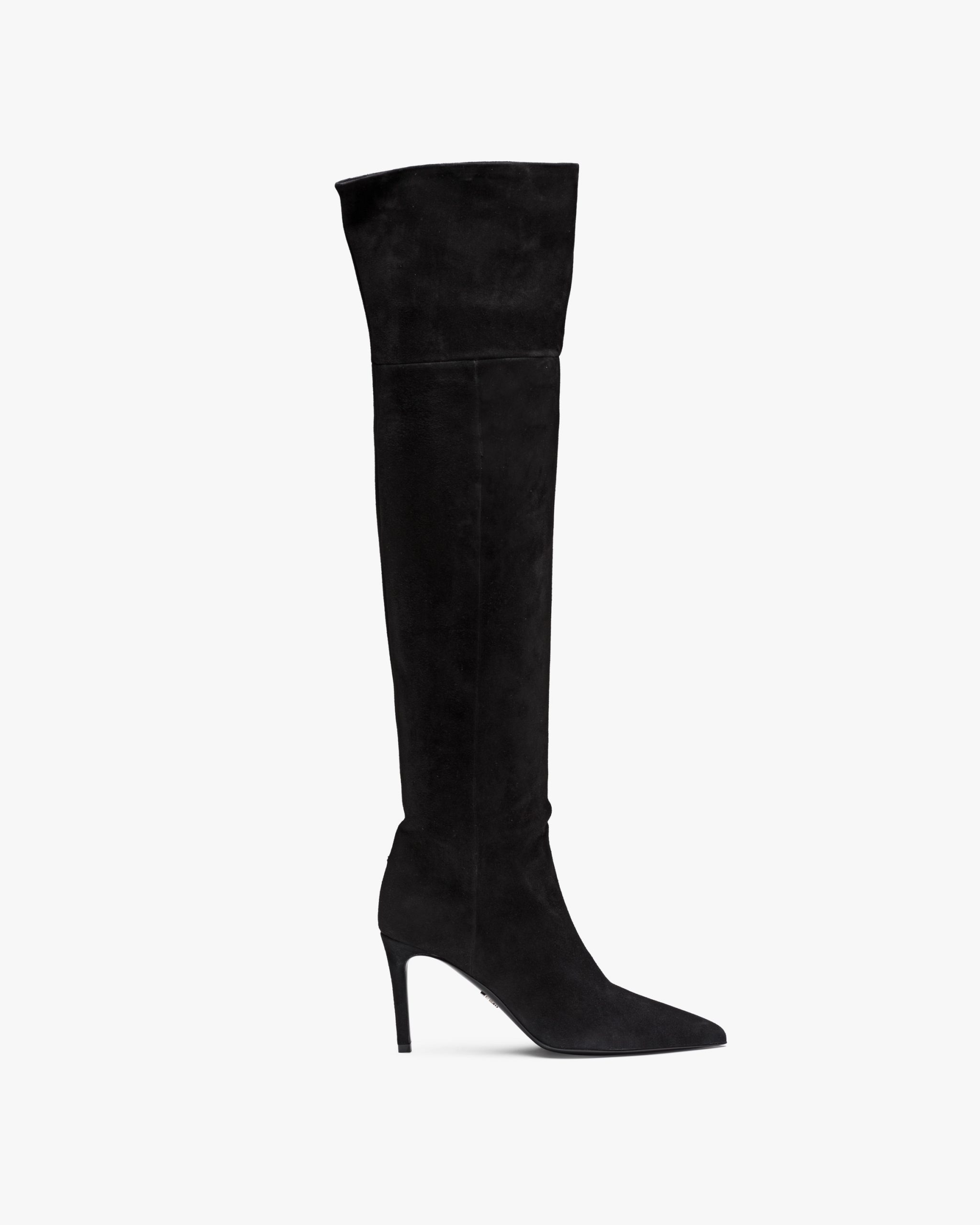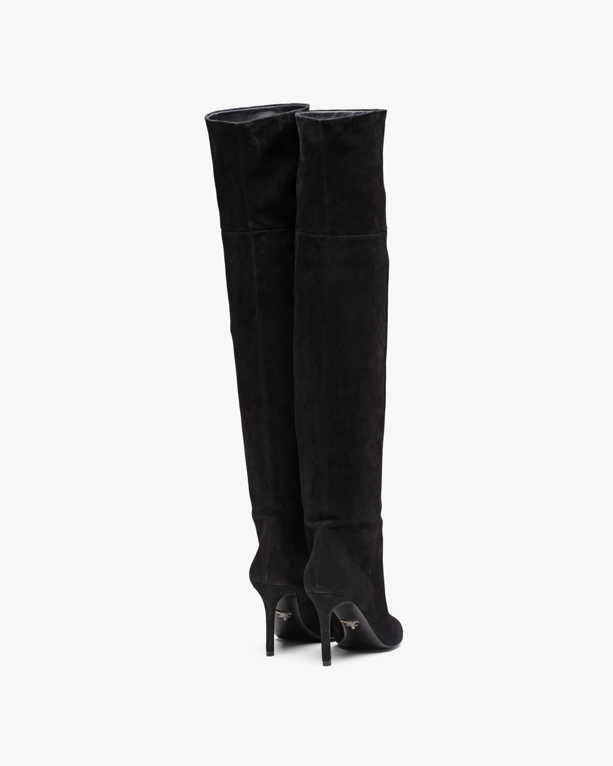 These suede boots have slender lines. They have a leather-covered high heel and are decorated with the metal lettering logo2 on the leather sole.
