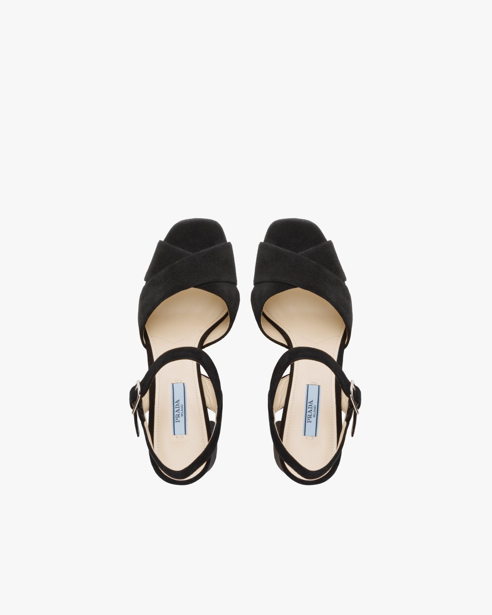 These suede sandals with high column heel are characterized by the double crisscross band on the front. The strap with metal buckle completes the design.