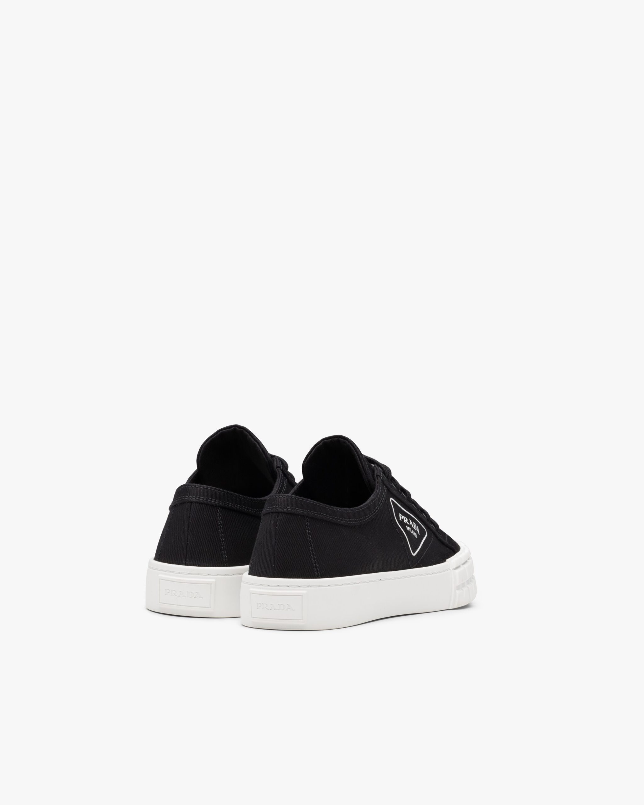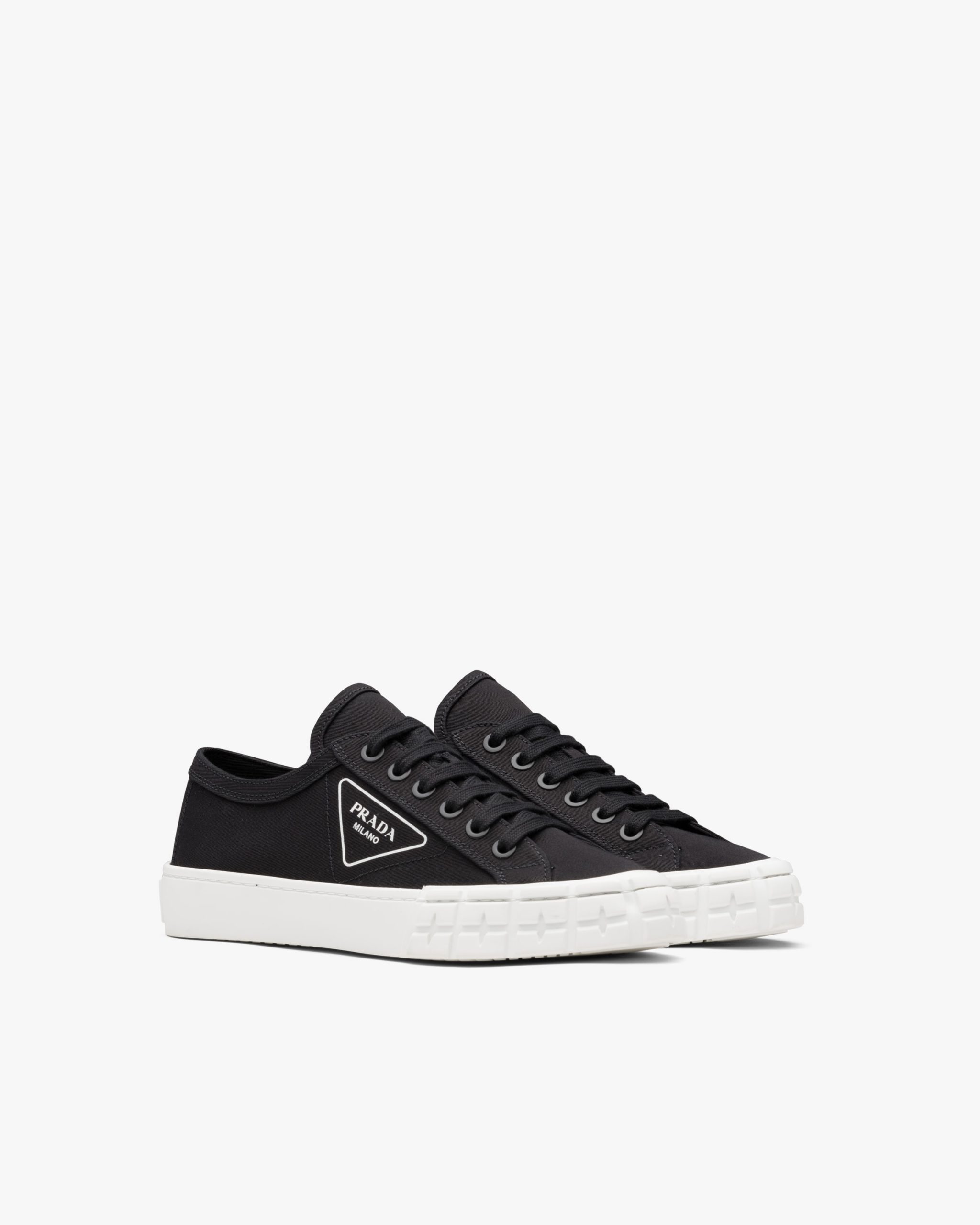 These gabardine fabric sneakers have a rubber sole with an innovative design. They have cotton laces and are decorated with the printed triangle logo2.