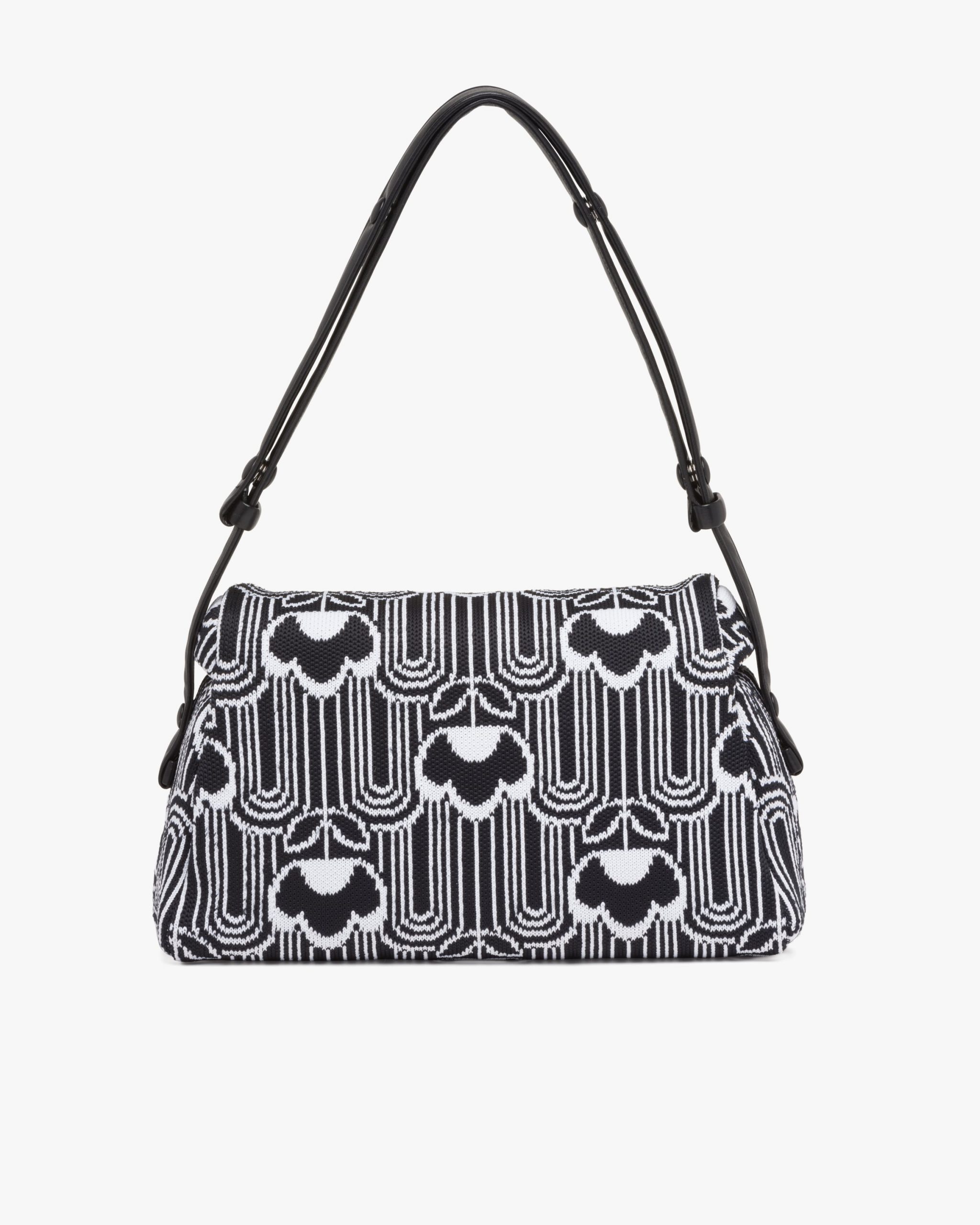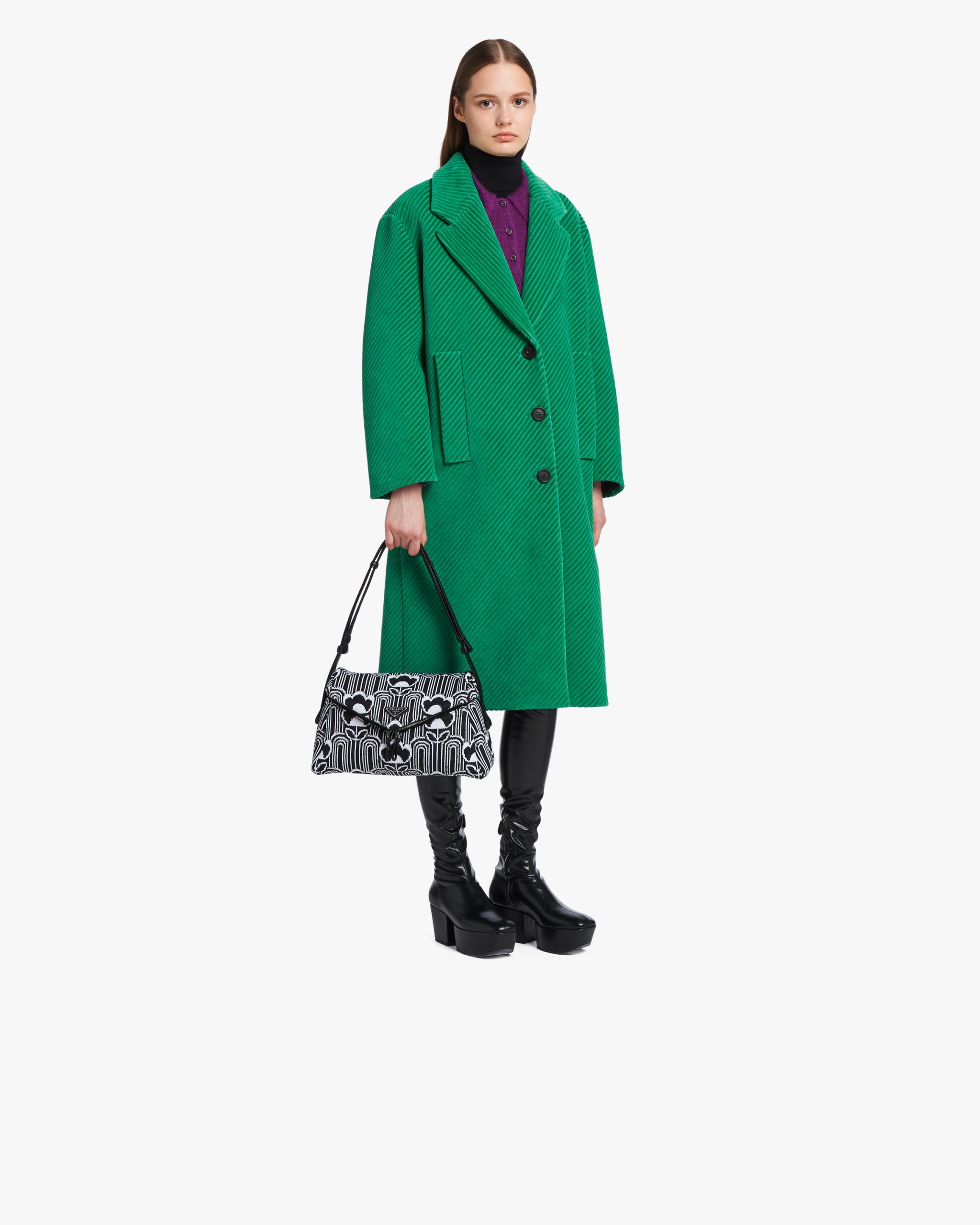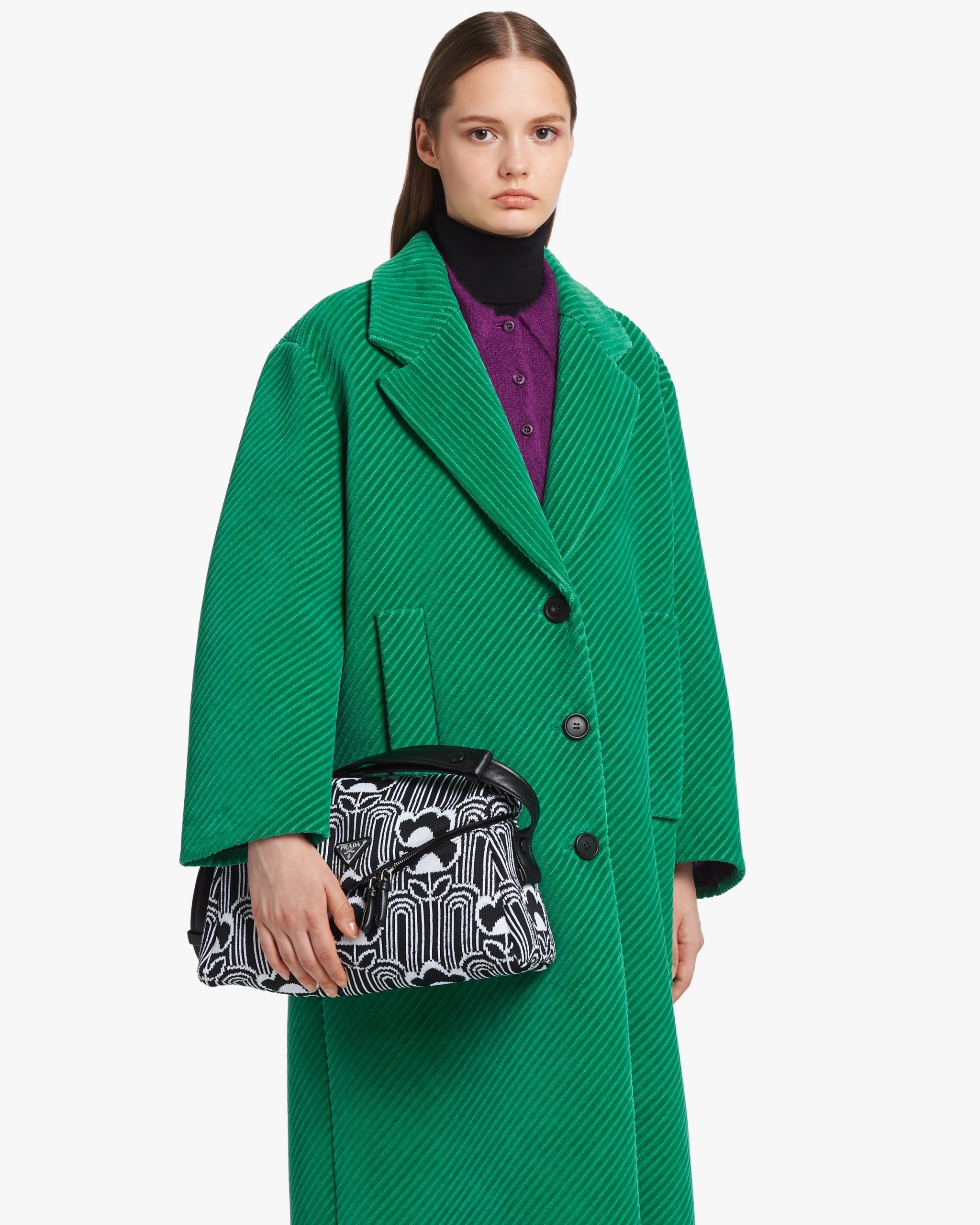 Emblematic of the Fall/Winter 2021 collectsion, geometric jacquard motifs with a sixties mood decorate this shoulder bag with a contemporary attitude and particular reverse seam construction. A study of the triangle inspires new geometric details and unique interpretations of the historic Prada logo2. The iconic shape appears in the large flap of this bag with sleek lines that has an adjustable leather shoulder strap so that it can be worn in different ways.