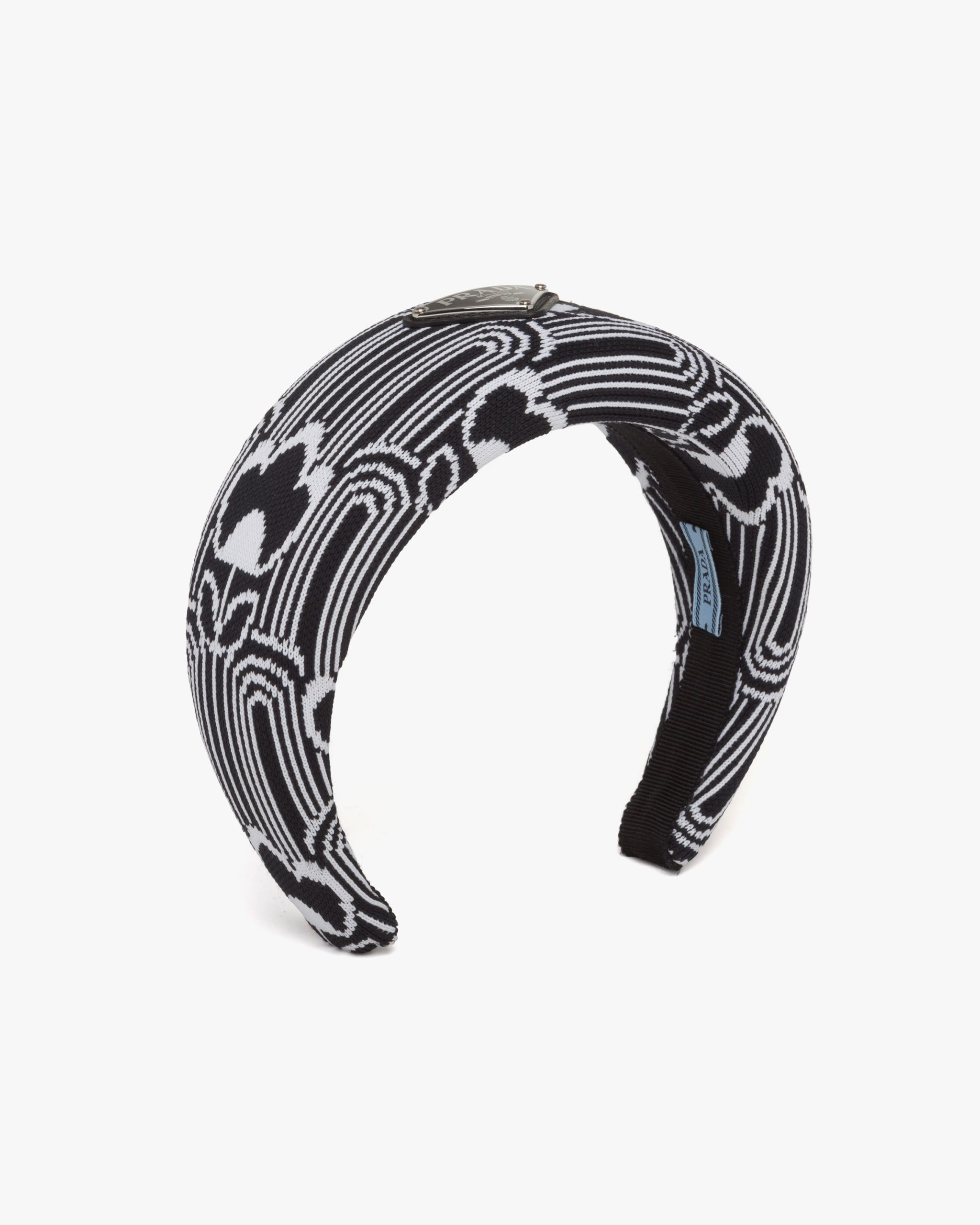 Geometric jacquard patterns that evoke sixties design animate the volumes of this puffy headband characterized by its fine workmanship. A sophisticated and emblematic accessory of Prada collectsions, it is decorated with the iconic triangle logo2.