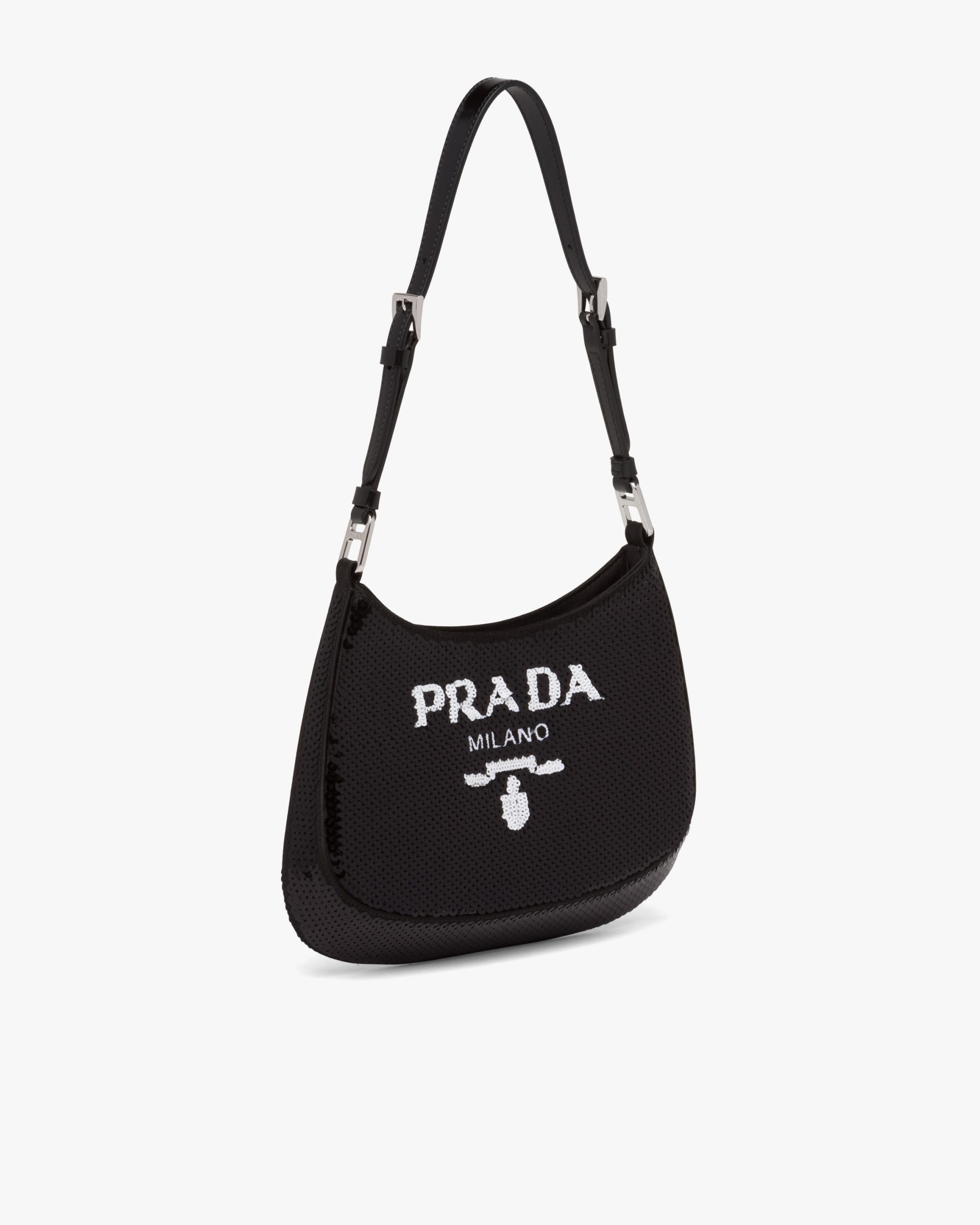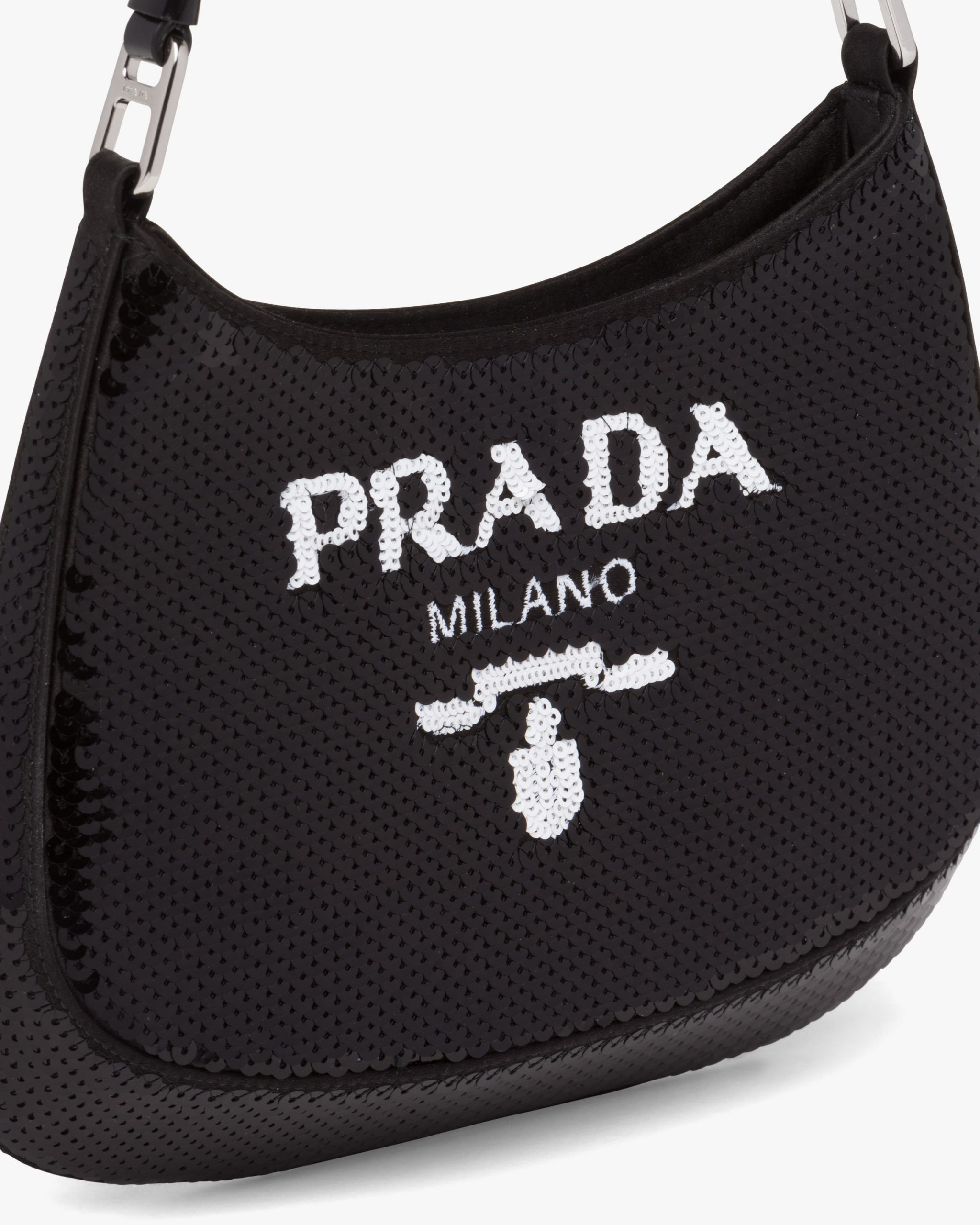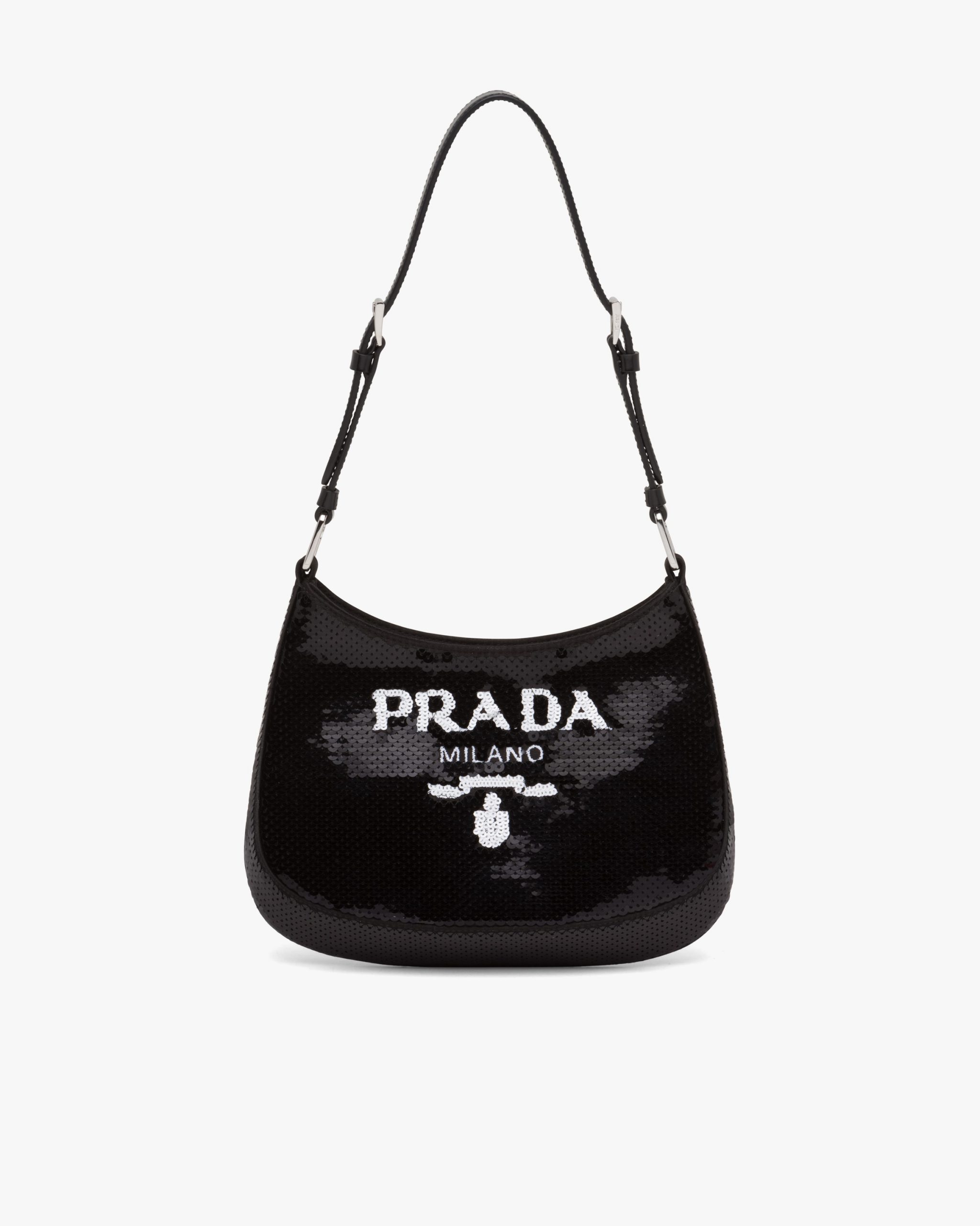 The sophisticated and modern Prada Cleo, a re-interpretation of an iconic design of the brand, is accented with sequins embroidered all over for luxurious charm. The sleek, sinuous lines are emphasized by the special construction that slopes on the bottom and sides, giving the hobo-style bag a soft, light look. The lettering logo2 embroidered on the front adds a contemporary note.
