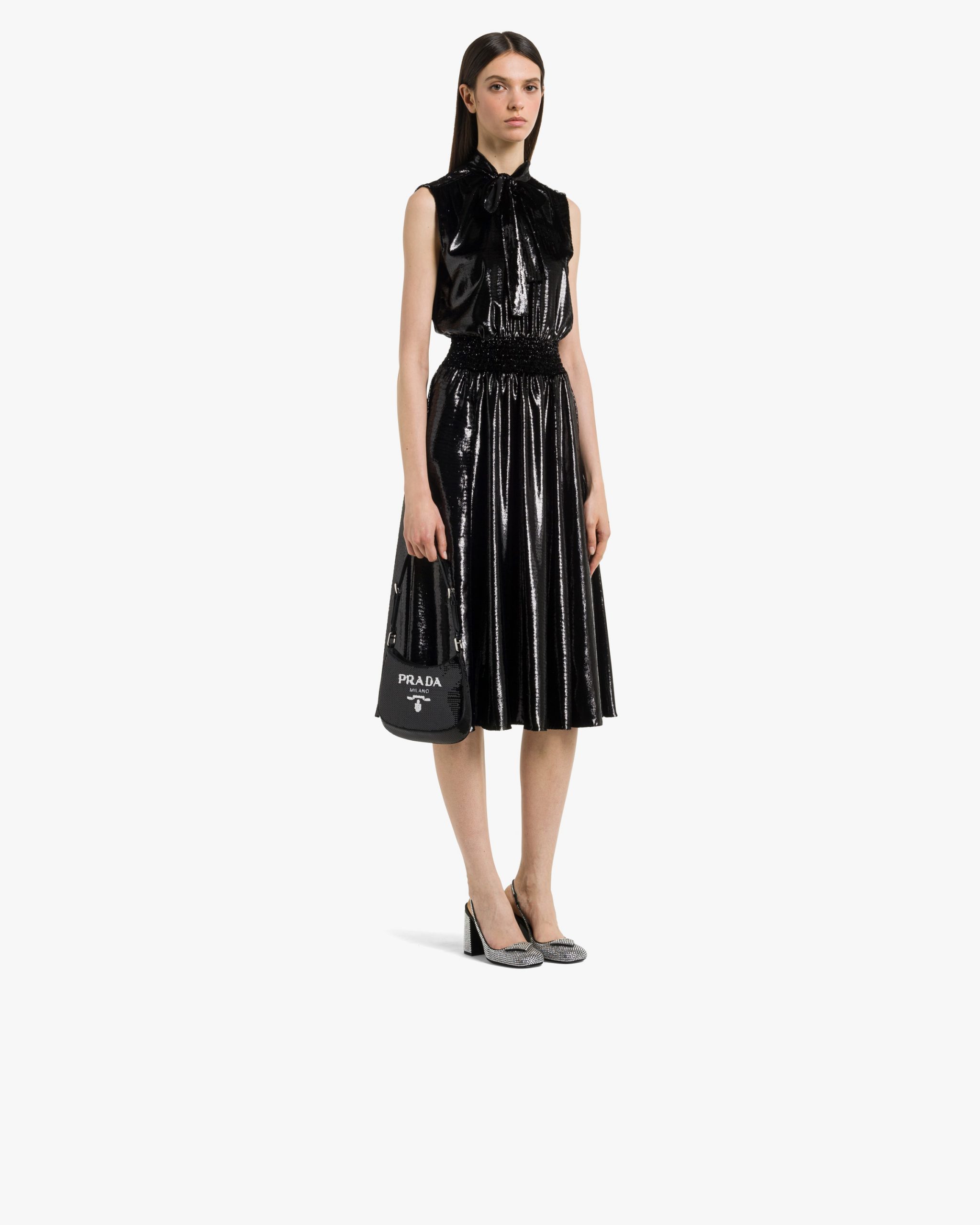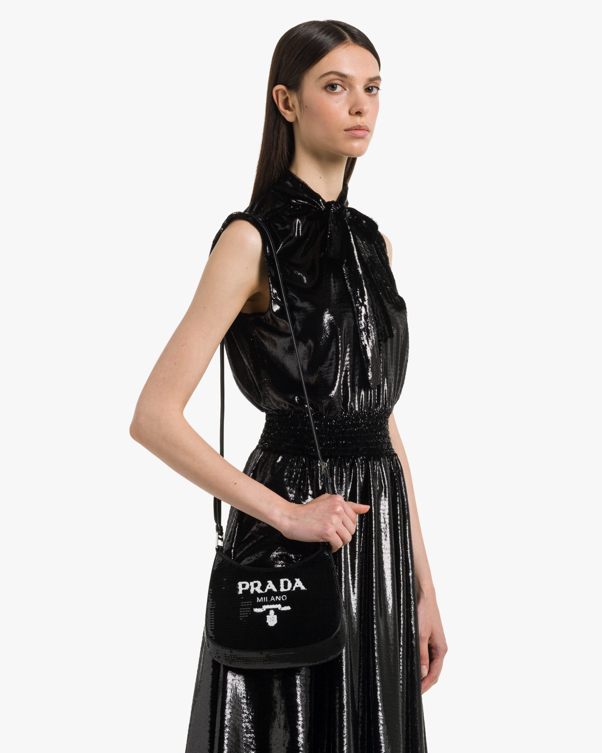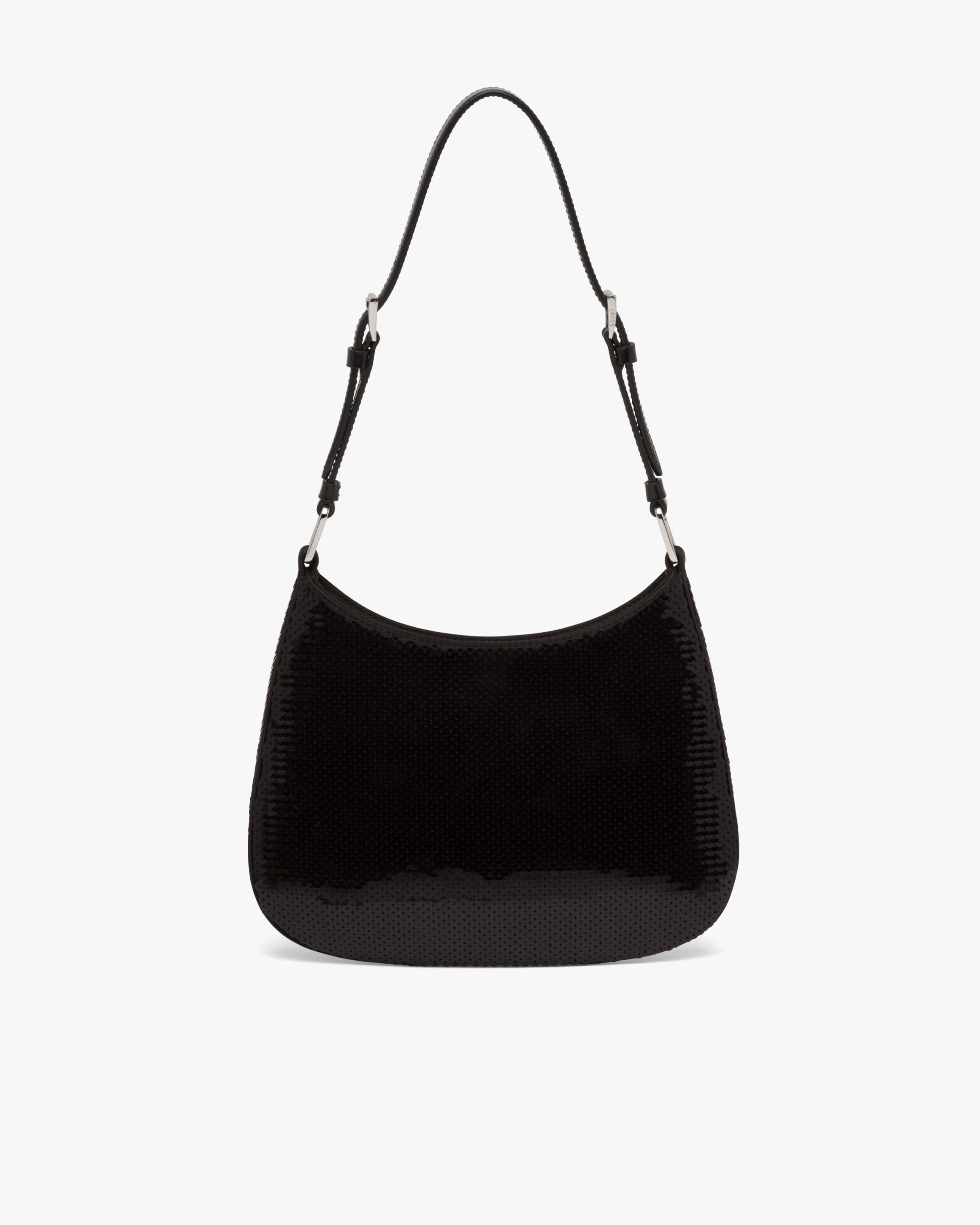 The sophisticated and modern Prada Cleo, a re-interpretation of an iconic design of the brand, is accented with sequins embroidered all over for luxurious charm. The sleek, sinuous lines are emphasized by the special construction that slopes on the bottom and sides, giving the hobo-style bag a soft, light look. The lettering logo2 embroidered on the front adds a contemporary note.