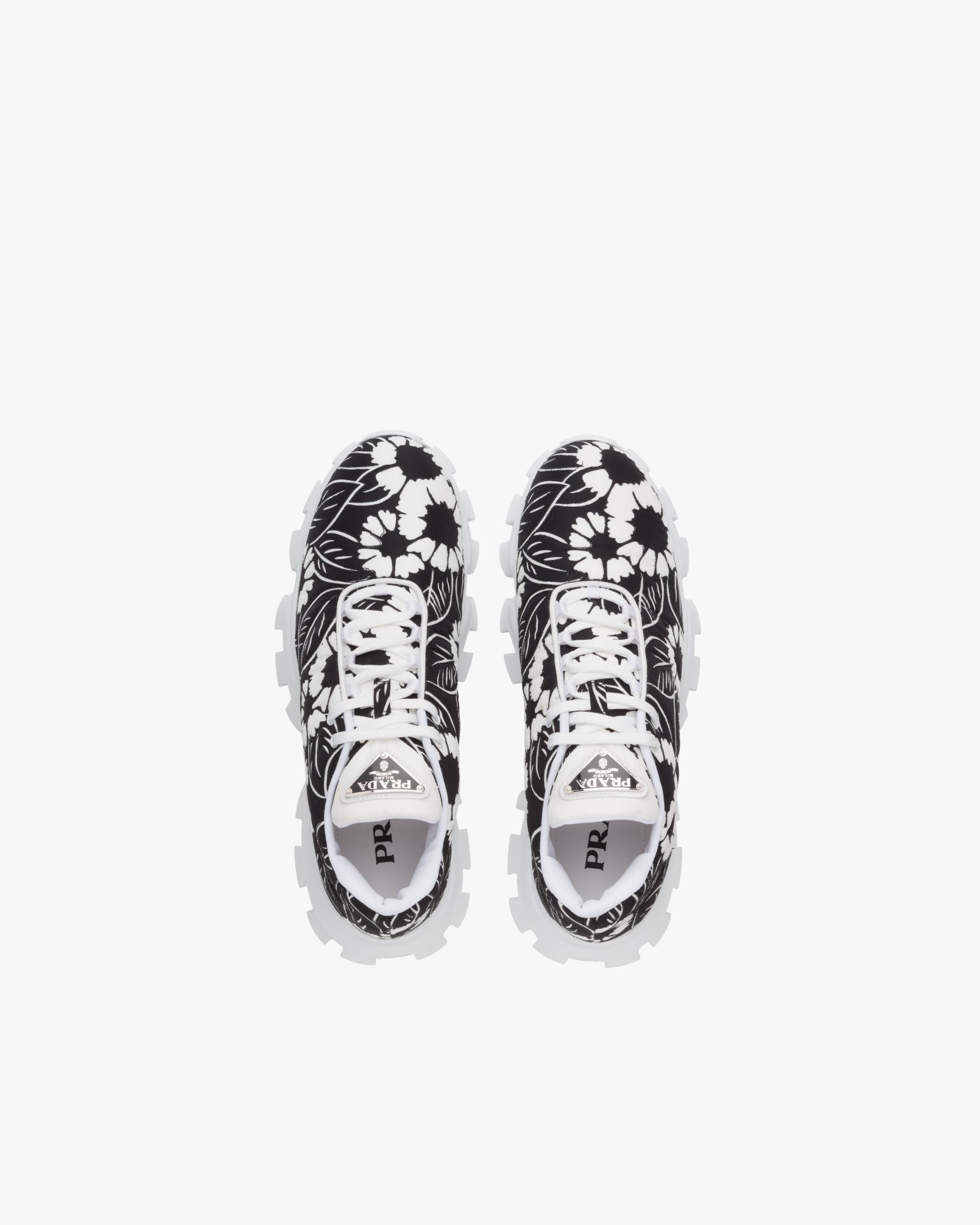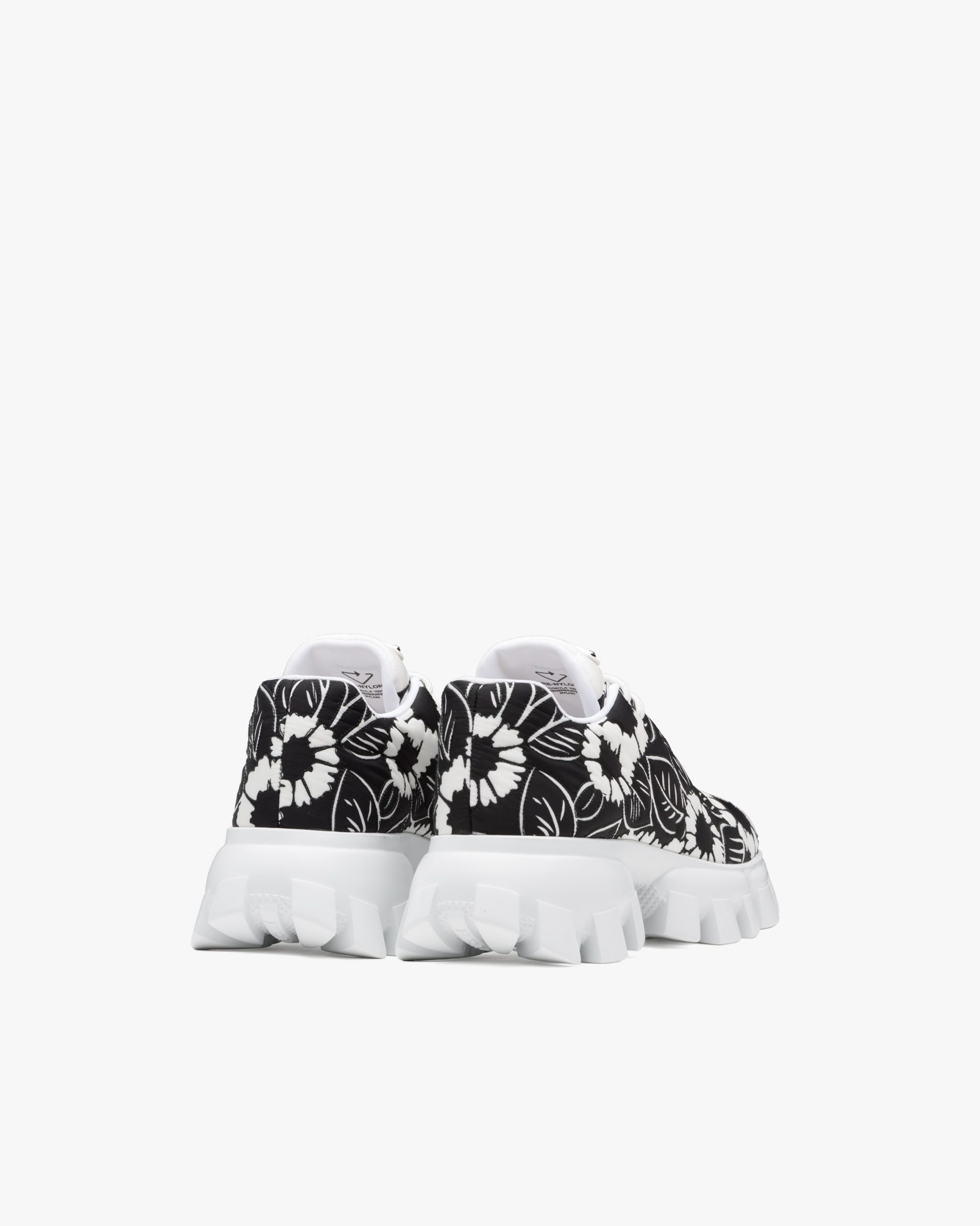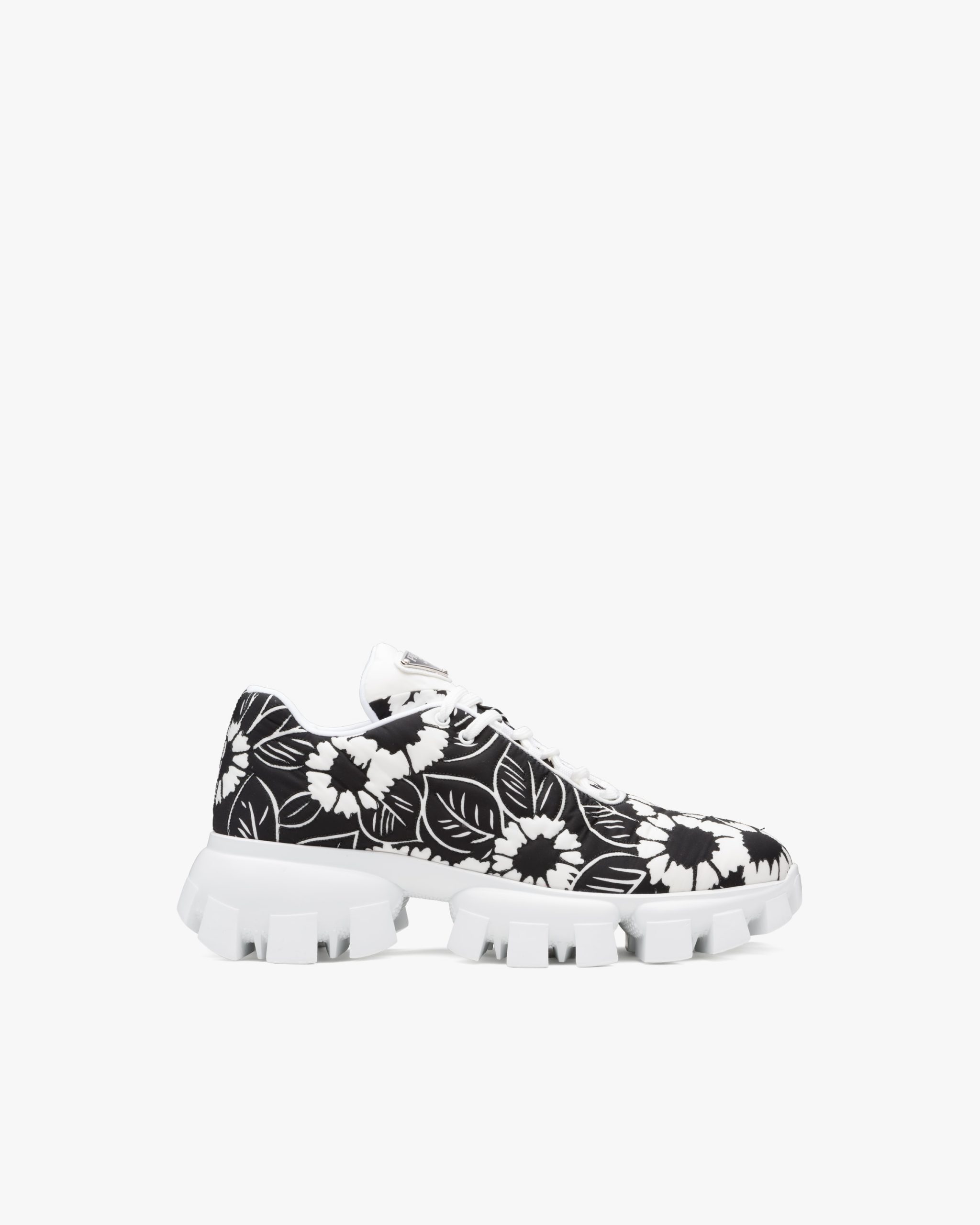 A vivid graphic design decorates these nylon sneakers with a hybrid character. These refined, sporty sneakers stand out for the harmonic stylistic contrast between the bold sole and printed upper decorated with the enameled metal triangle logo2.