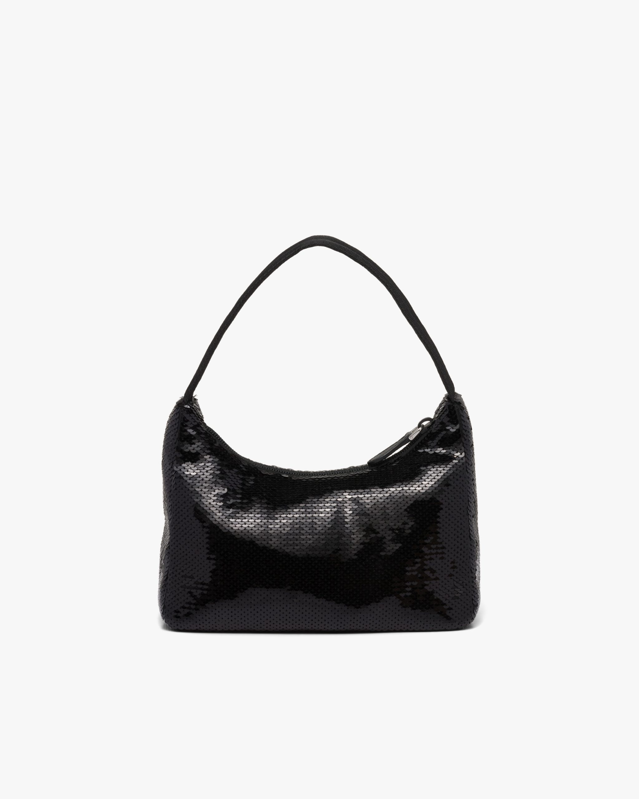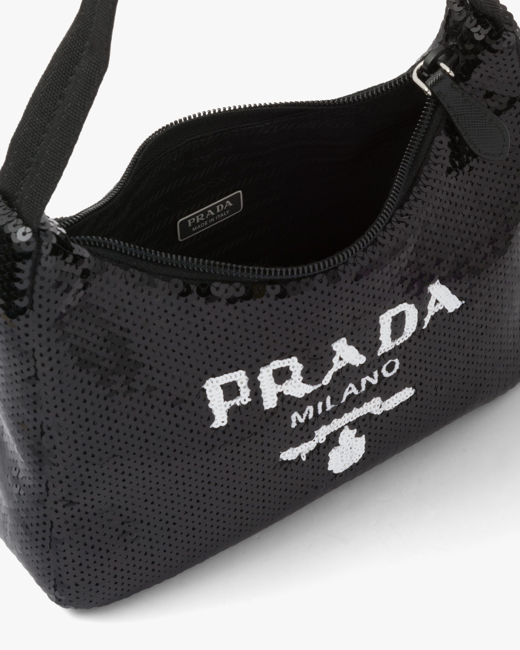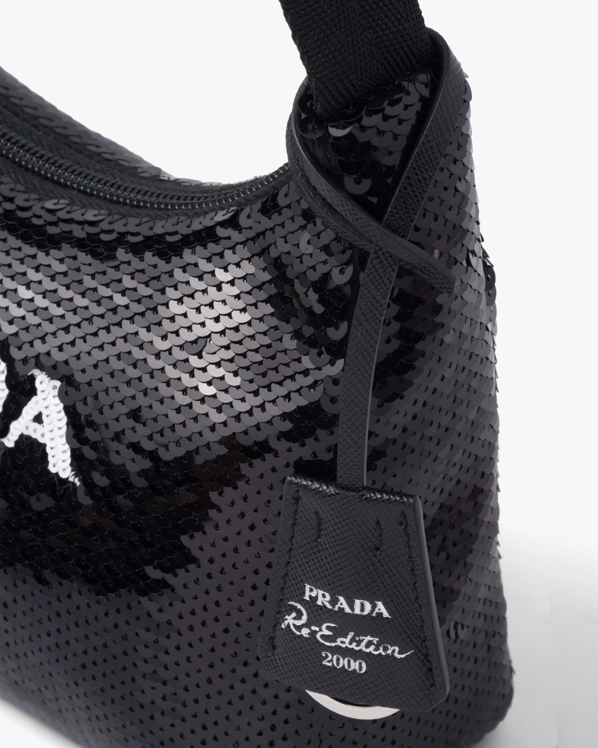 A new interpretation of an iconic Prada style, the Re-Edition 2000 mini-bag is covered with all-over sequins that create a play of light and iridescent glimmers on the surface. The design is made of innovative Re-Nylon, produced from recycled, purified plastic materials collectsed in the ocean, fishing nets, and textile fibers. The accessory with zipper closure and woven tape handle is enhanced with the distinctive enameled metal triangle logo2.