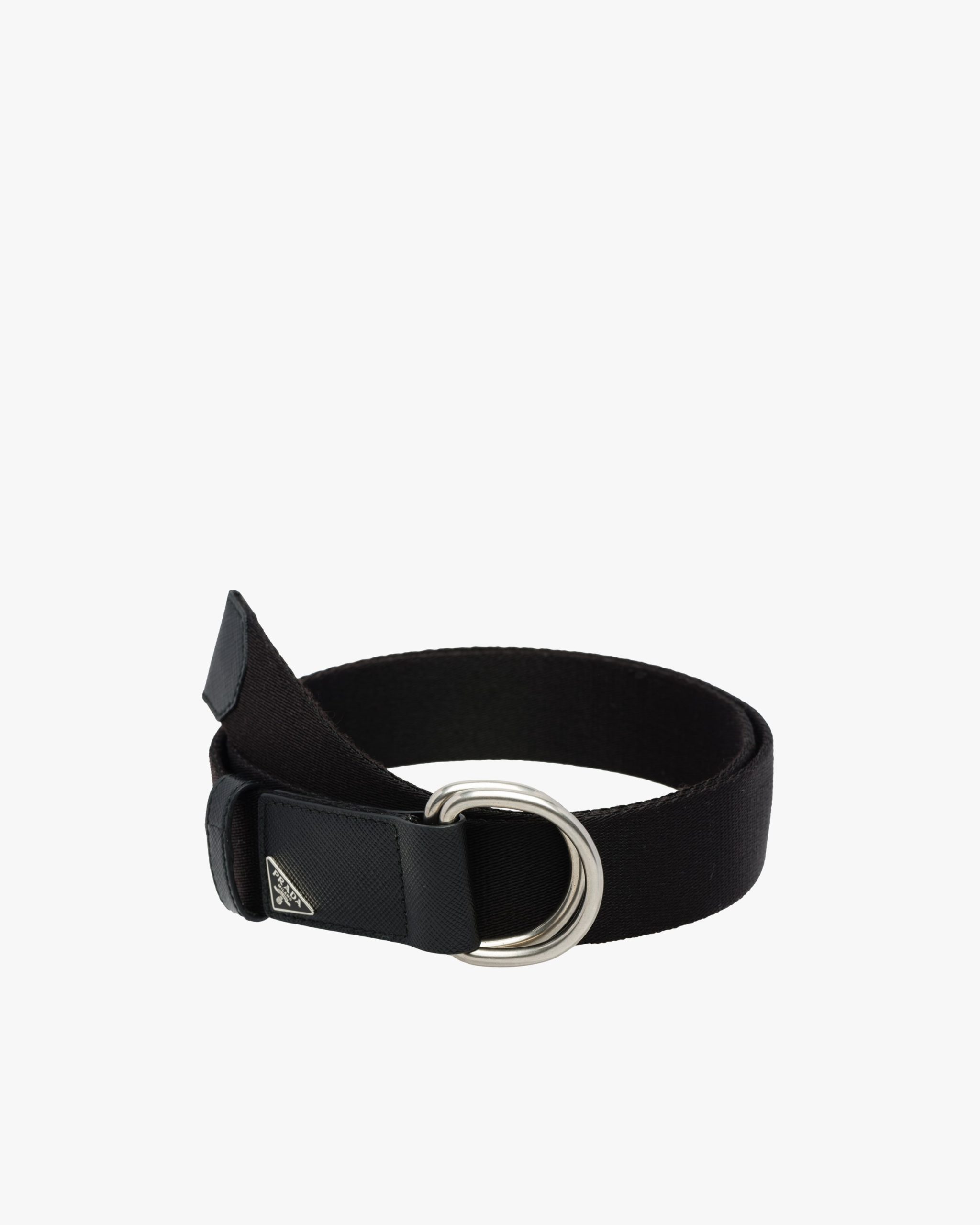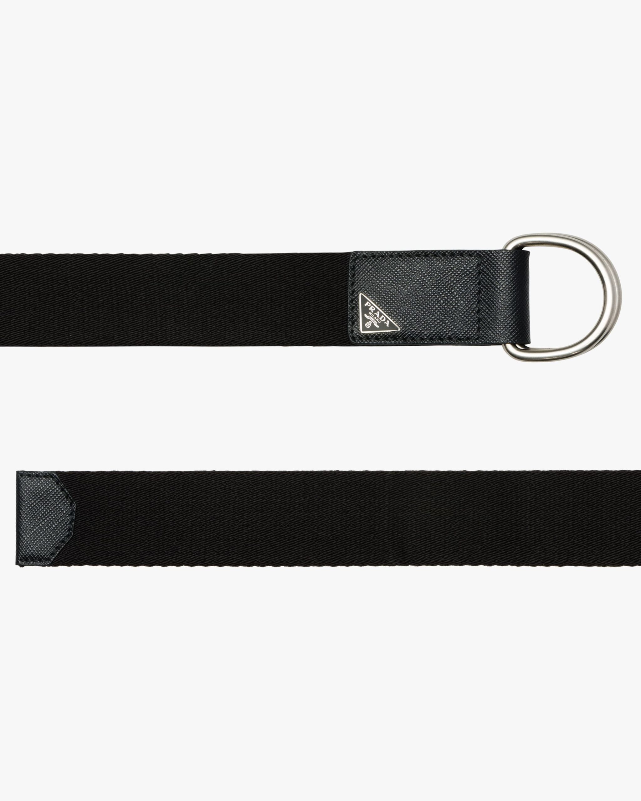 Saffiano leather details embellish this eclectic belt in woven technical fabric. The accessory is completed by the double metal buckle with triangle logo2.