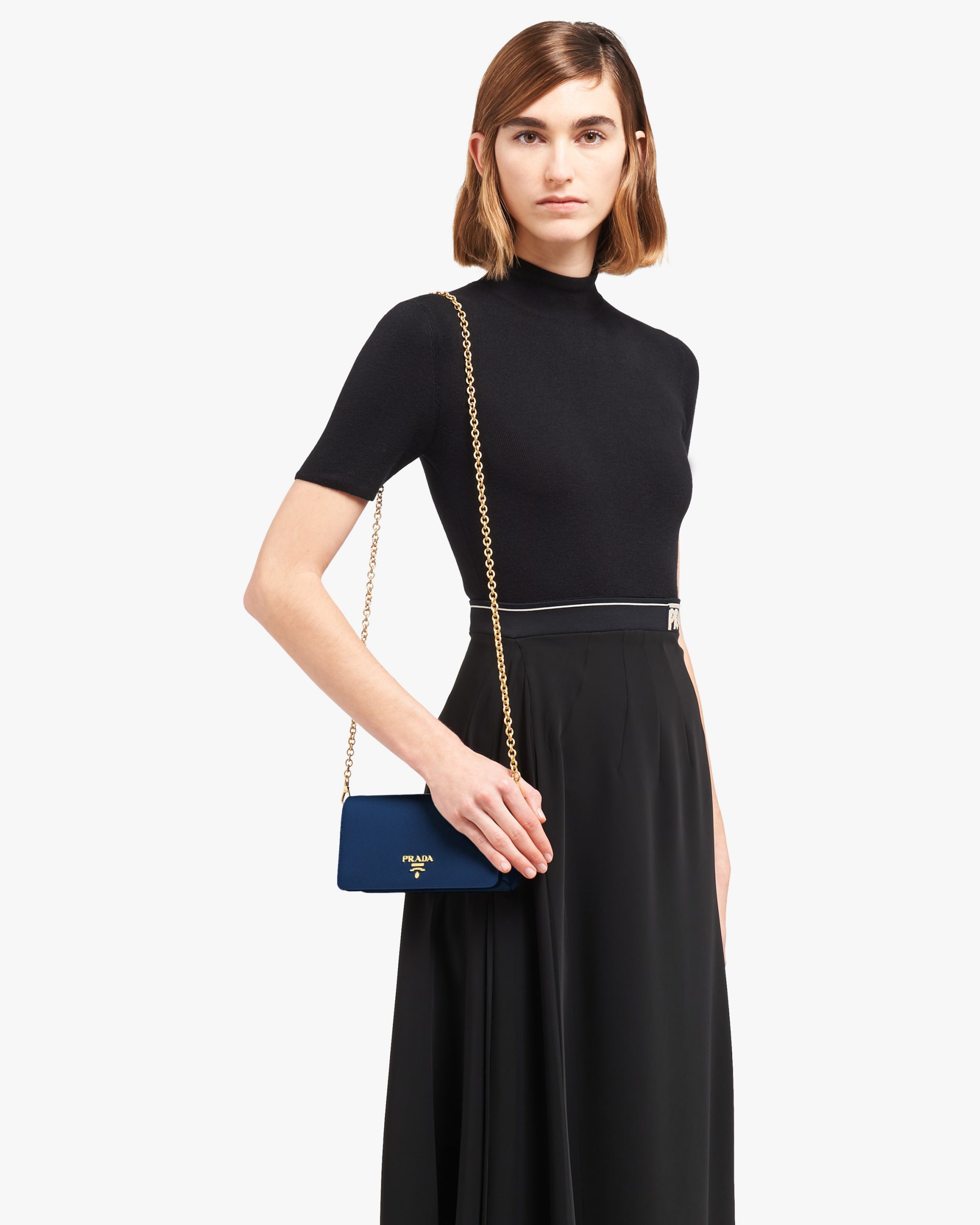Refined and with a minimal design, this Saffiano leather mini-bag has a detachable chain shoulder strap.