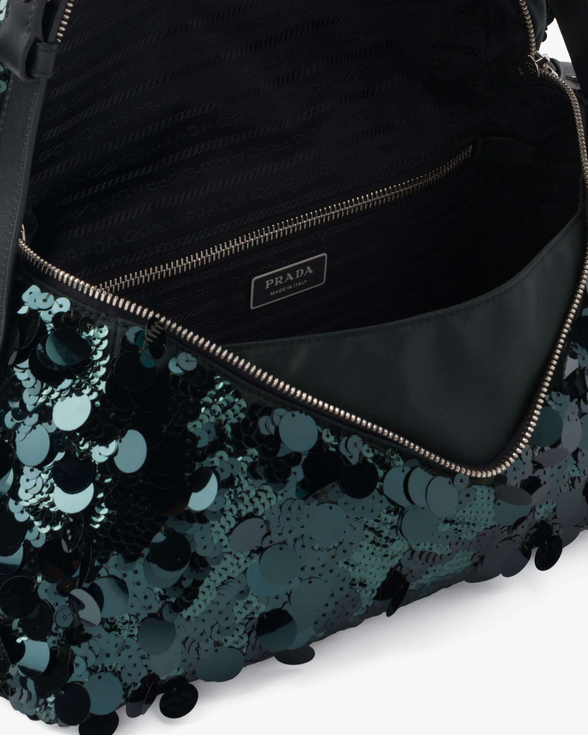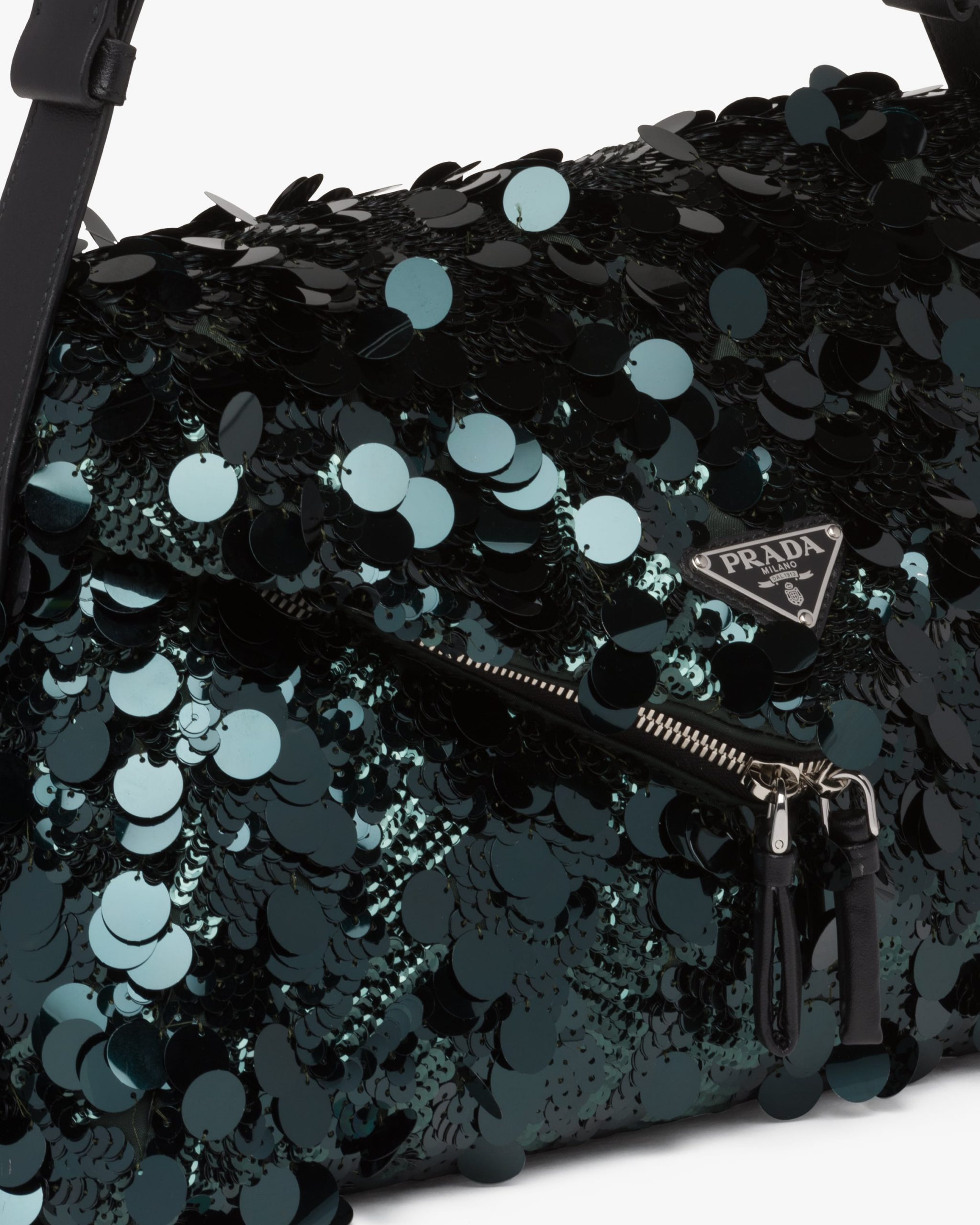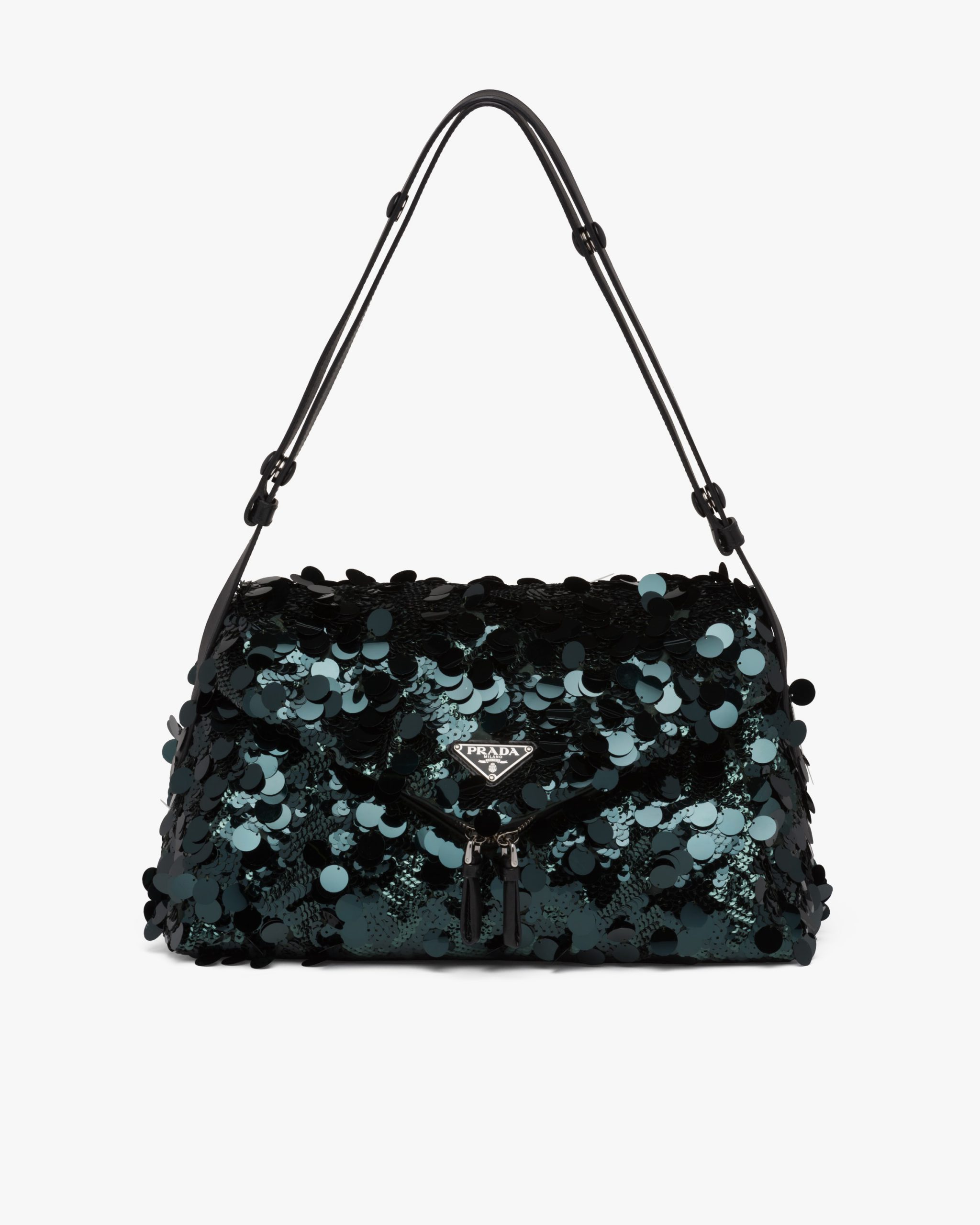 All-over embroidered sequins create a play of light and iridescent glimmers on this shoulder bag with a contemporary attitude and a particular reverse seam construction. A study of the triangle inspires new geometric details and unique interpretations of the historic Prada logo2. The iconic shape appears in the large flap of this bag with sleek lines that has an adjustable leather shoulder strap so that it can be worn in different ways.