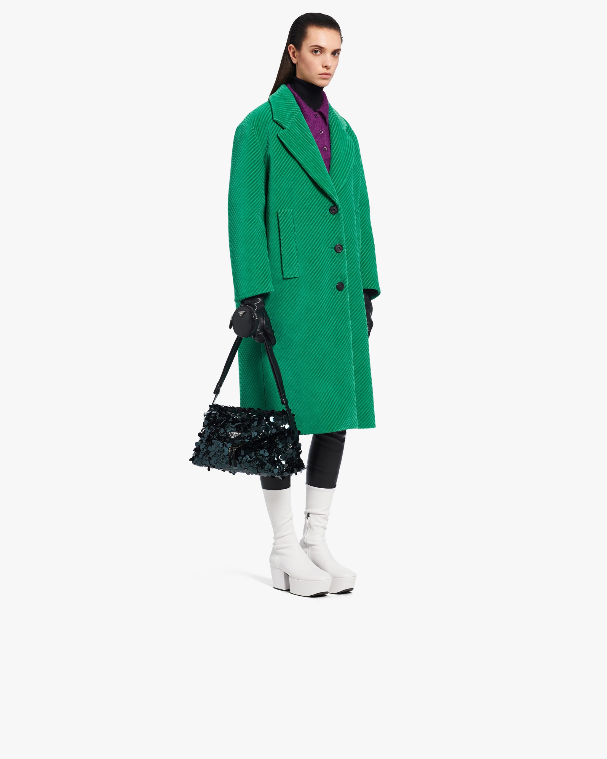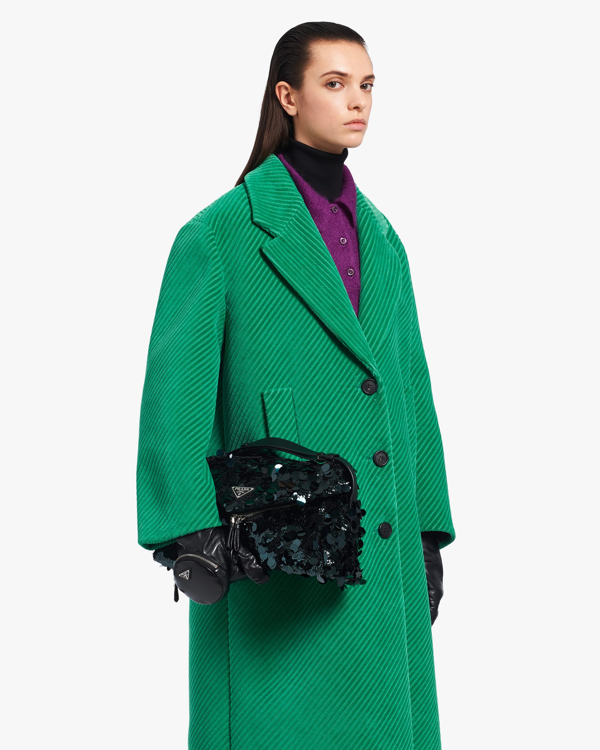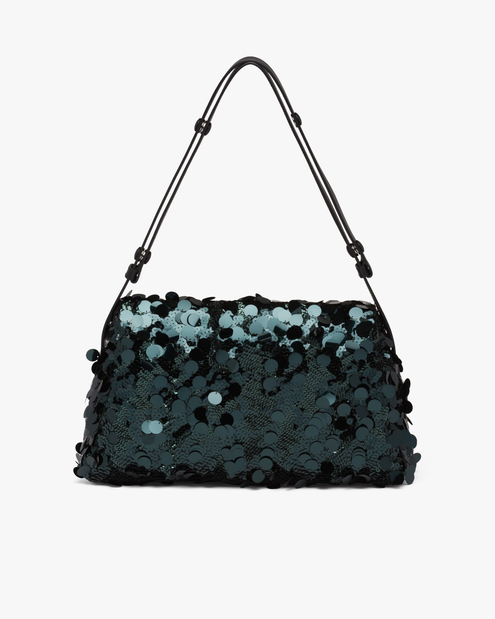 All-over embroidered sequins create a play of light and iridescent glimmers on this shoulder bag with a contemporary attitude and a particular reverse seam construction. A study of the triangle inspires new geometric details and unique interpretations of the historic Prada logo2. The iconic shape appears in the large flap of this bag with sleek lines that has an adjustable leather shoulder strap so that it can be worn in different ways.