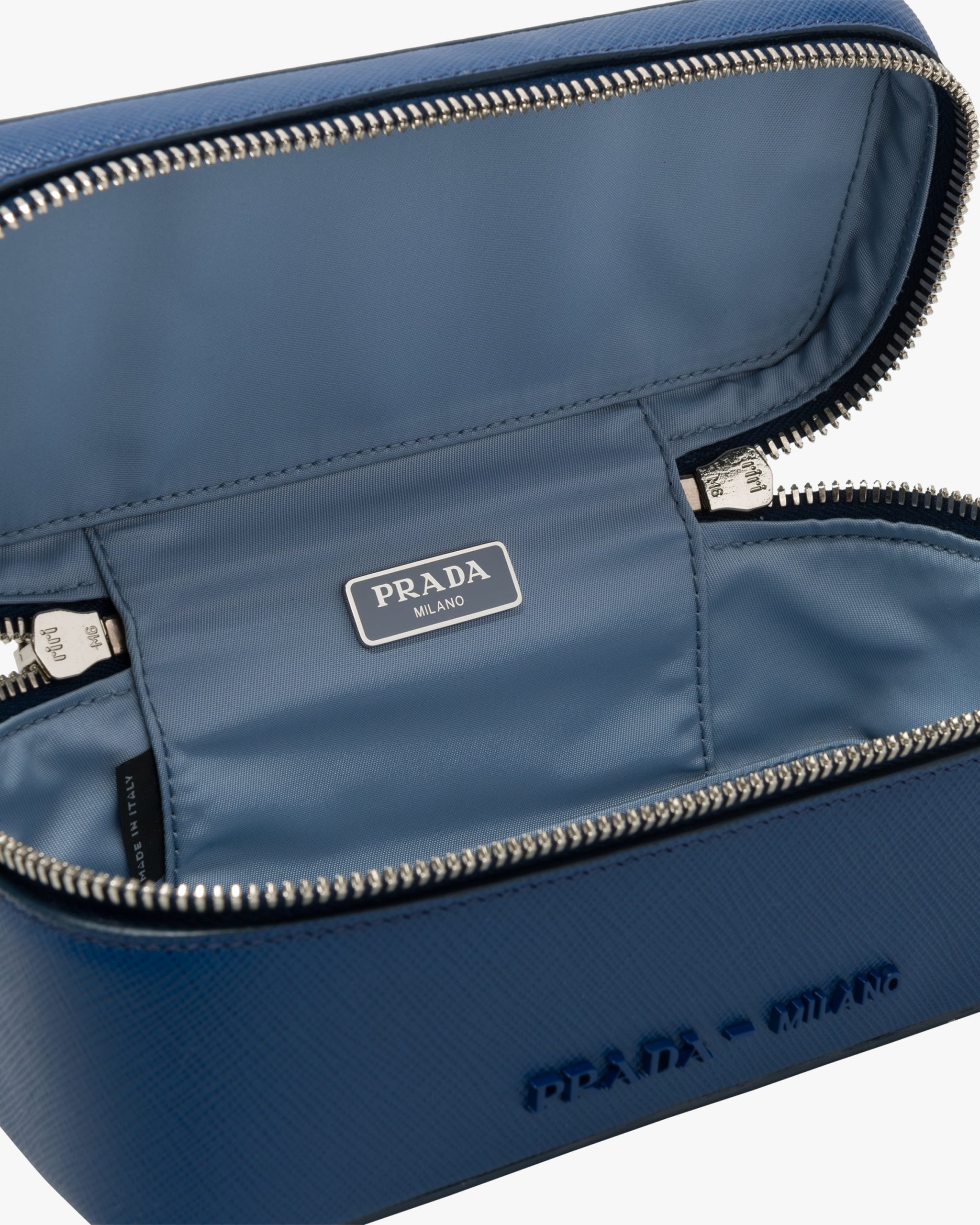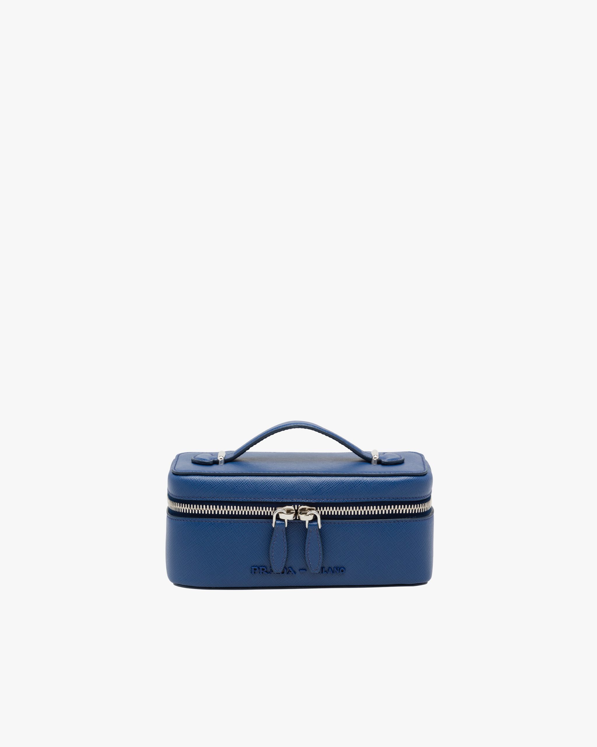 This small travel pouch with handle and zipper closure is made of Saffiano leather. The lettering logo2 decorates the front.