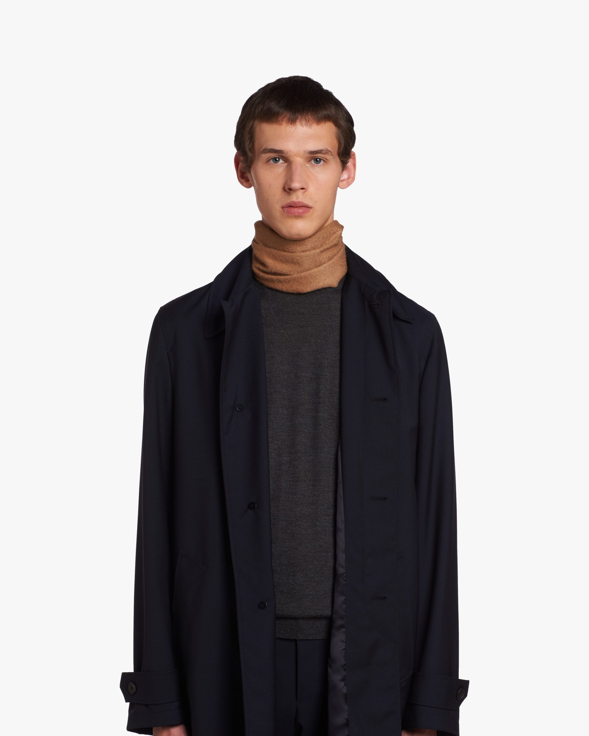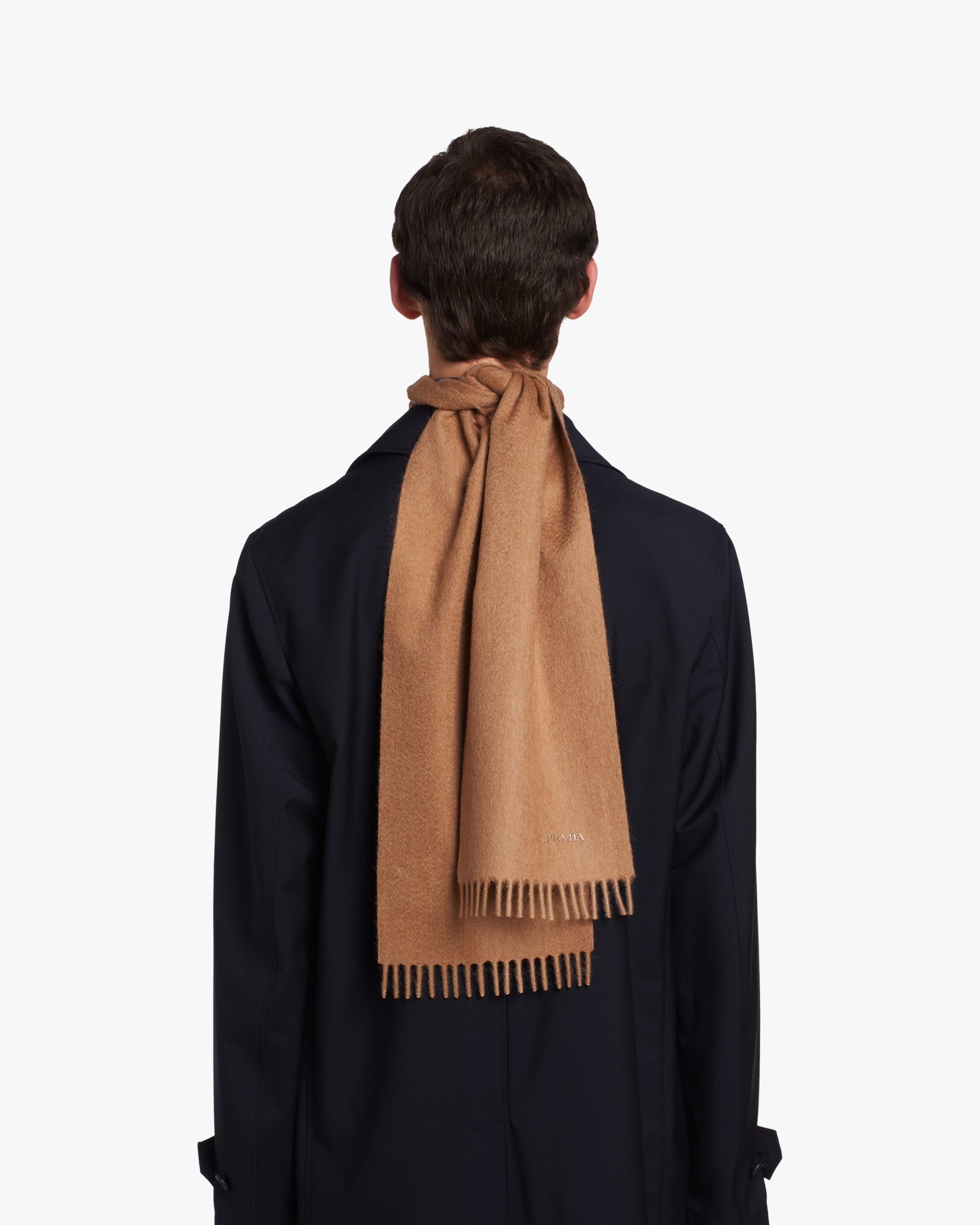 A warm scarf crafted from soft camel hair. It’s embellished with fringes and long enough to ensure it wraps around with comfort.