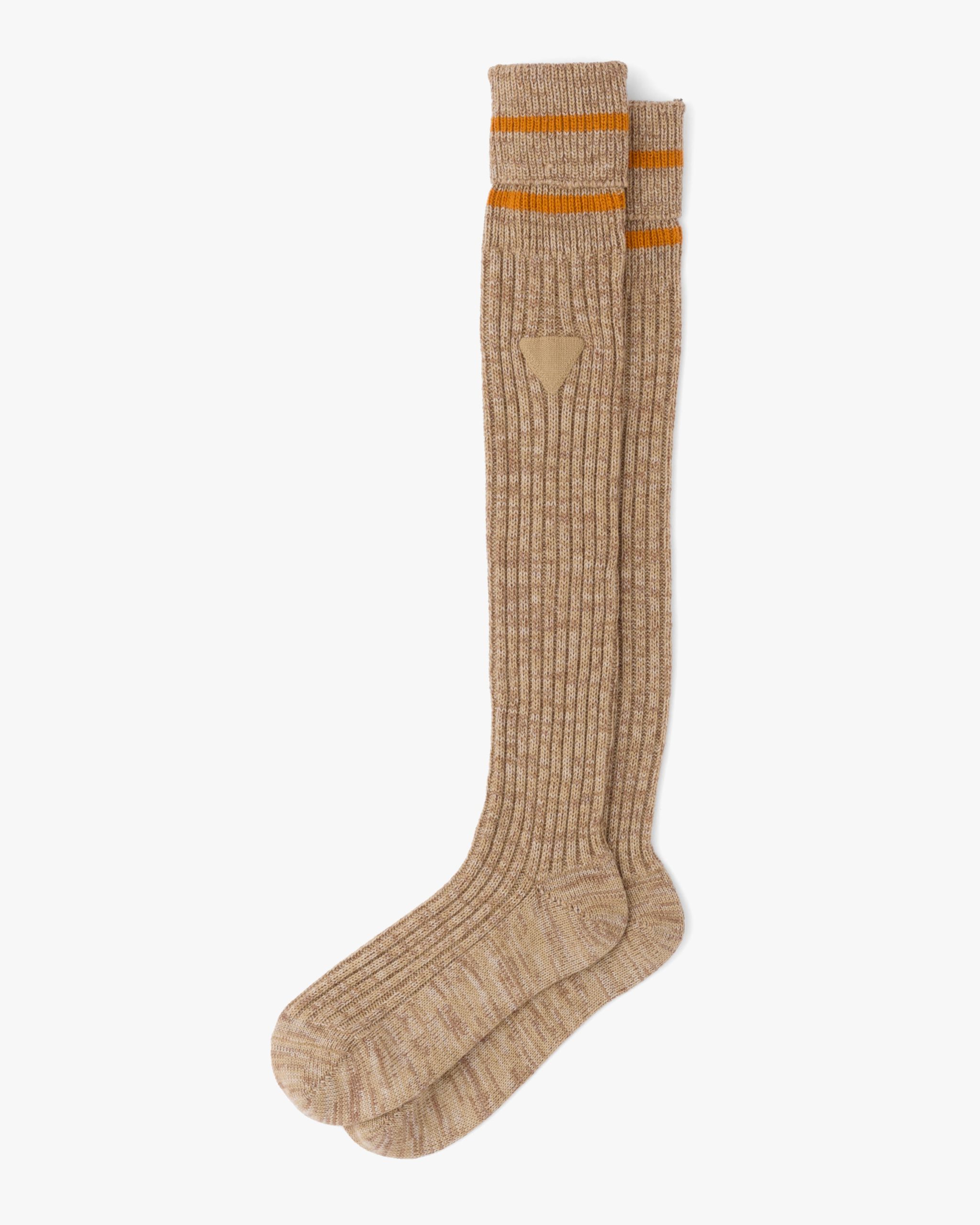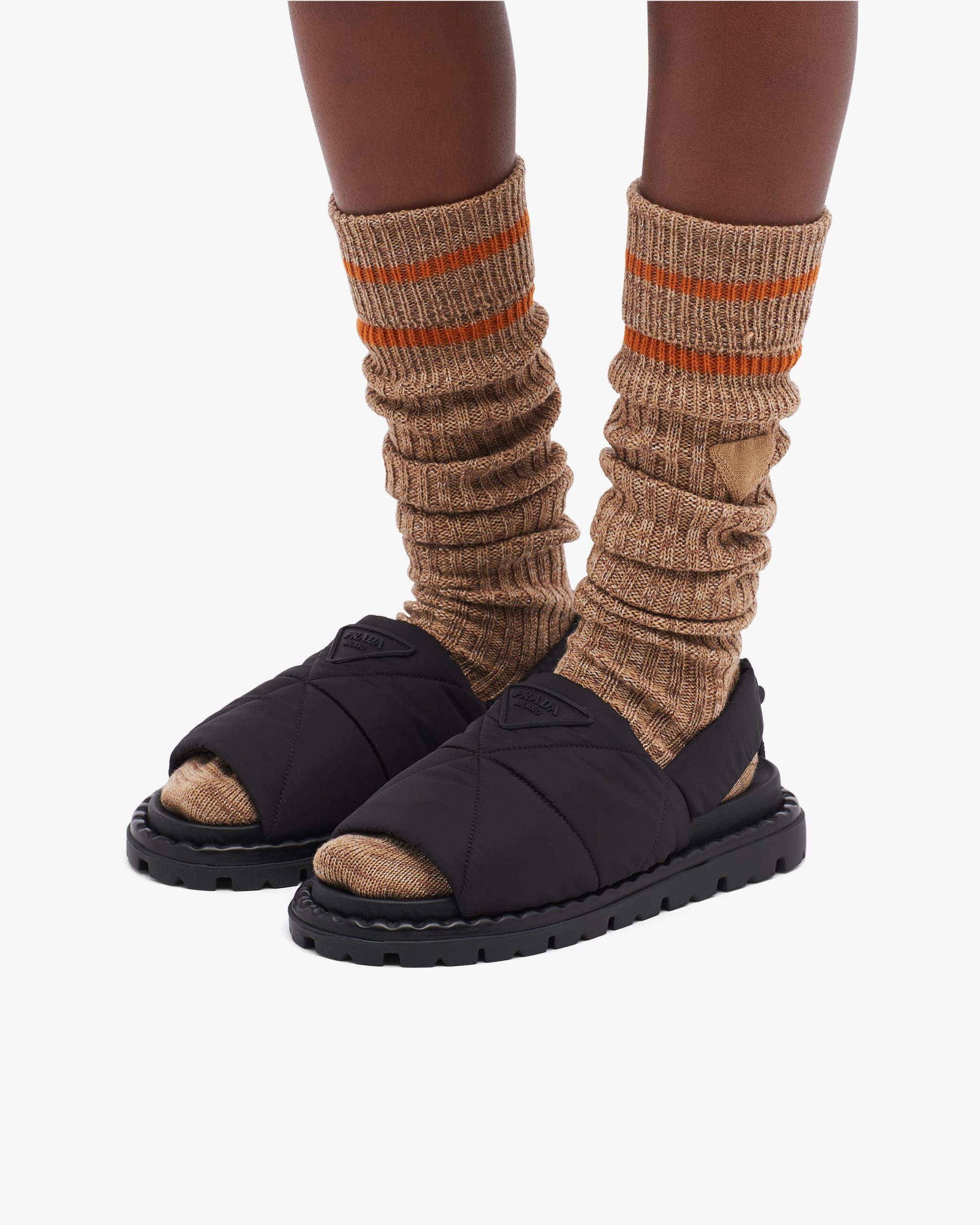 These soft, warm wool knee socks have a ribbed knit motif and are decorated with a new interpretation of Prada’s iconic triangle logo2.