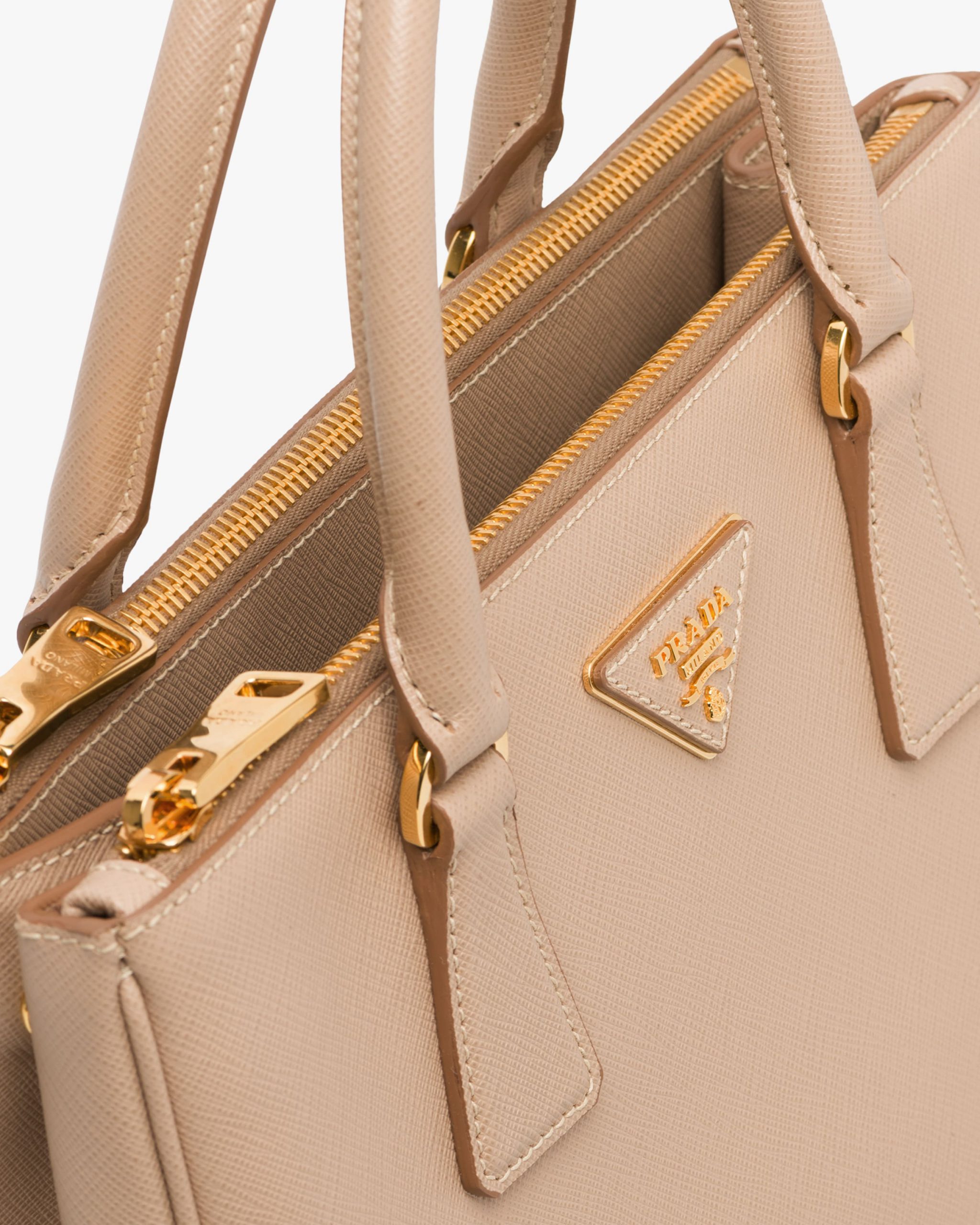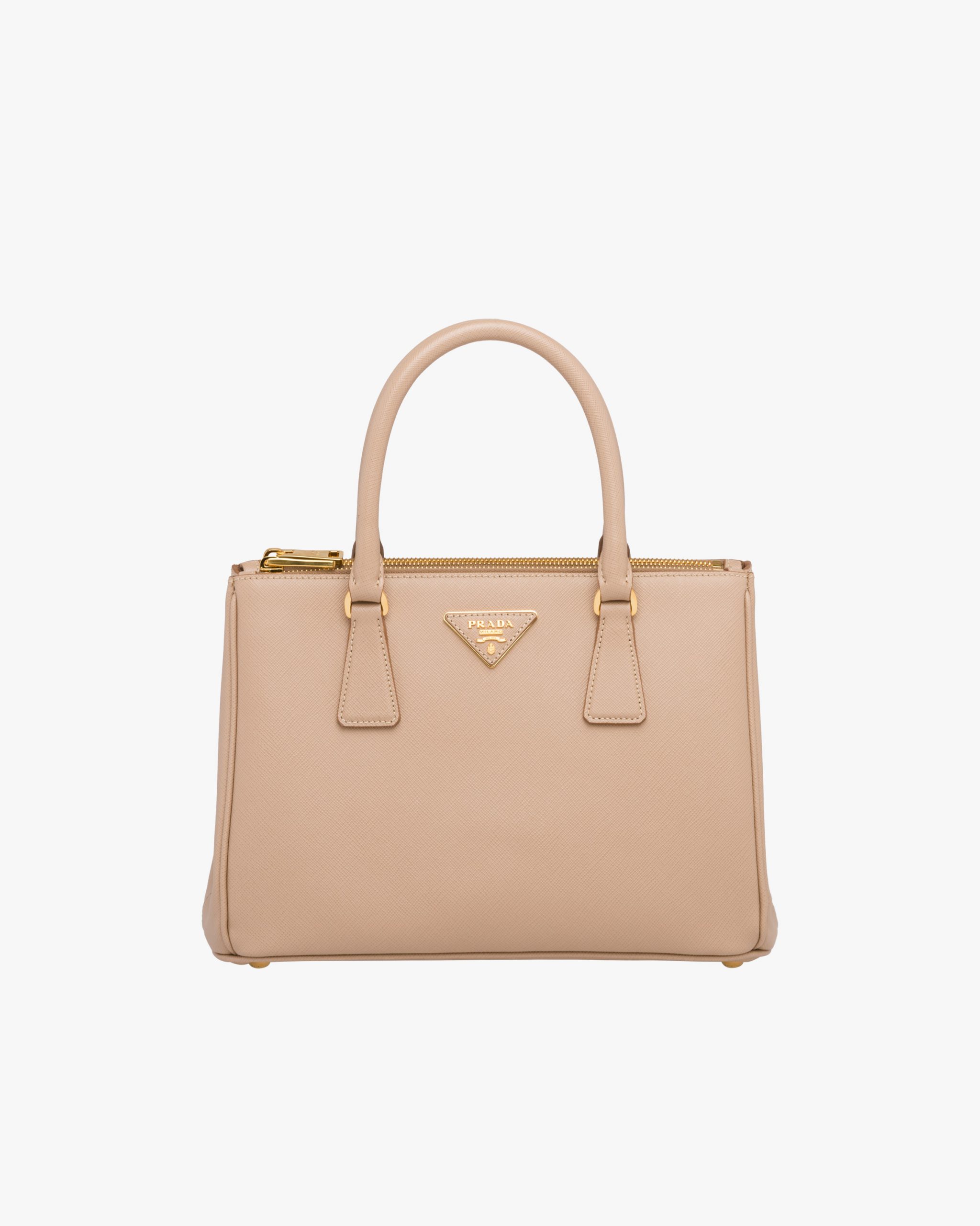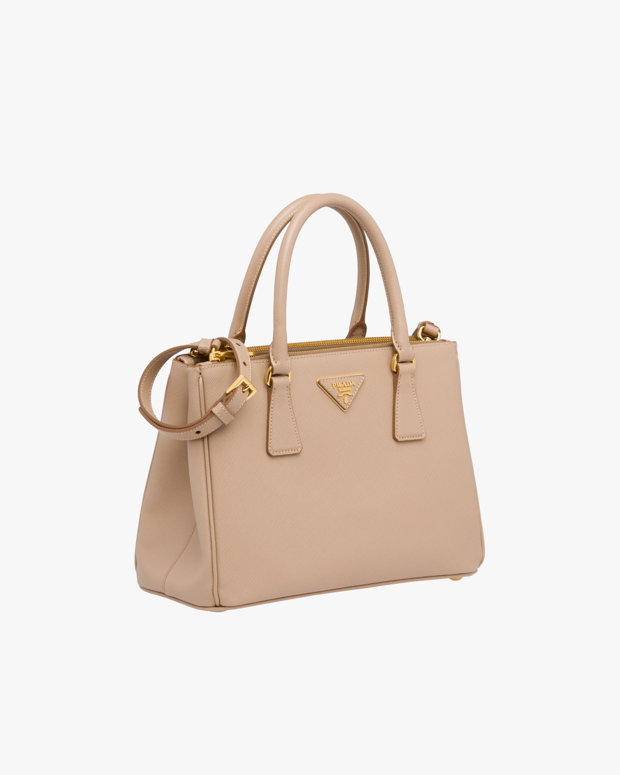 • The Prada Galleria bag, the quintessence of timeless elegance, owes its name to the historic Prada store that Mario Prada opened back in 1913 in Galleria Vittorio Emanuele II in Milan. The accessory made of Saffiano leather has a double handle and detachable shoulder strap that allow it to be worn as a shoulder bag or handbag. The bag stands out for its sophisticated simplicity and is decorated with the leather triangle logo2 and gold-tone metal hardware.