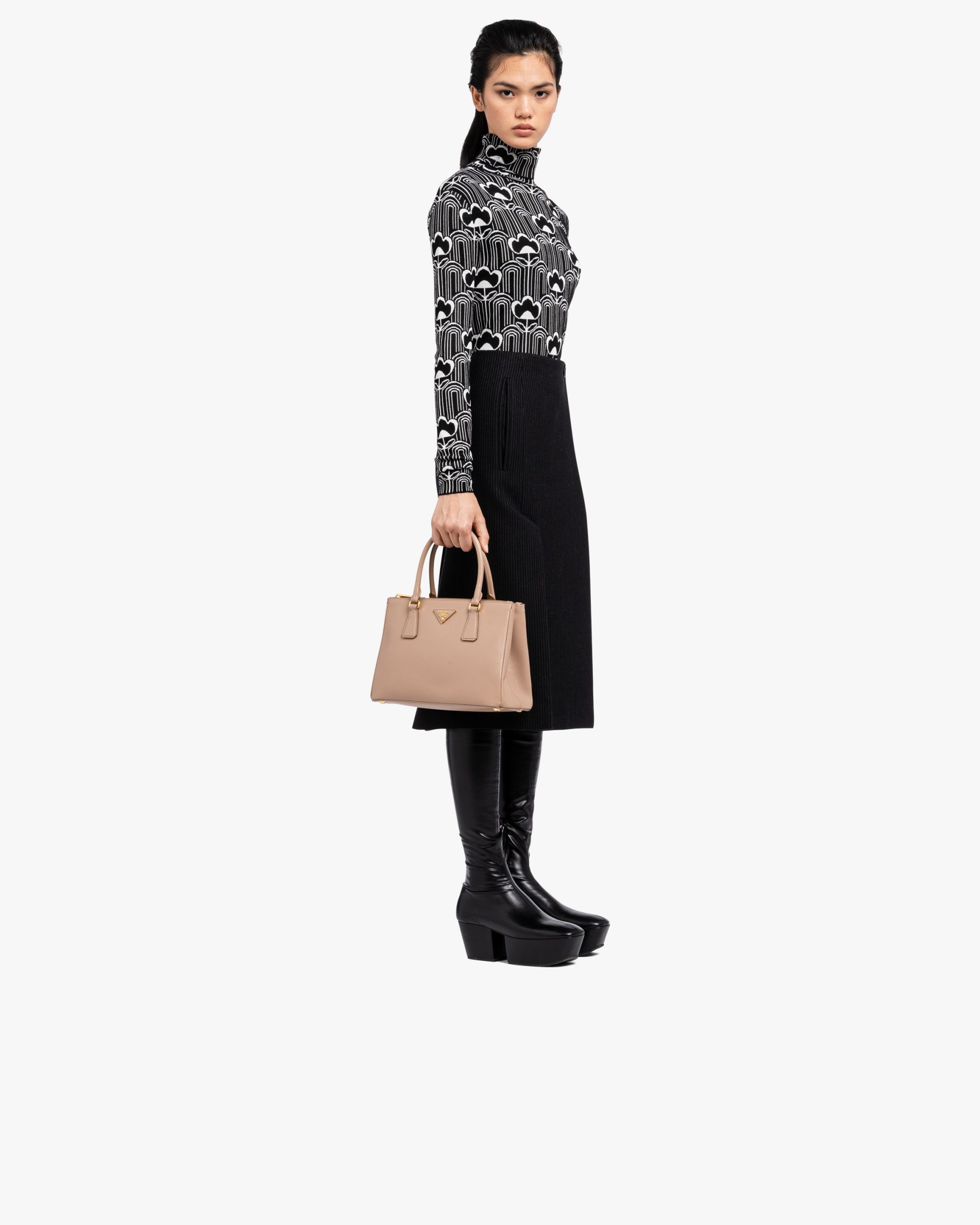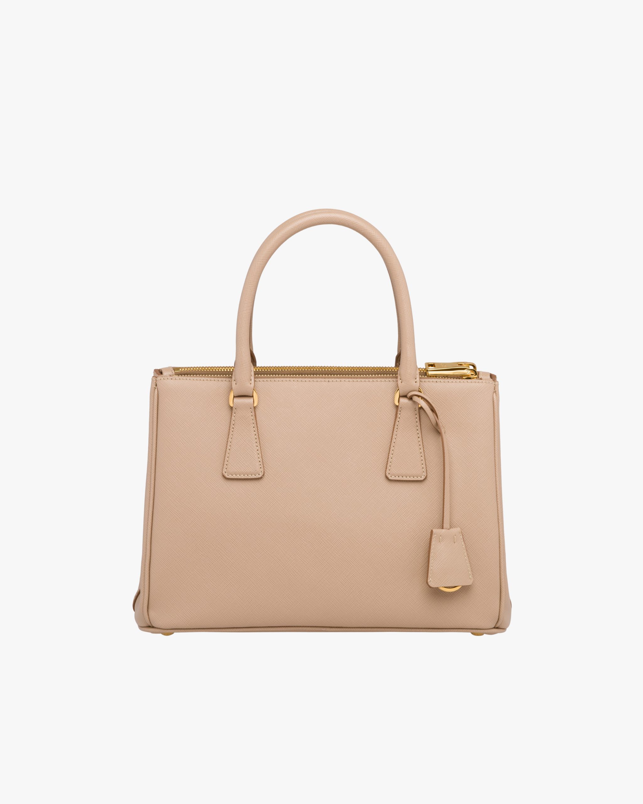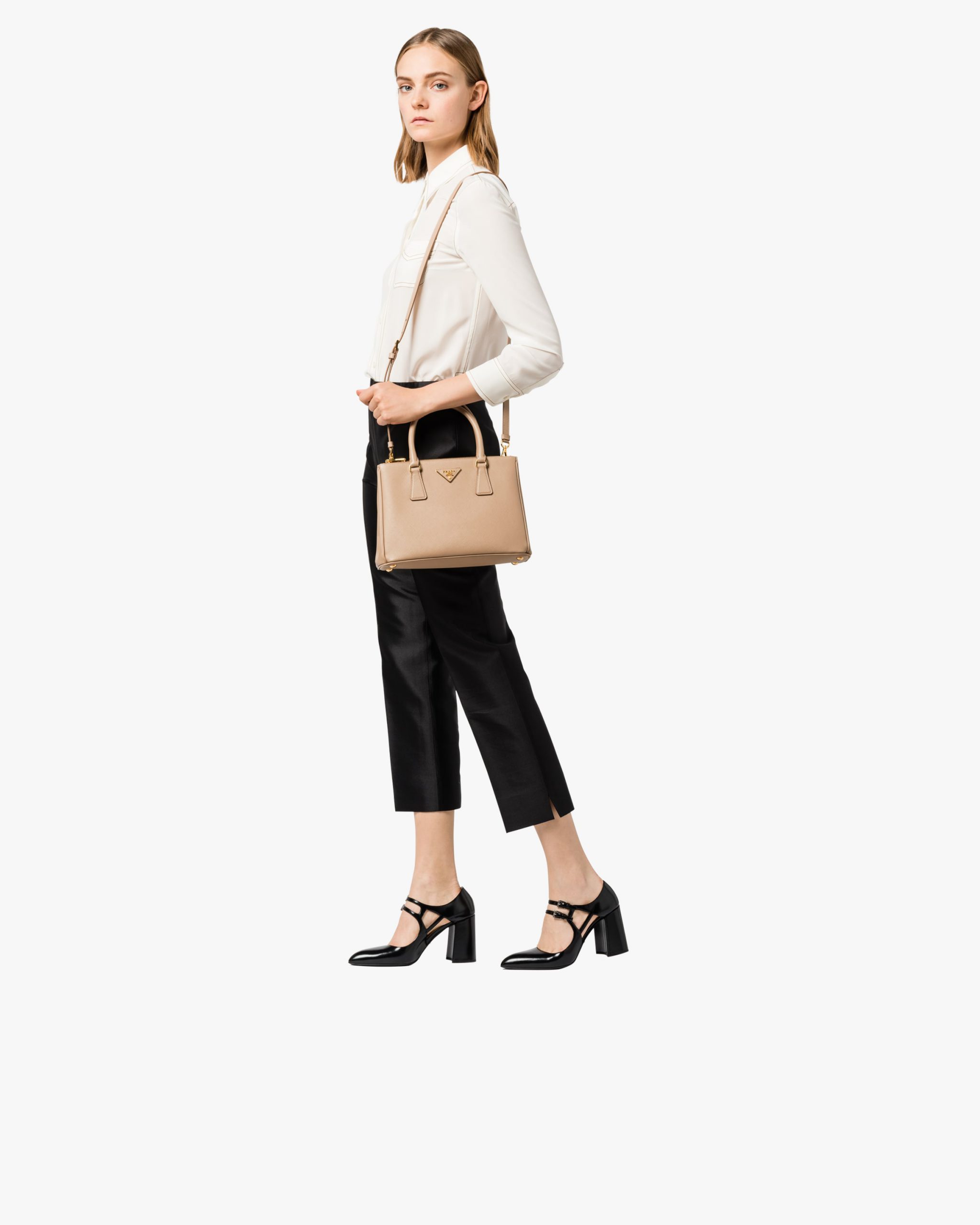 • The Prada Galleria bag, the quintessence of timeless elegance, owes its name to the historic Prada store that Mario Prada opened back in 1913 in Galleria Vittorio Emanuele II in Milan. The accessory made of Saffiano leather has a double handle and detachable shoulder strap that allow it to be worn as a shoulder bag or handbag. The bag stands out for its sophisticated simplicity and is decorated with the leather triangle logo2 and gold-tone metal hardware.
