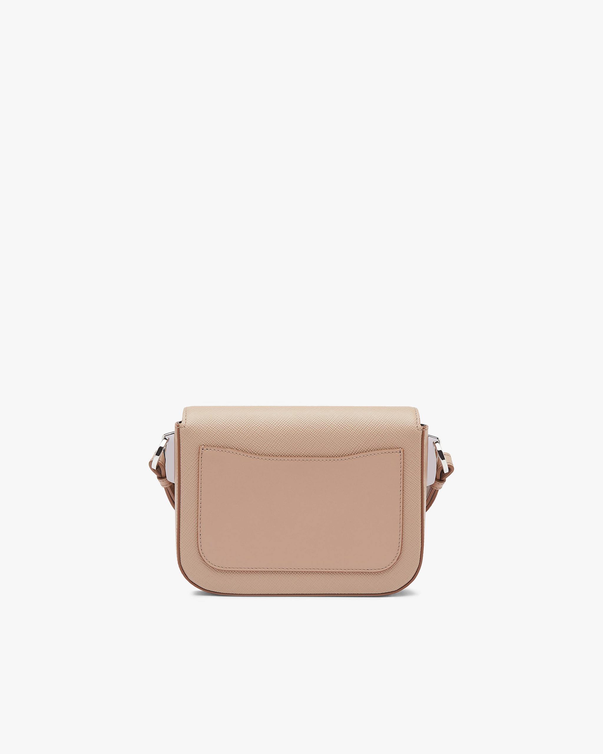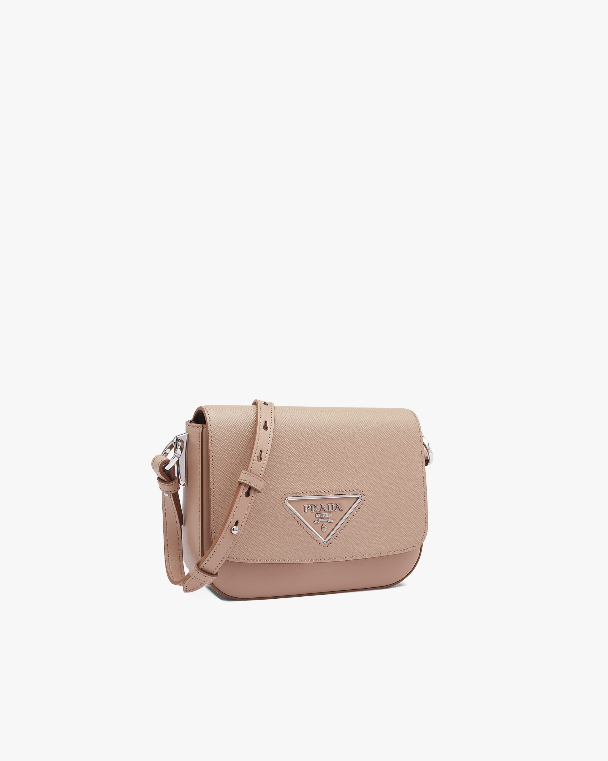 The minimalist design of this shoulder bag in Saffiano leather, a signature material of the brand, is enhanced with sophisticated details such as the triangle logo2 on the flap.