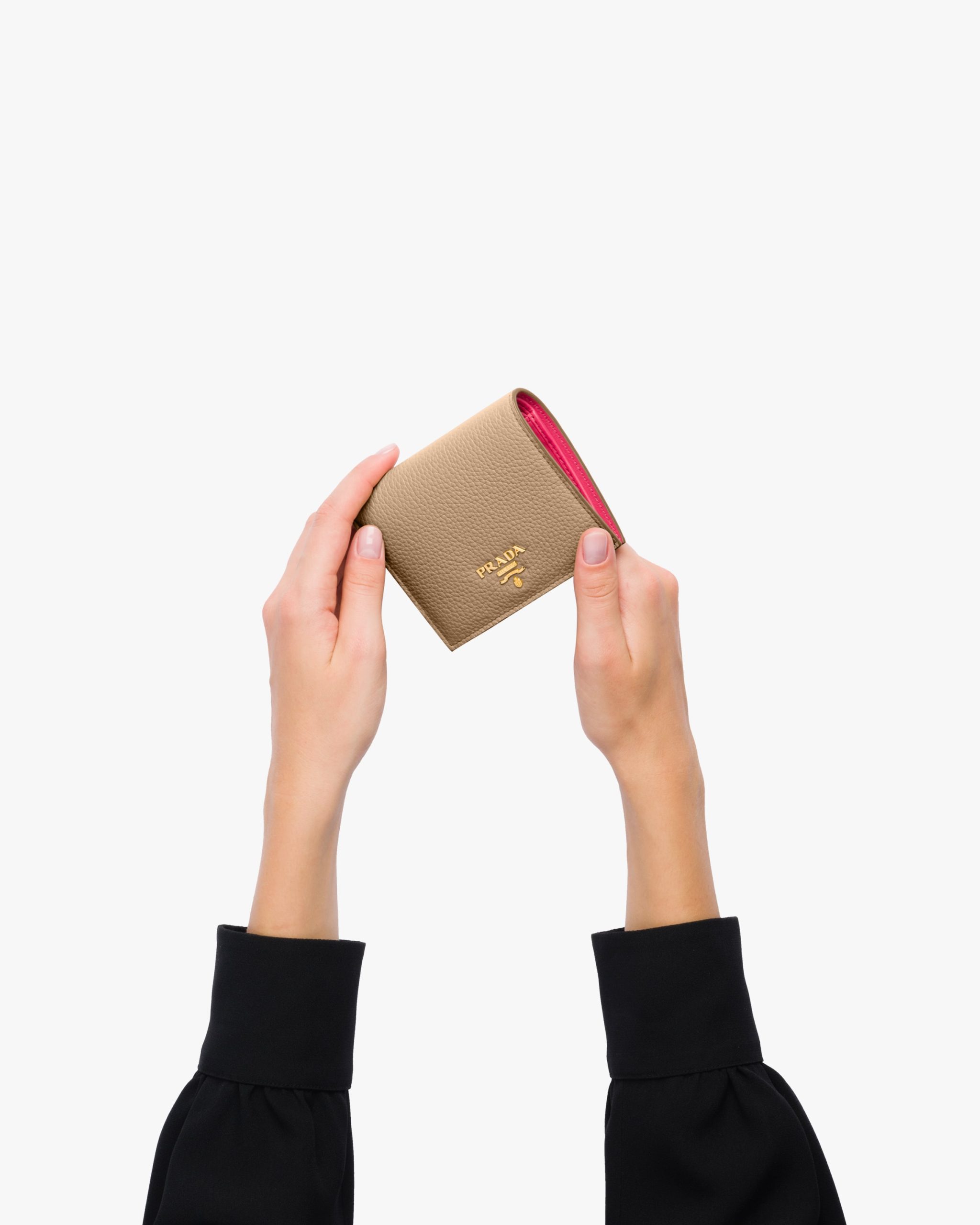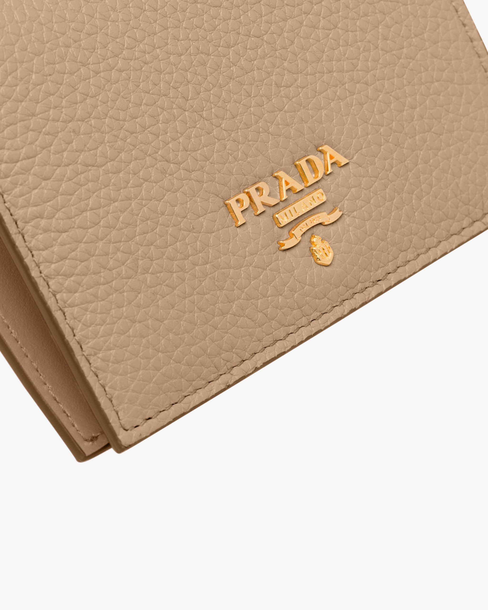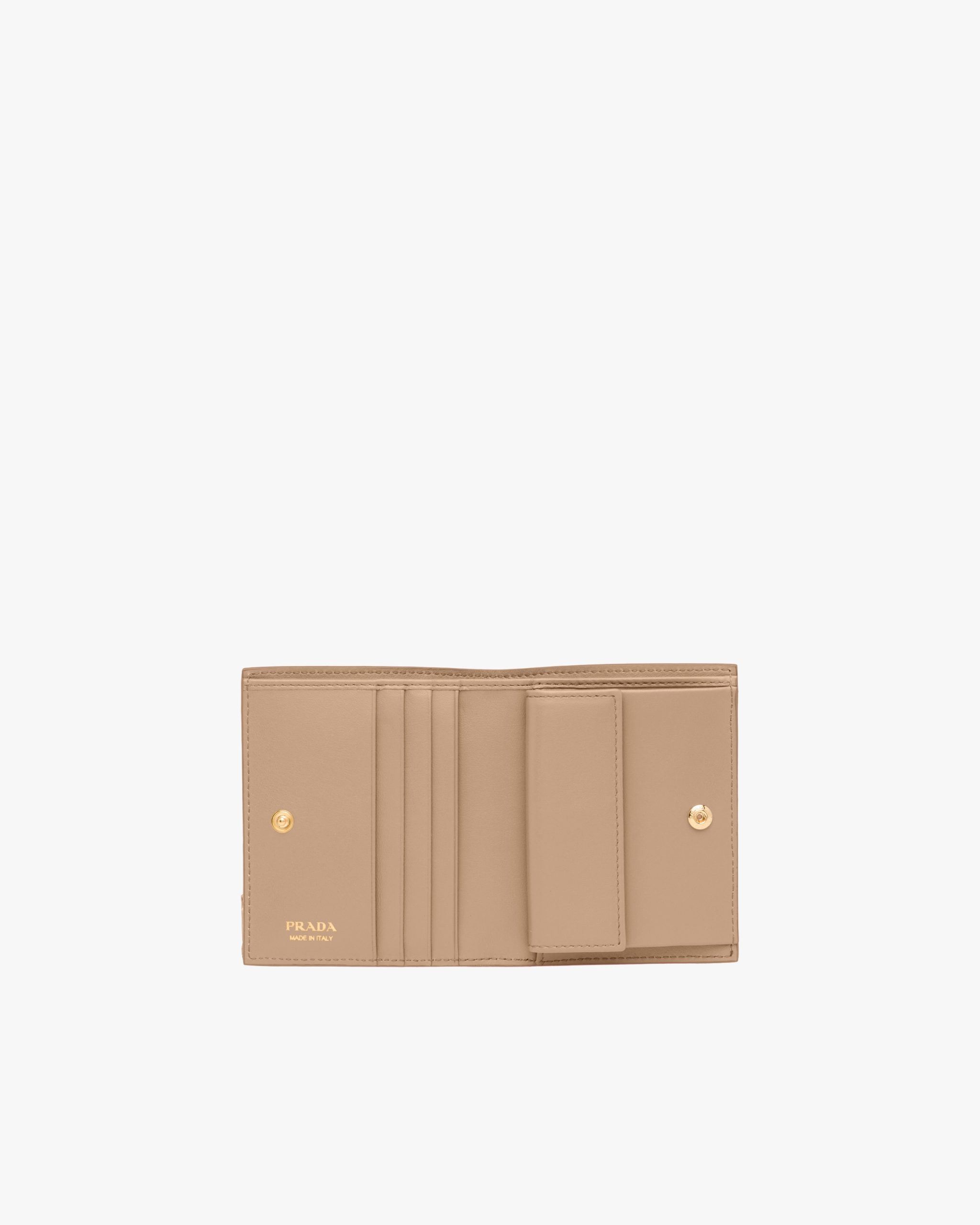 Lining in a contrasting color details this calf leather wallet. Adorned with gold-colored Prada lettering, it offers three card slots, one bill compartment and one coin compartment with a snap closure.