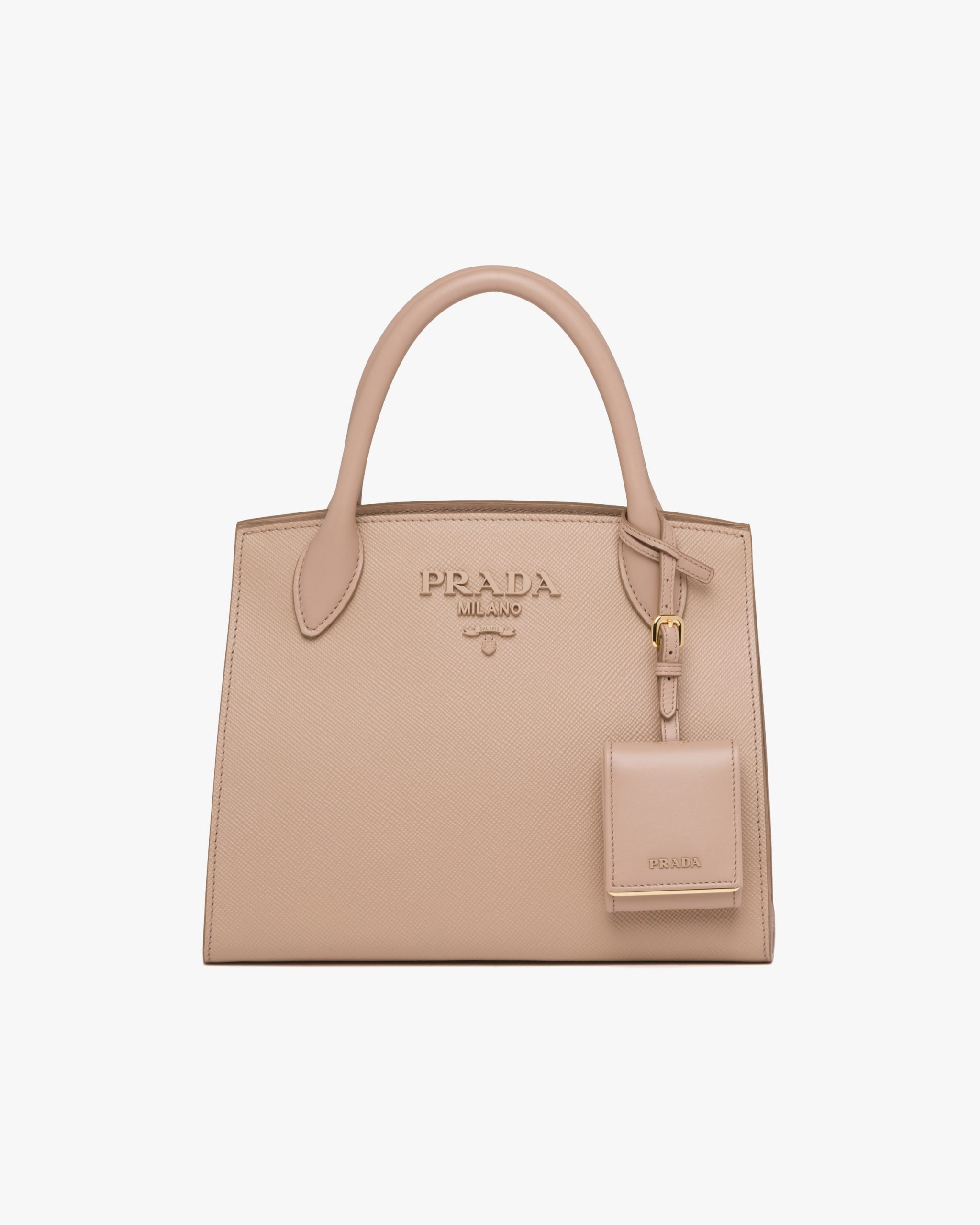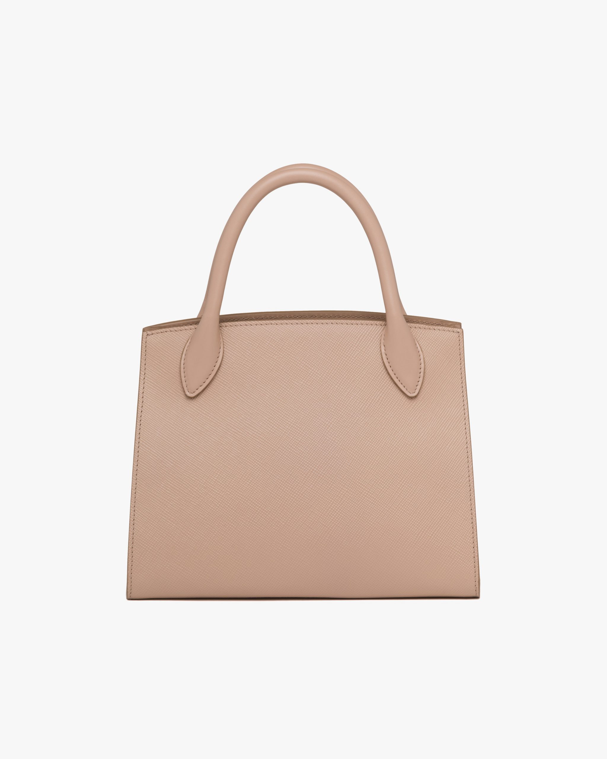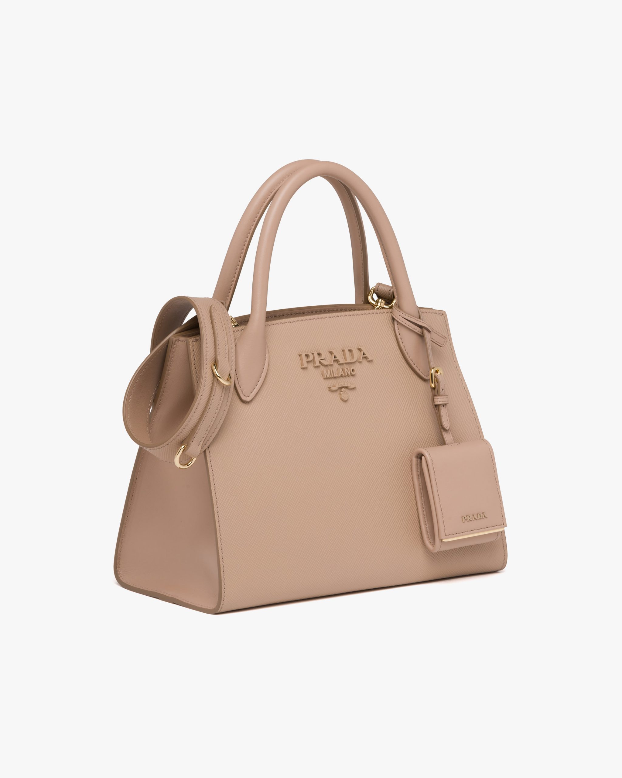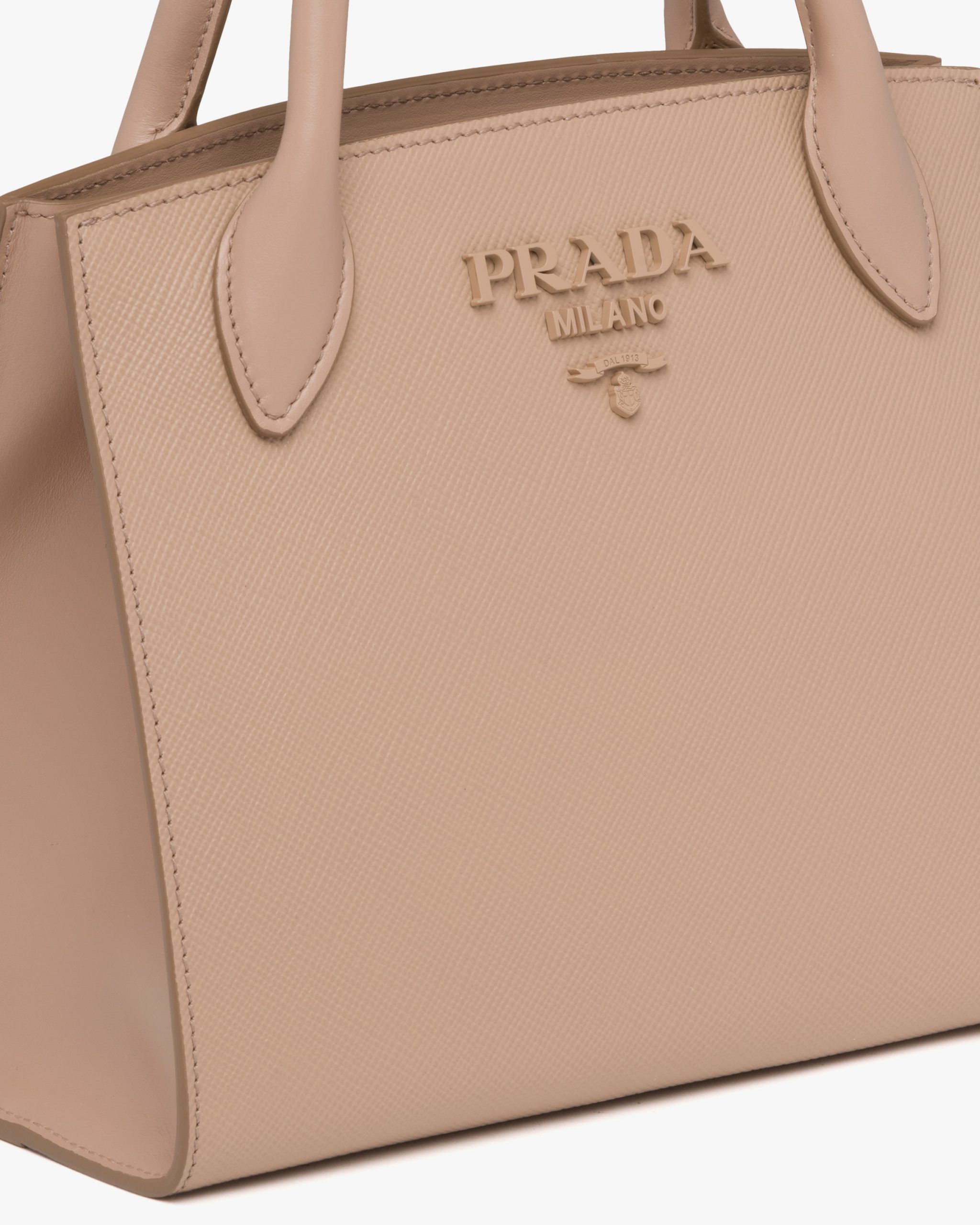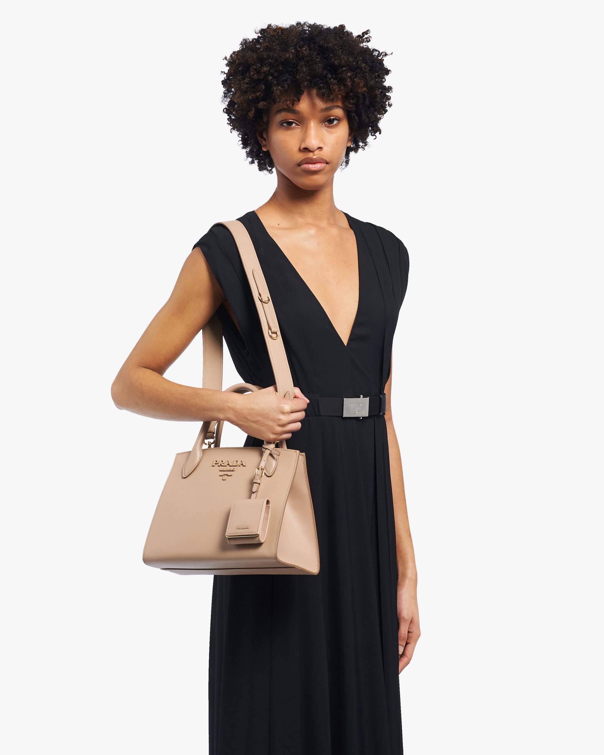 The refined front of the bag is completely monochrome. Made of fine Saffiano leather, it is characterized by the distinctive tone-on-tone effect of the metal lettering logo2.