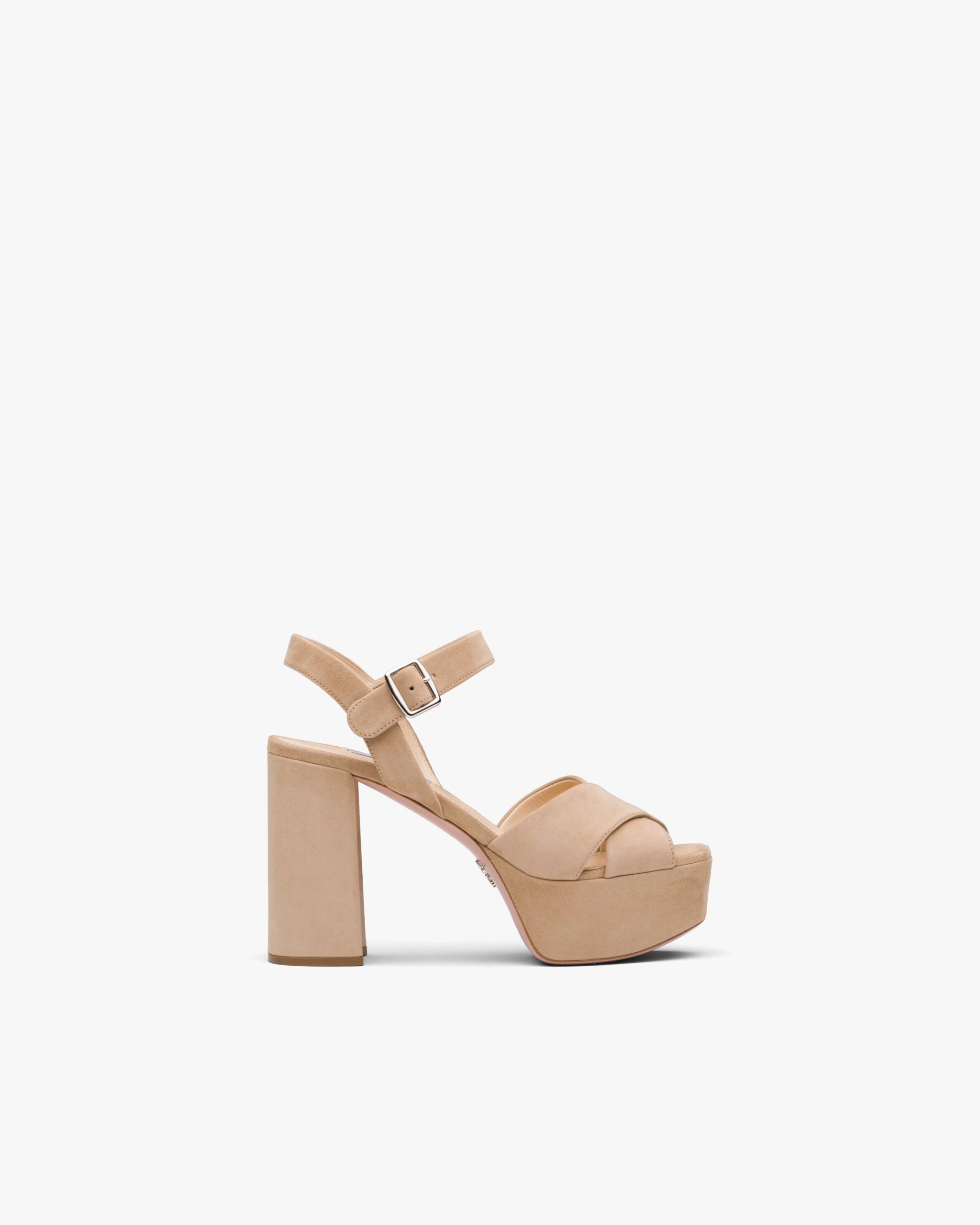 These suede sandals with high column heel are characterized by the double crisscross band on the front. The strap with metal buckle completes the design.