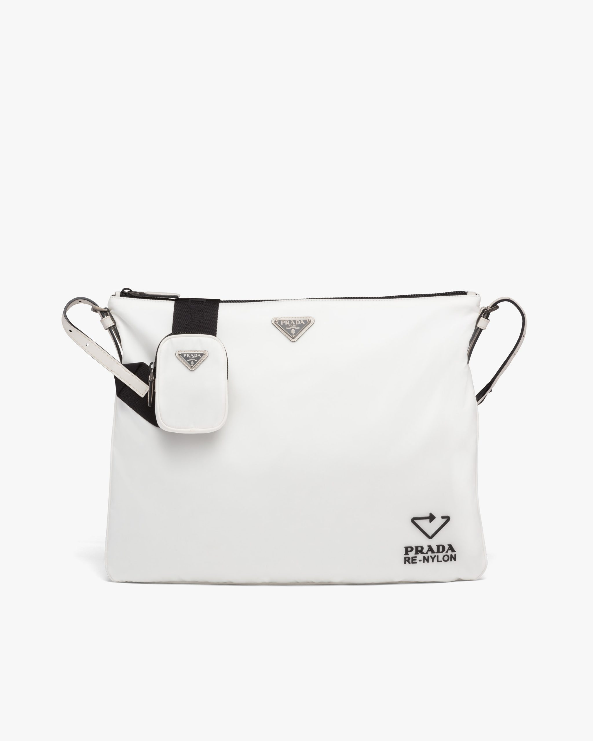 A slim silhouette distinguishes this shoulder bag made of Re-Nylon fabric accented by fine Saffiano leather details. The accessory with zipper closure and inside pocket has a detachable woven nylon and leather shoulder strap.
